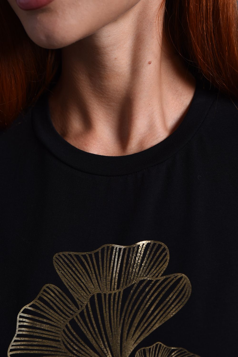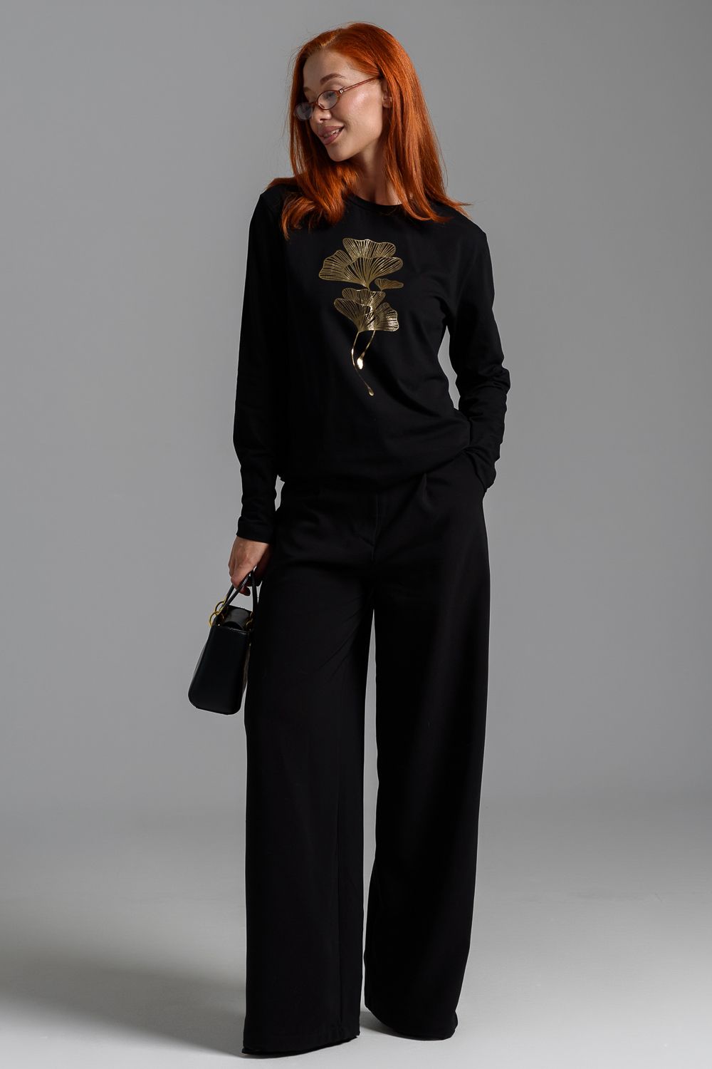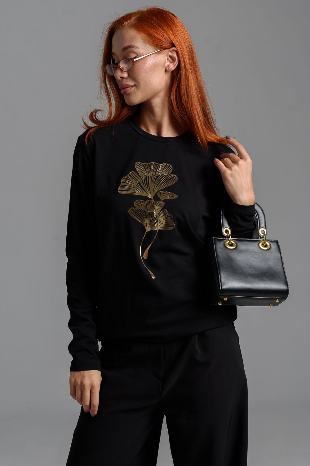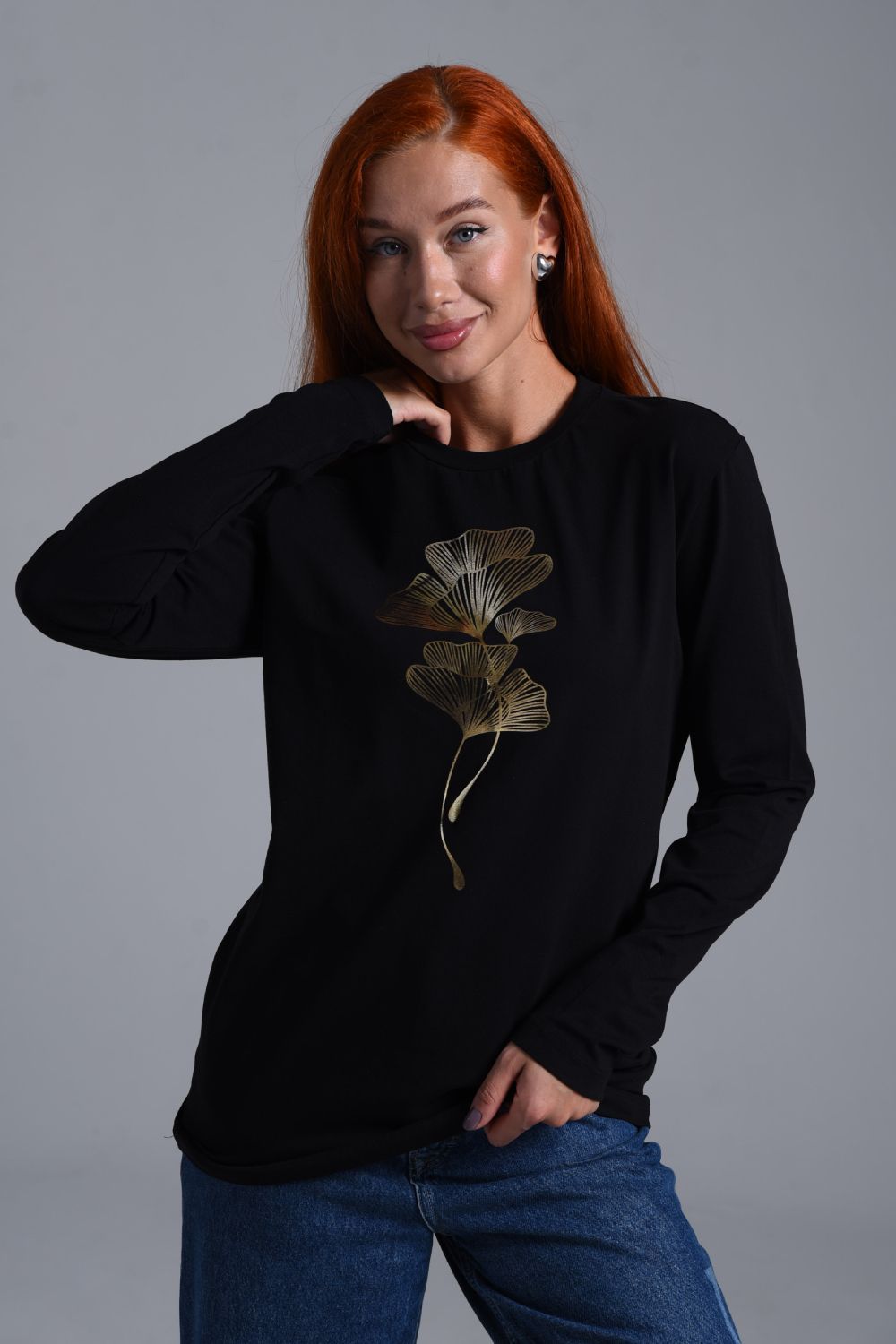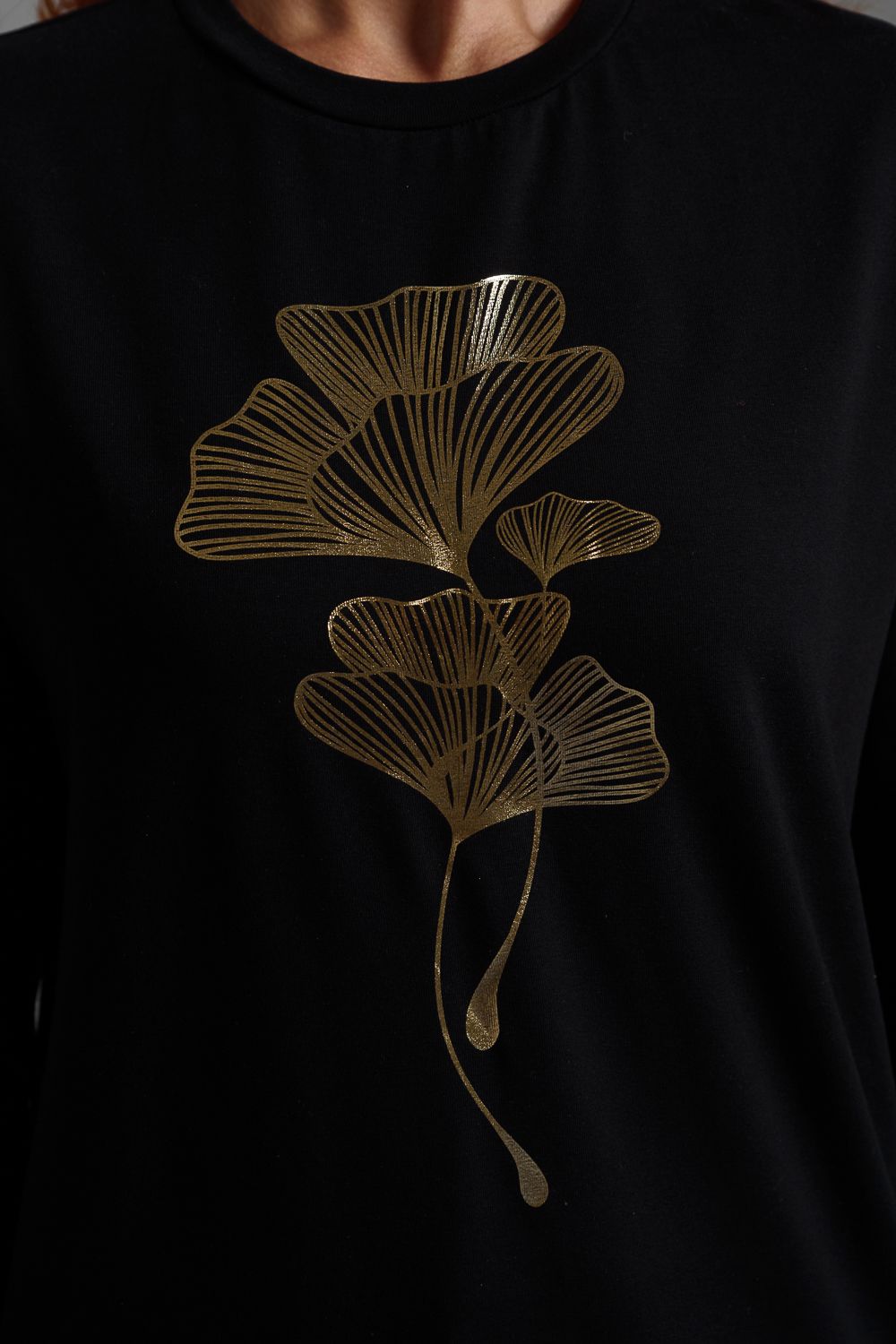8519/1 Футболка с длинным рукавом женская - черный+листья