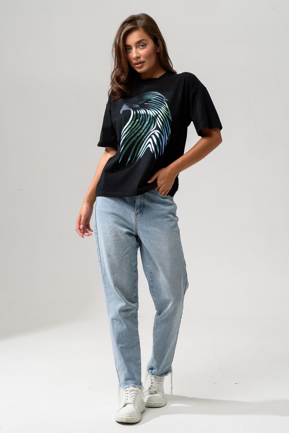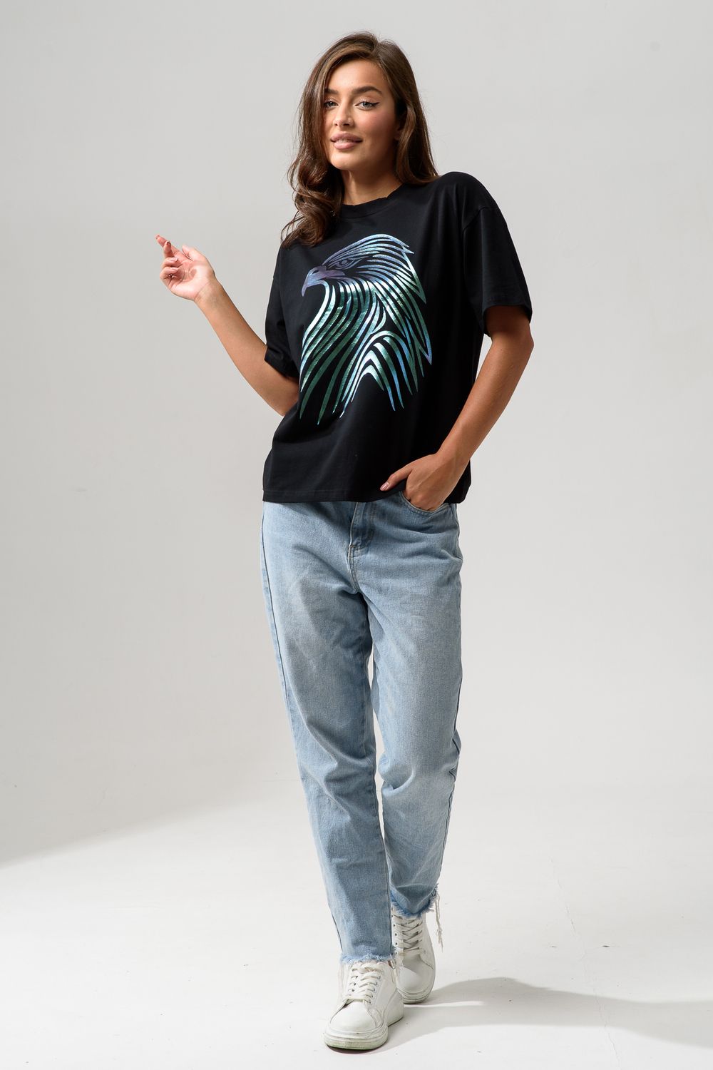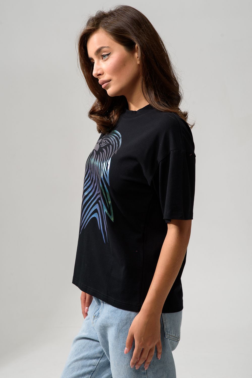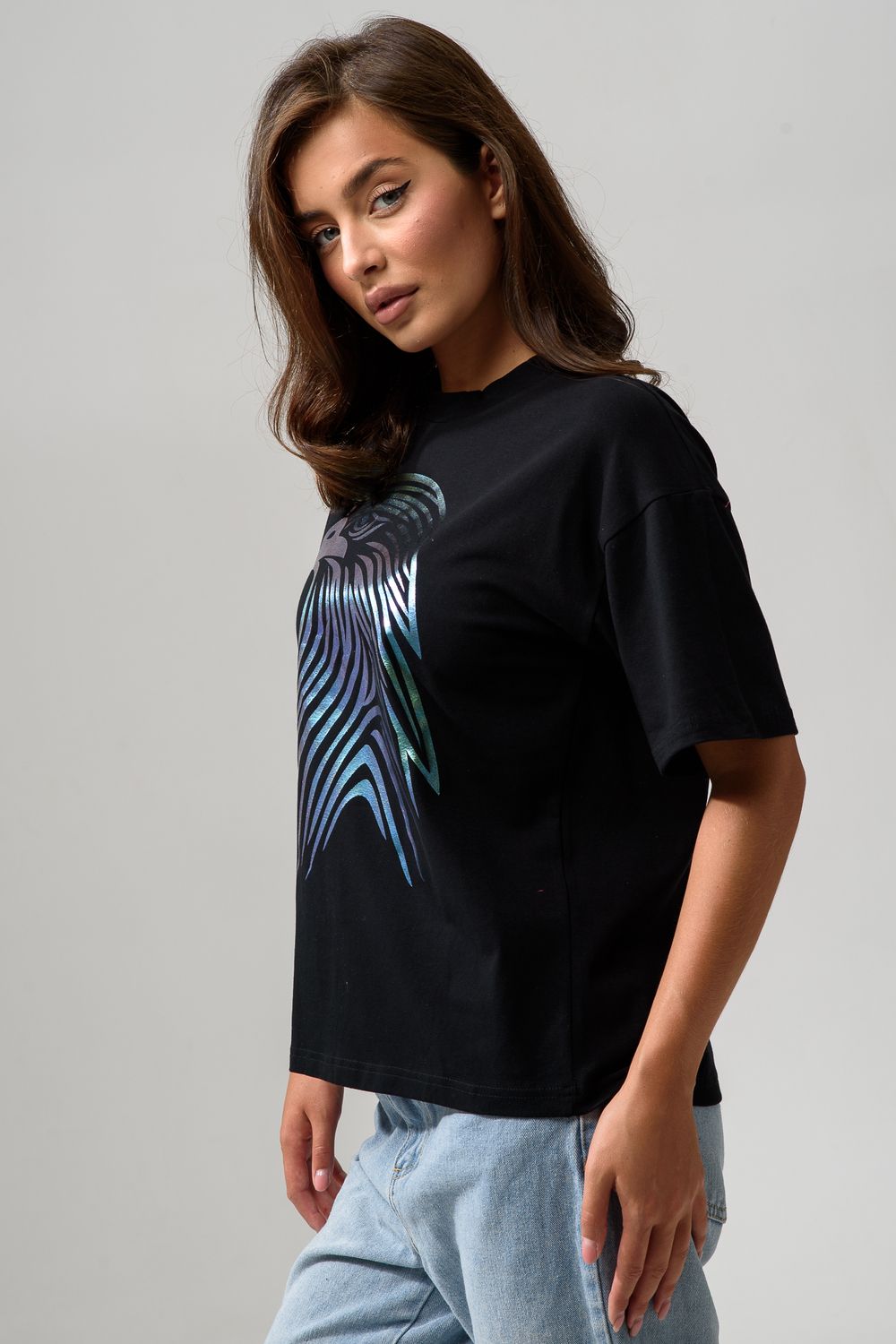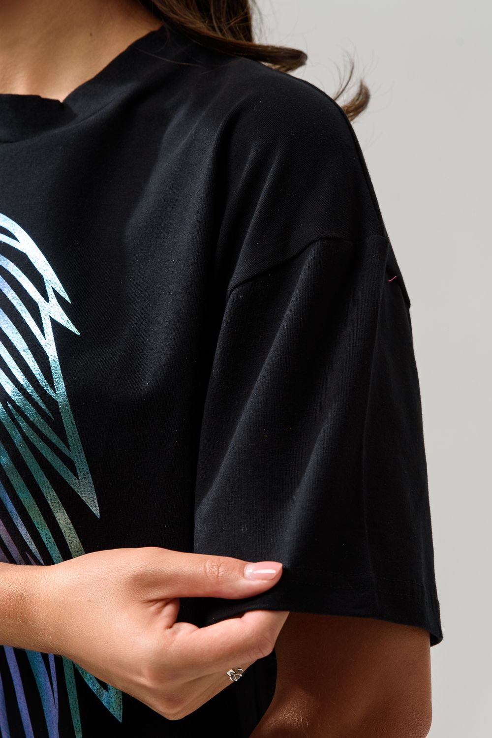 Женская футболка оверсайз — это идеальный выбор для девушек, которые любят сочетать комфорт и стиль. Стильная и качественная, она доступна в любом размере, включая большой до 56. Свободный крой подойдет в том числе и для беременных женщин. Высокие стандарты качества делают её универсальным элементом гардероба, подходящим для создания модных повседневных образов. Она идеальна для взрослых и подростков, предпочитающих спортивную и яркая одежду. Высокая плотность ткани 200гр/куб.м. Принт фольга "хамелеон" или "серебро" - может попасться без выбора.