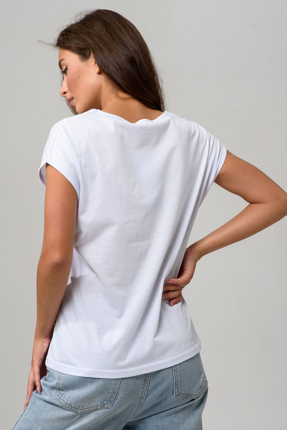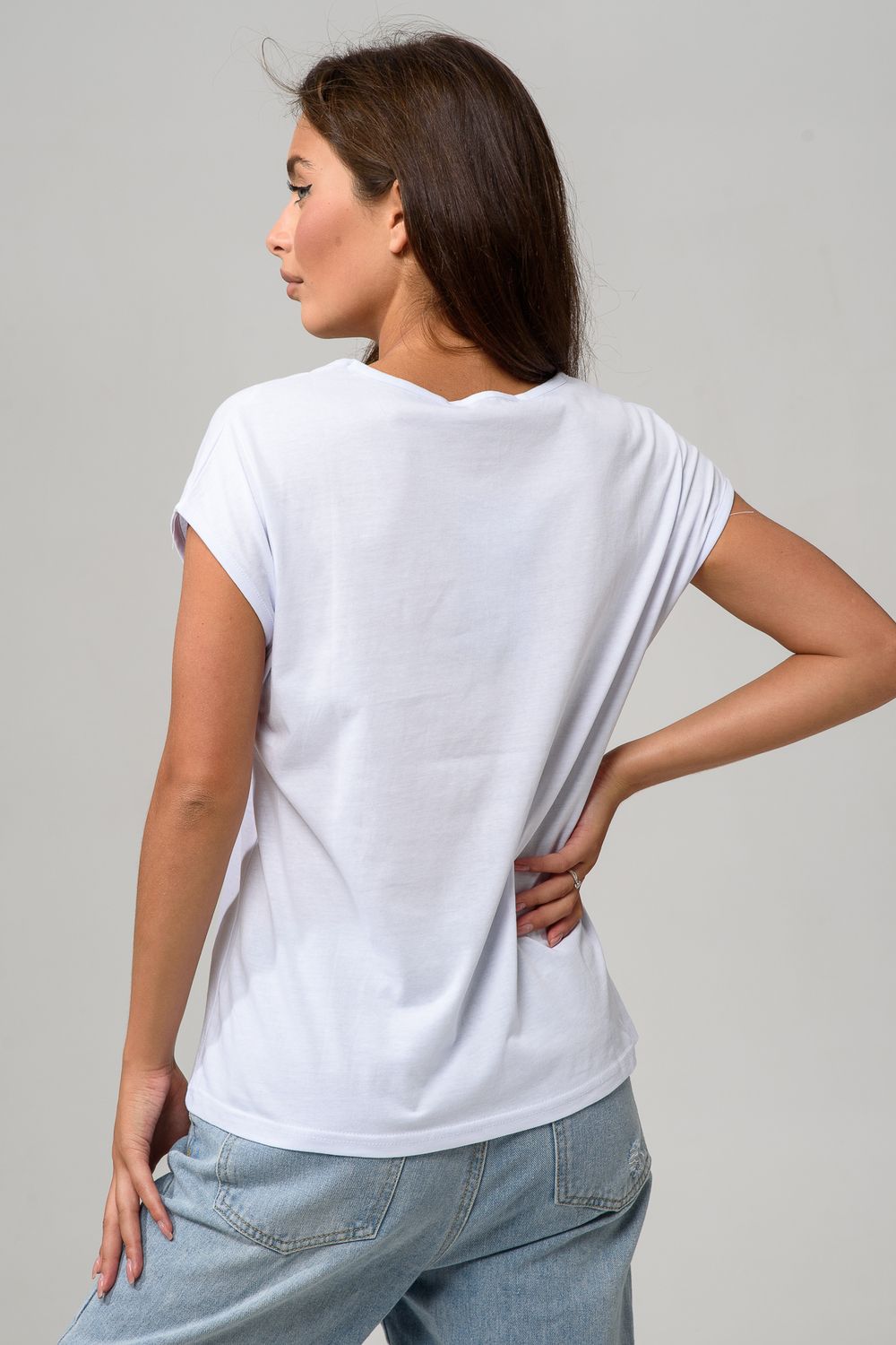 Футболка полуприлегающего силуэта, средней длины, с V-образной горловиной. Рукав цельнокроеный, короткий. Горловина и пройма обработаны бейкой из основного полотна.