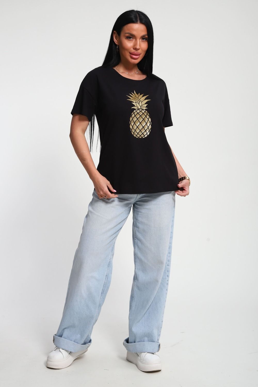 Футболка женская из гладкокрашенного трикотажа, хлопок 100%. Прямого силуэта, свободного облегания. горловина круглой формы. Рукав короткий. Низ изделия прямой. На полочке блестящий принт, шелкография.