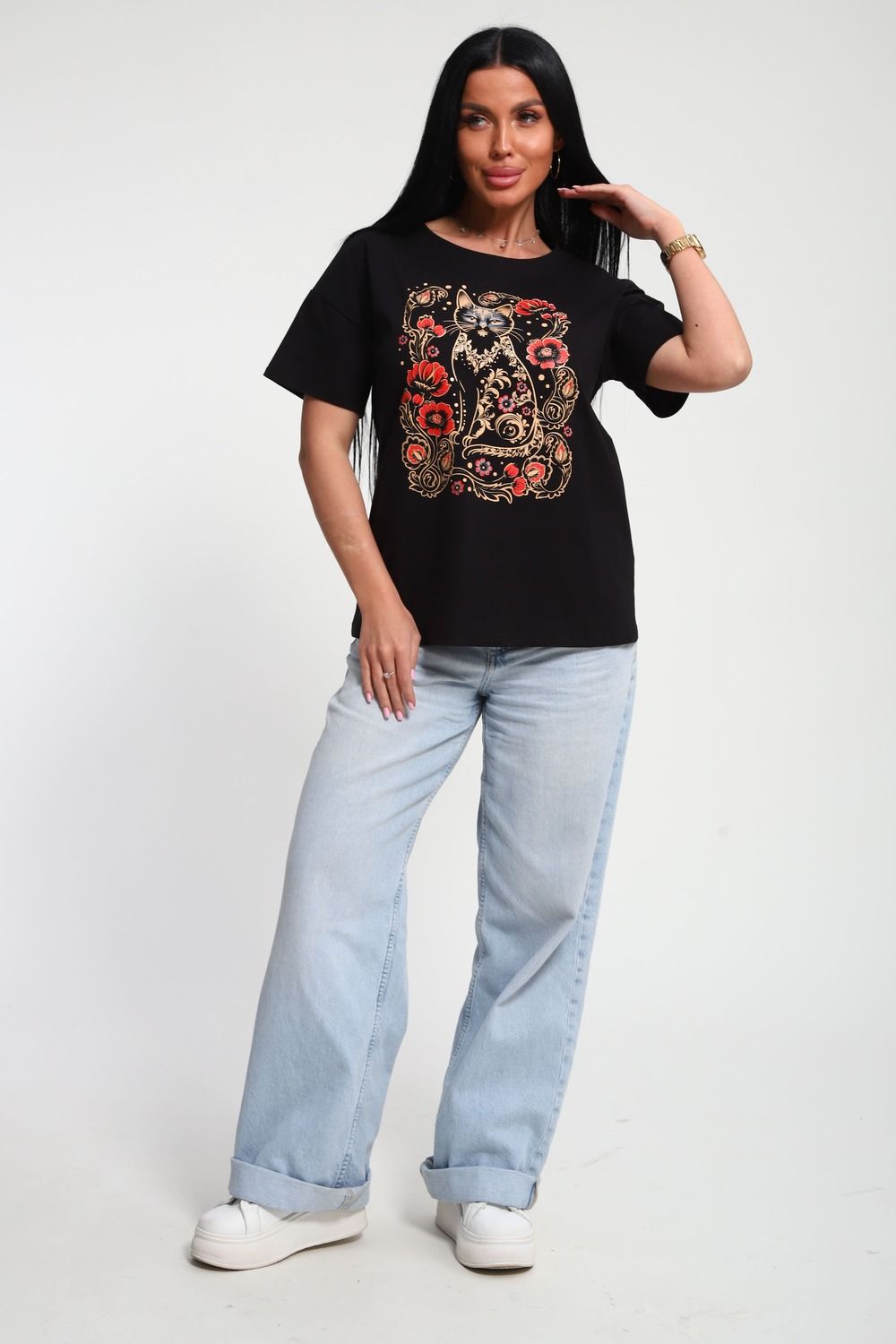 Футболка женская из гладкокрашенного трикотажа, хлопок 100%. Прямого силуэта, свободного облегания. горловина круглой формы. Рукав короткий. Низ изделия прямой. На полочке принт, шелкография.