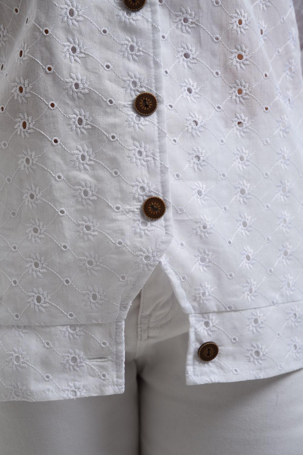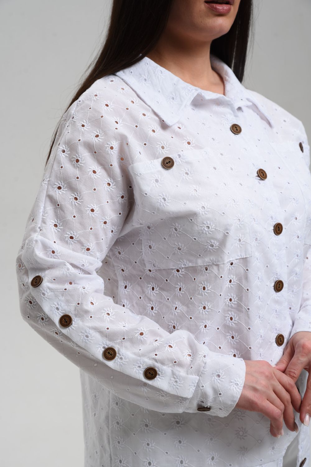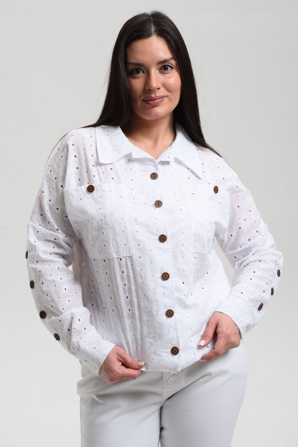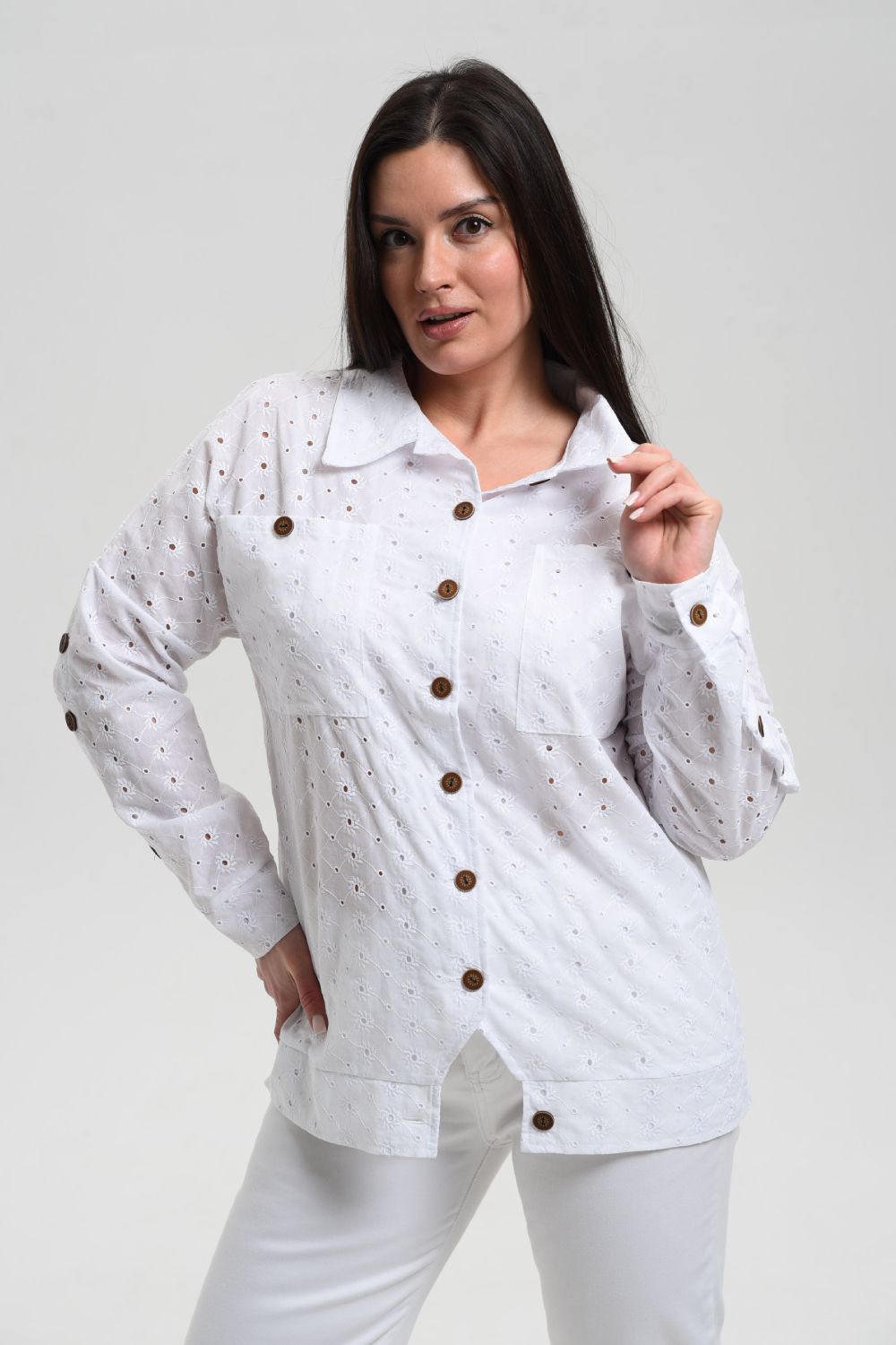 Рубашка женская, прямого силуэта, с притачным декоративным поясом внизу, воротник втачной. Рукав с заниженной линией плеча, с манжетой. Застежка на петли - пуговицы. На полочке два накладных кармана. Вдоль рукава складка с пуговицами. В летний период рубашка из красивой, натуральной х/б ткани незаменимая составляющая гардероба каждой модницы.