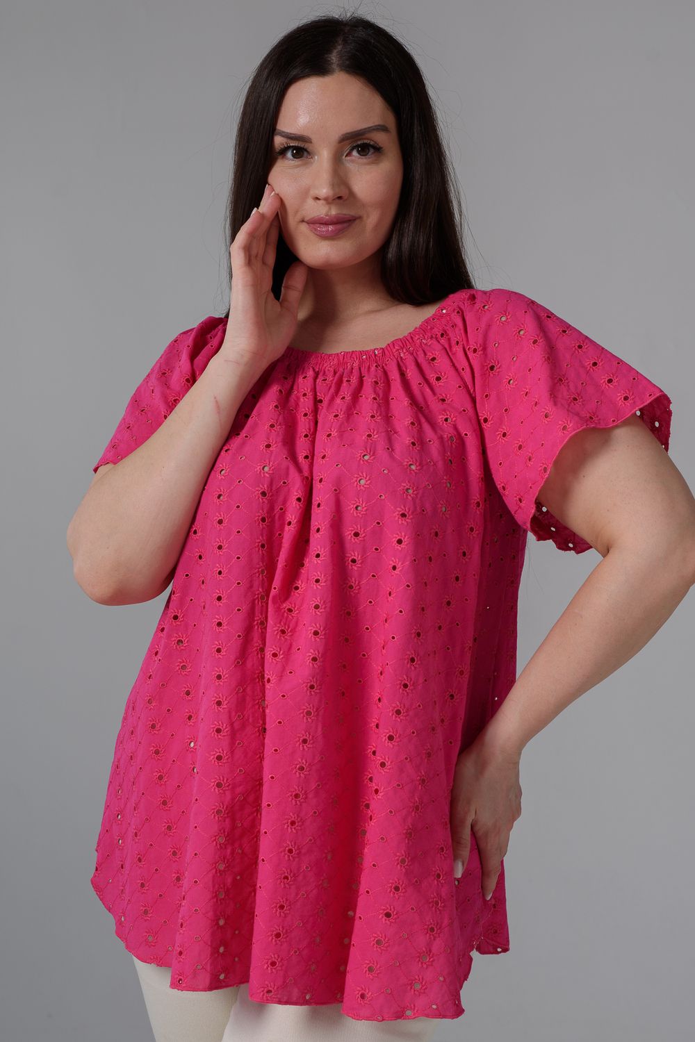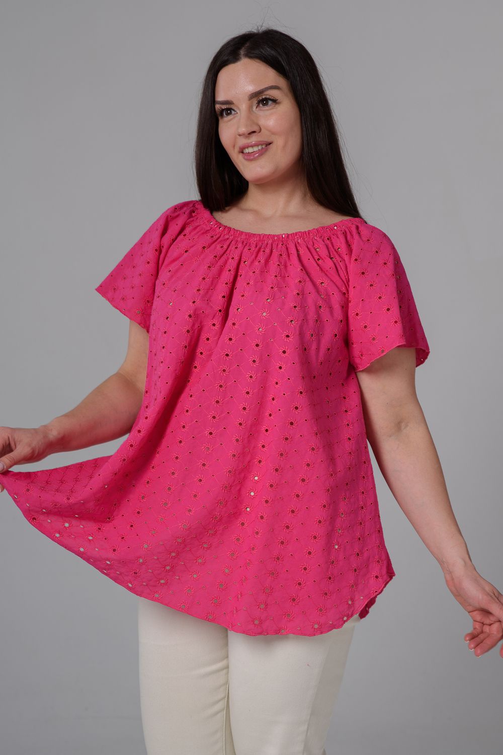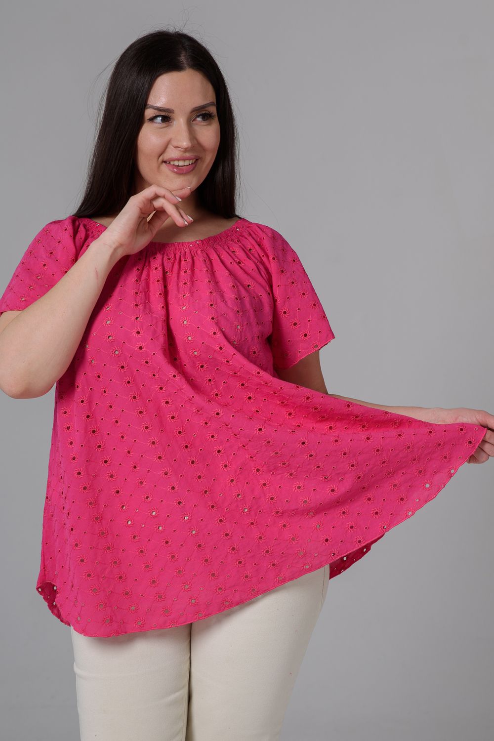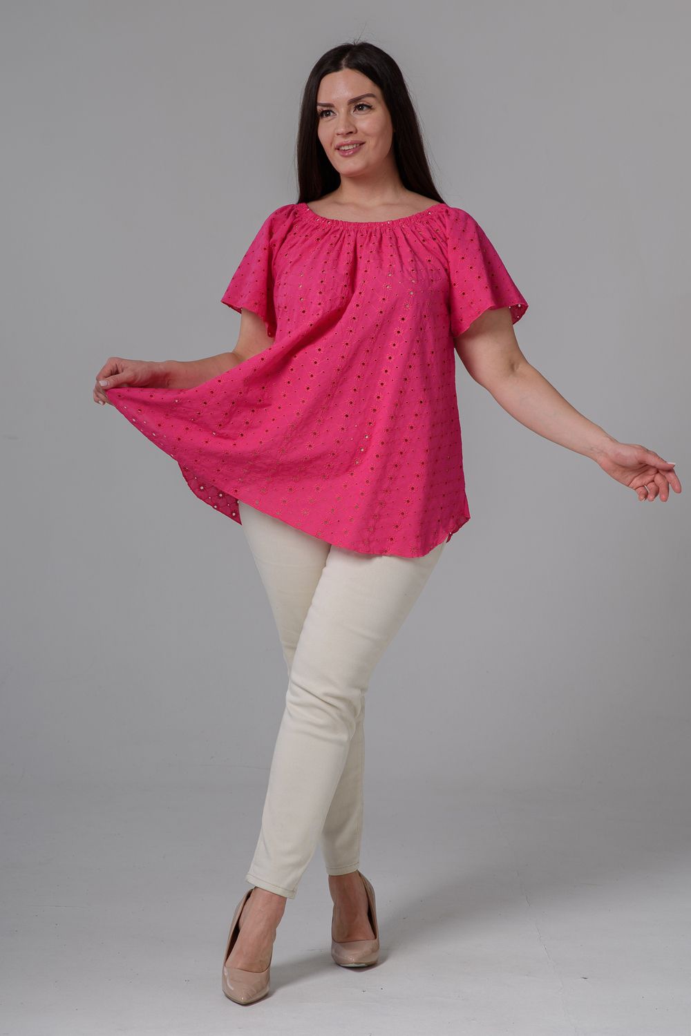 Туника женская, силуэт трапеция. Рукав реглан, короткий. Горловина собрана на эластичную тесьму. Низ туники фигурный. В лекалах учтена незначительная усадка ткани после стирки.