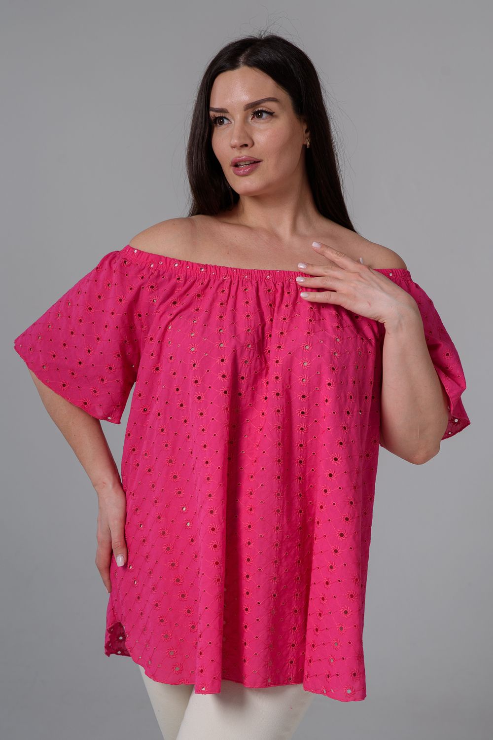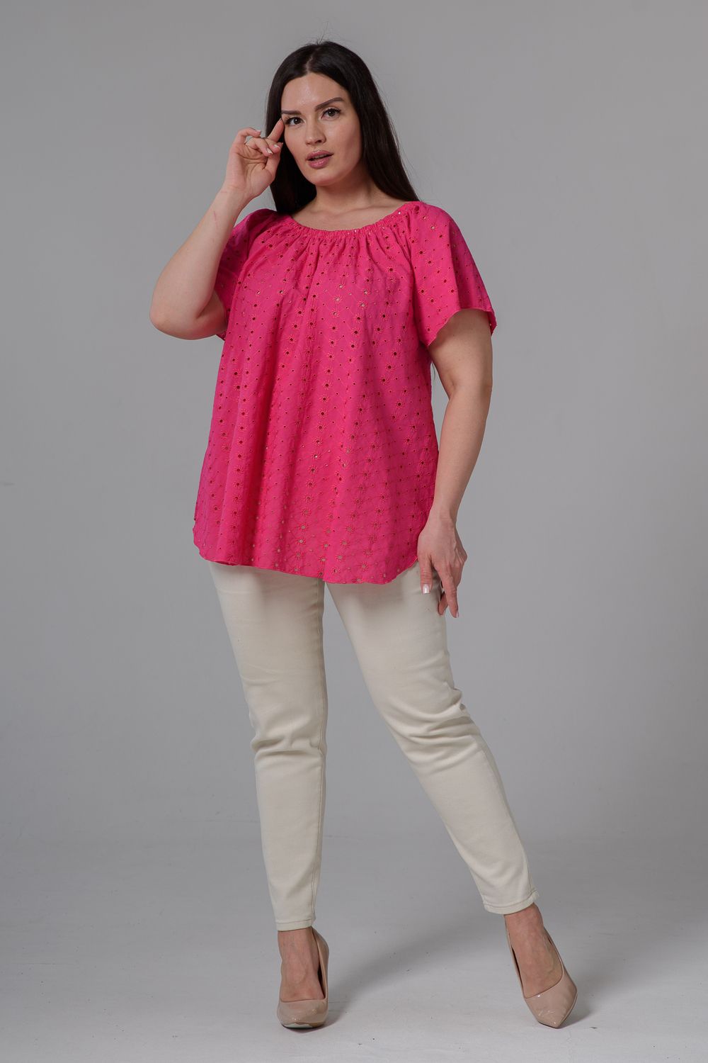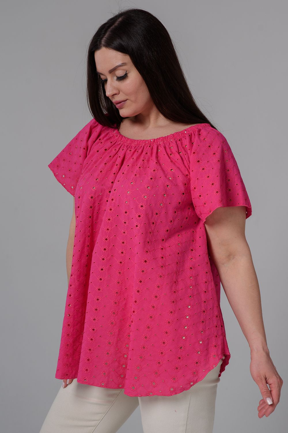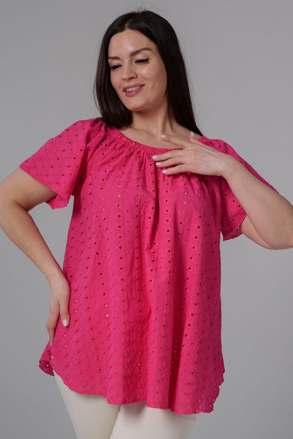 Туника женская, силуэт трапеция. Рукав реглан, короткий. Горловина собрана на эластичную тесьму. Низ туники фигурный. В лекалах учтена незначительная усадка ткани после стирки.