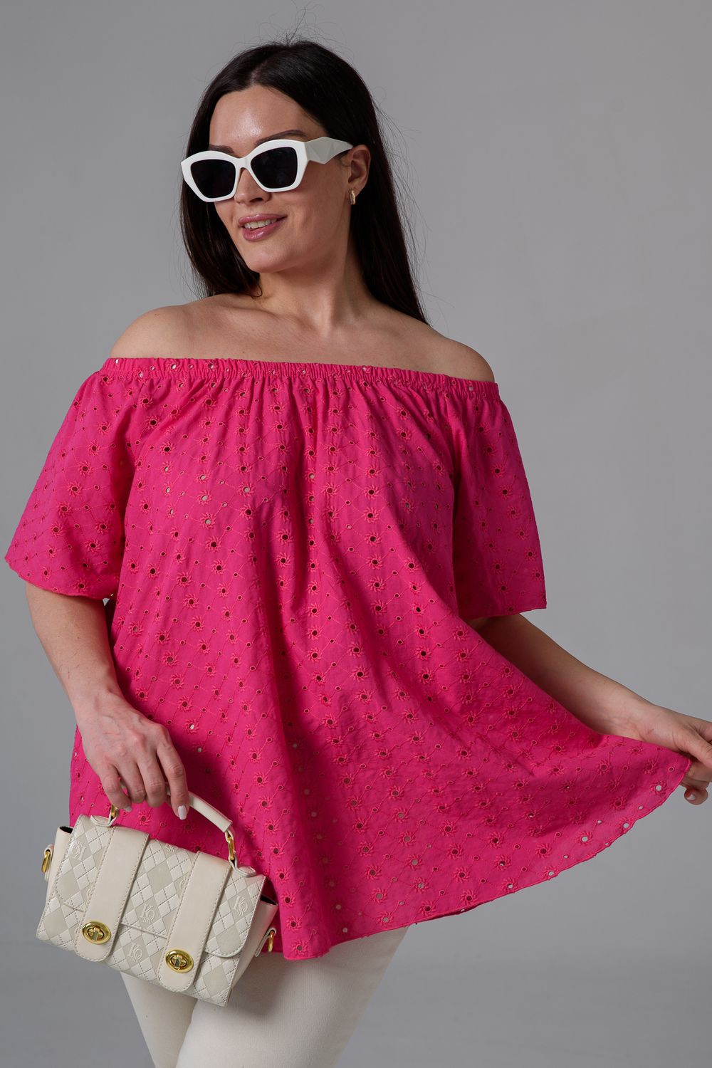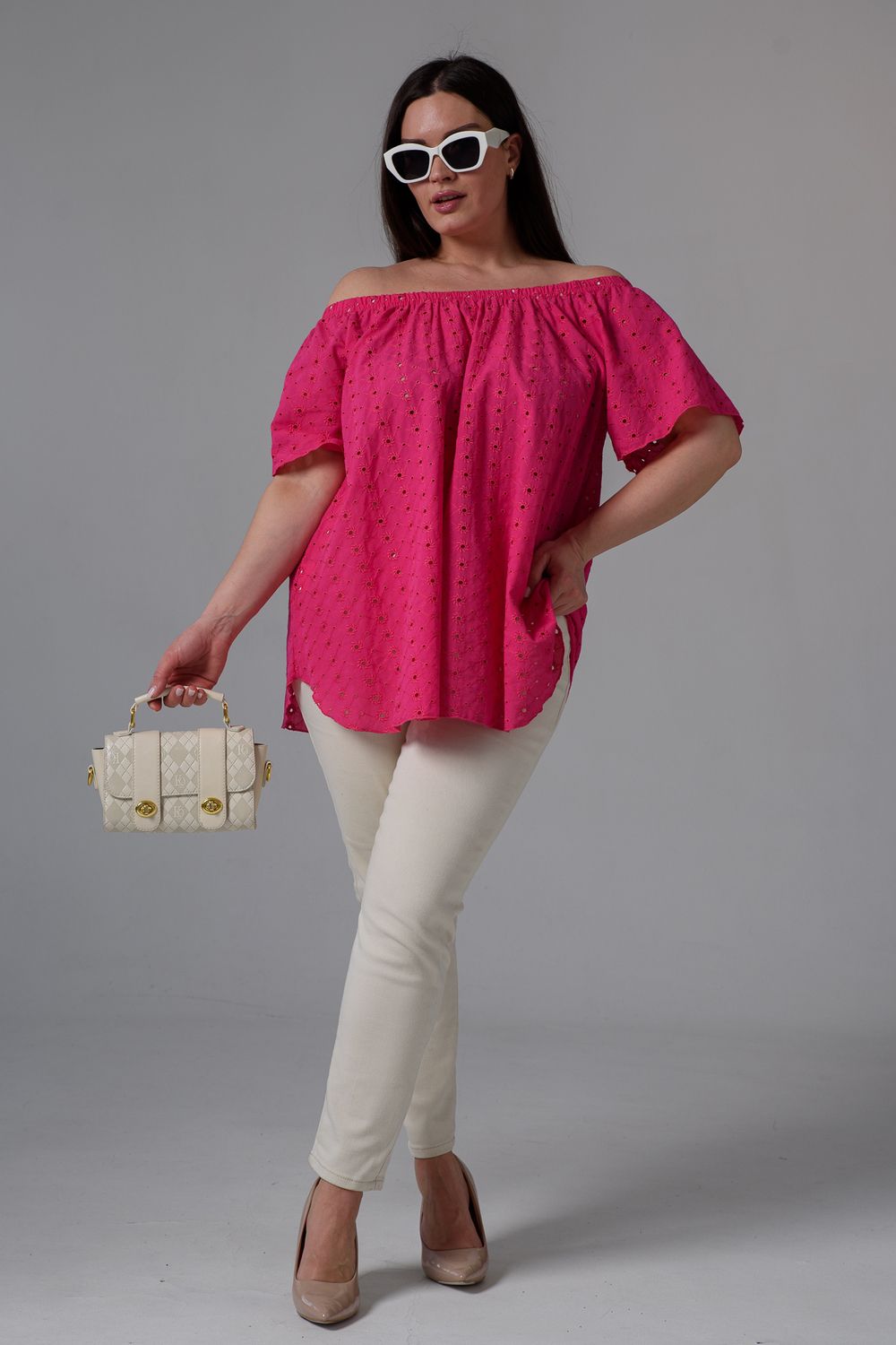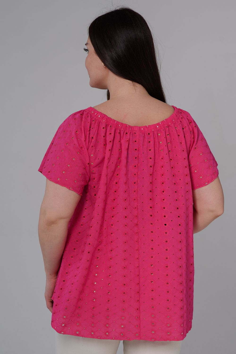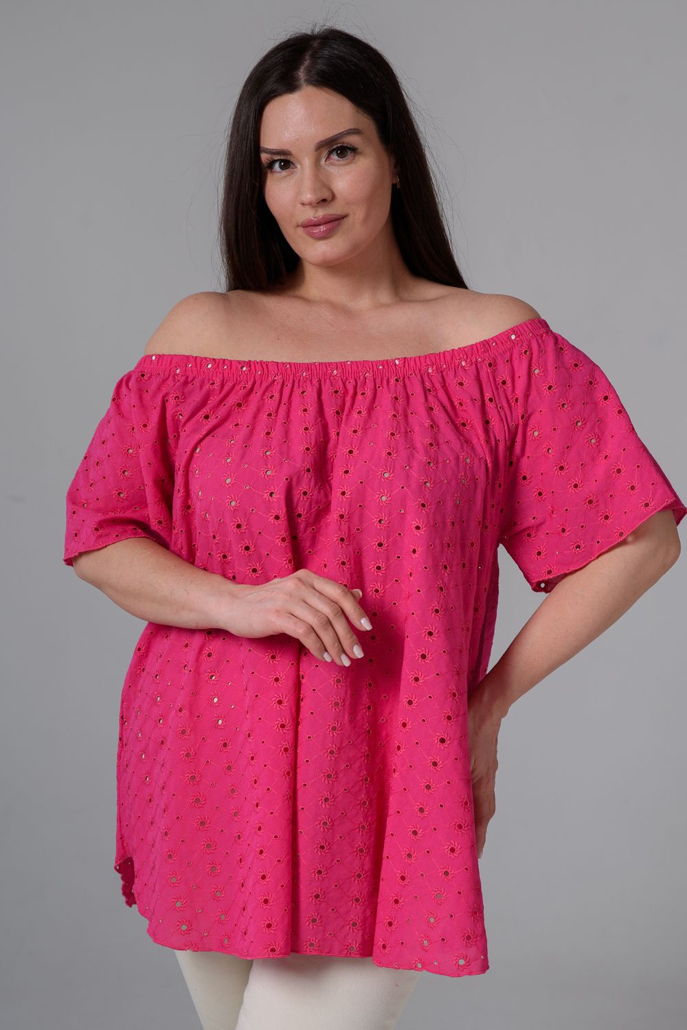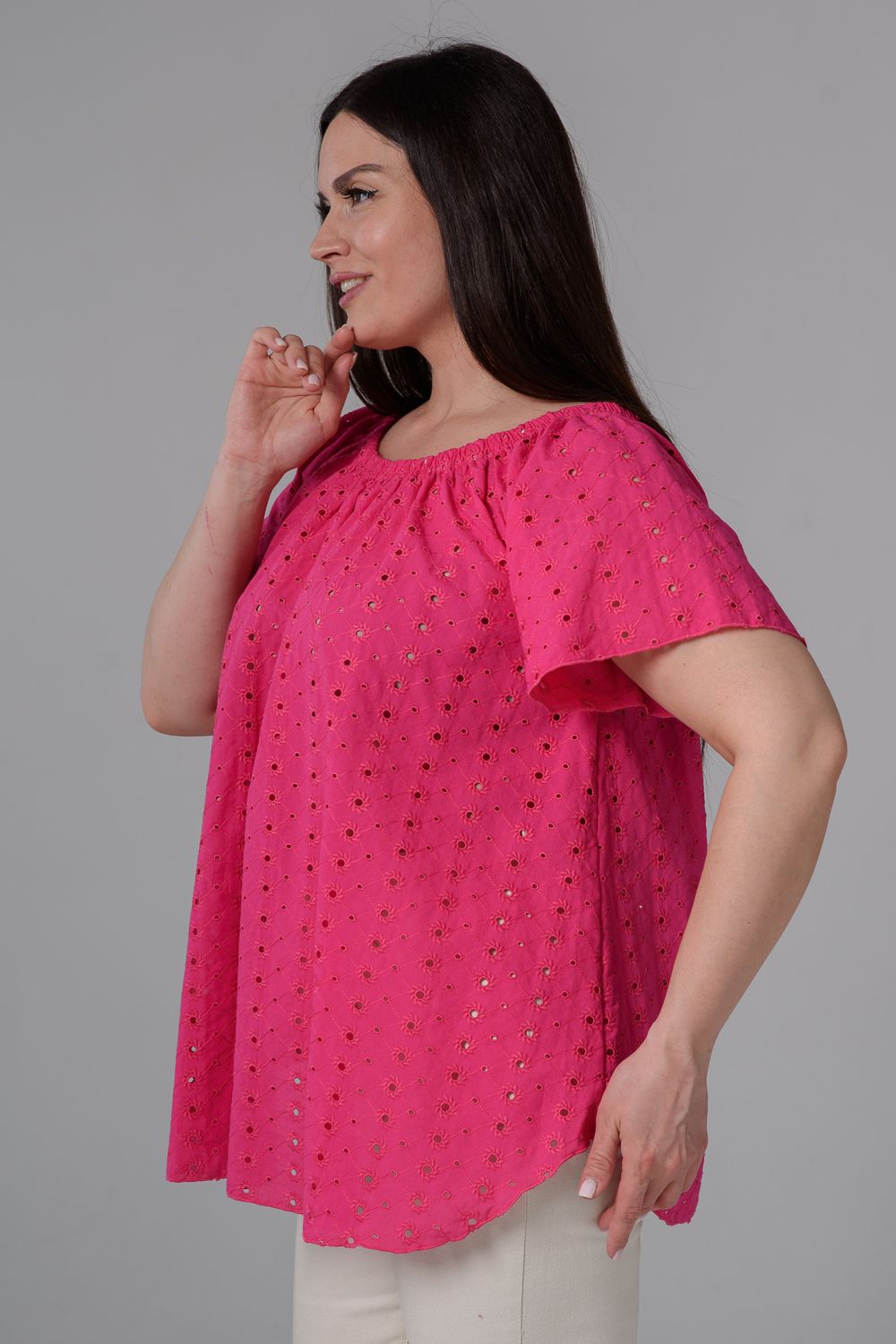 Туника женская, силуэт трапеция. Рукав реглан, короткий. Горловина собрана на эластичную тесьму. Низ туники фигурный. В лекалах учтена незначительная усадка ткани после стирки.