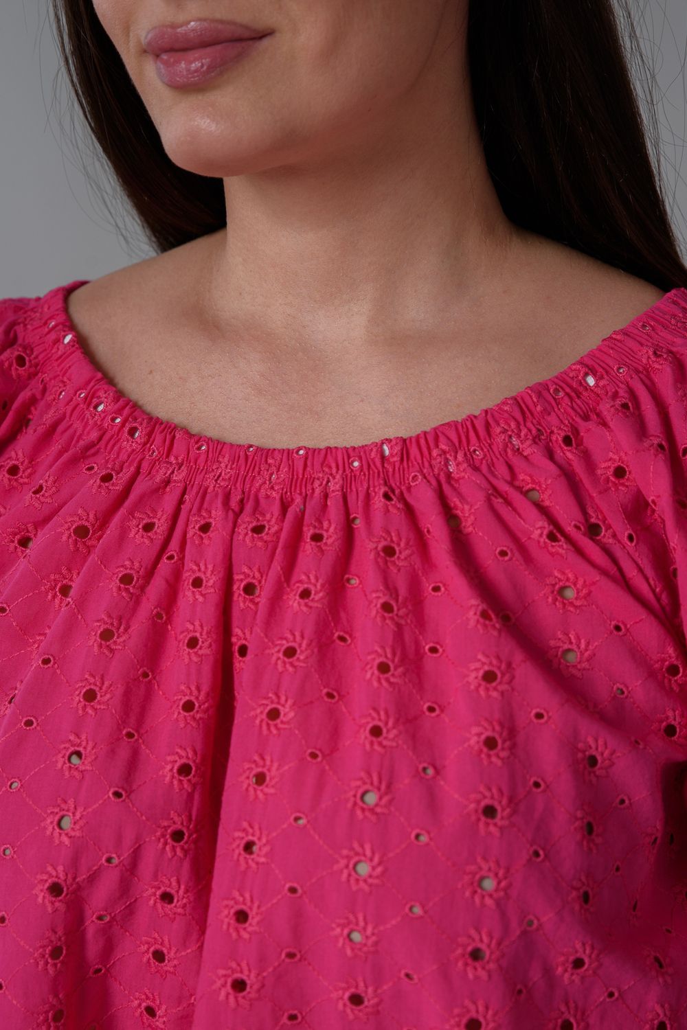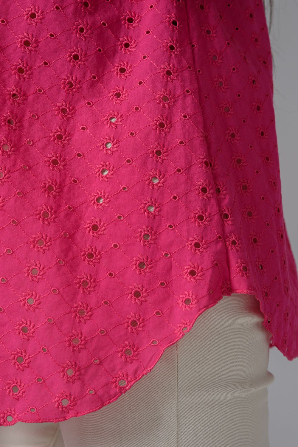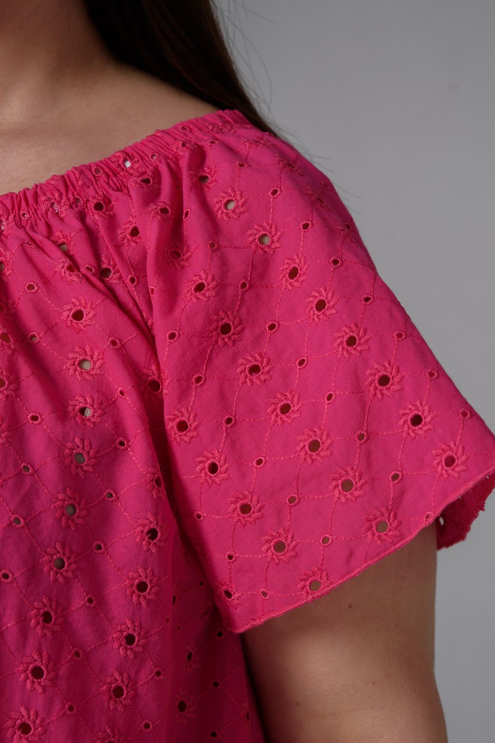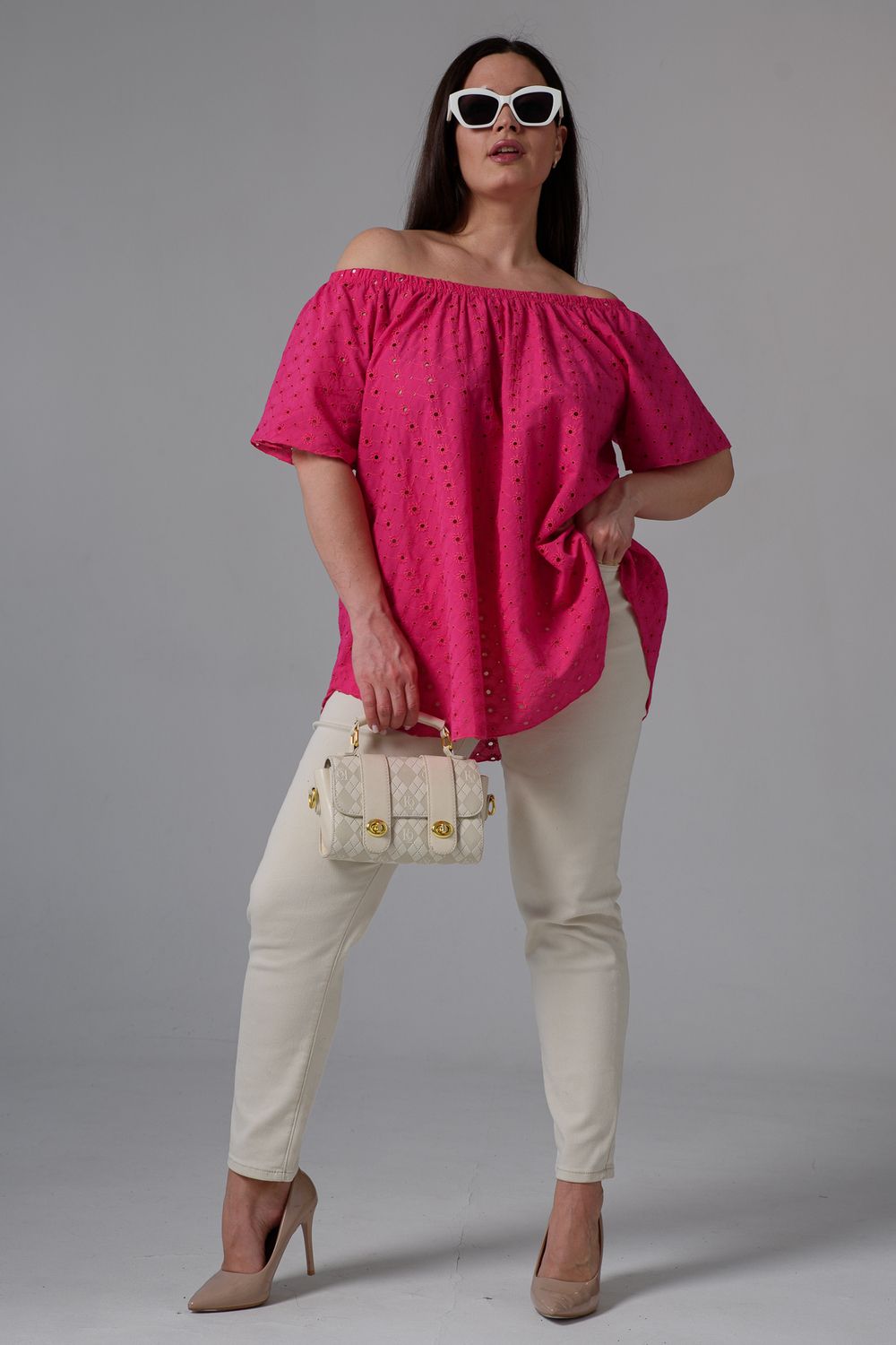 Туника женская, силуэт трапеция. Рукав реглан, короткий. Горловина собрана на эластичную тесьму. Низ туники фигурный. В лекалах учтена незначительная усадка ткани после стирки.