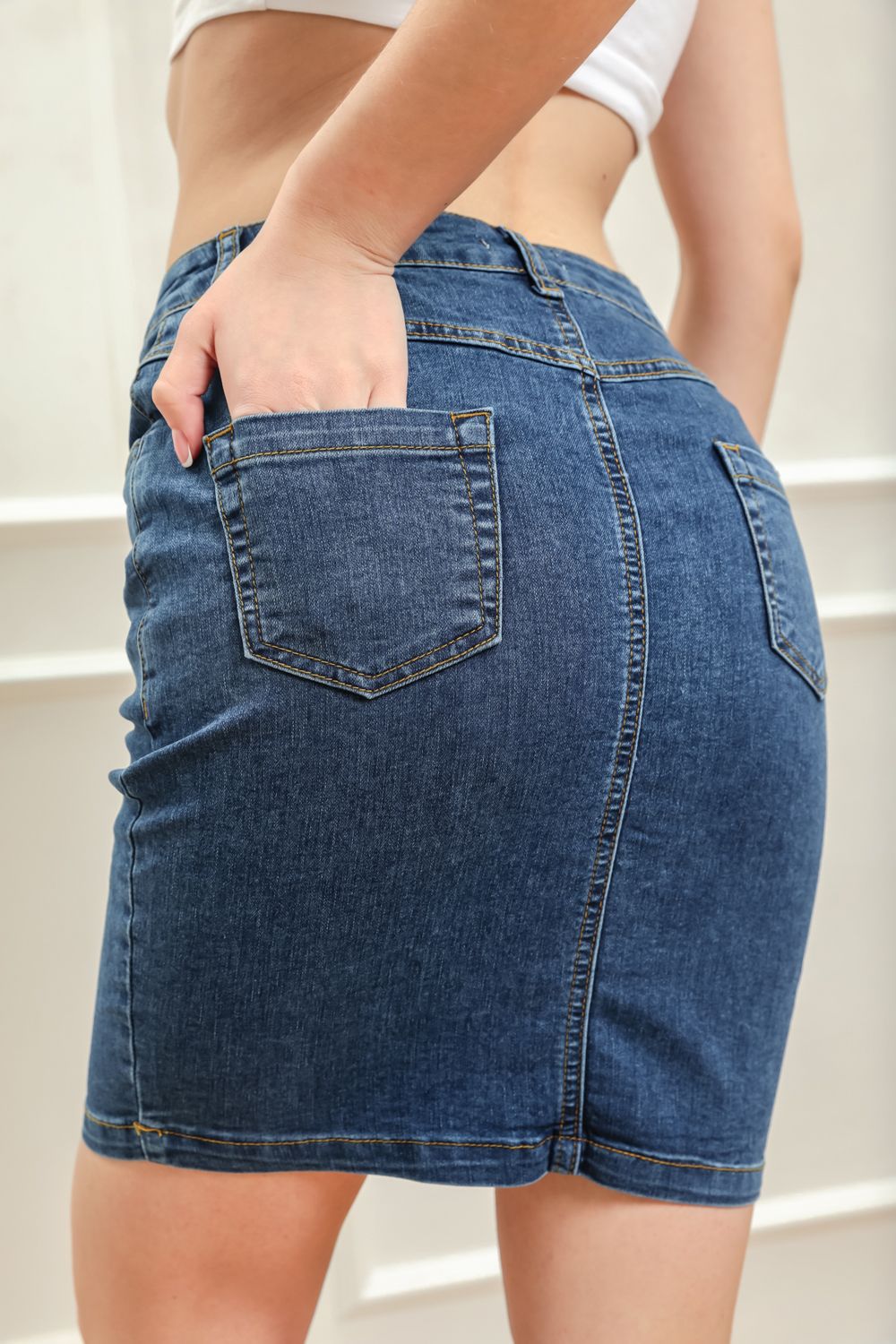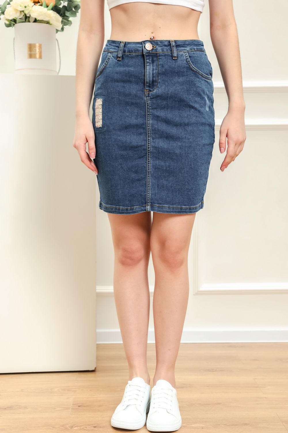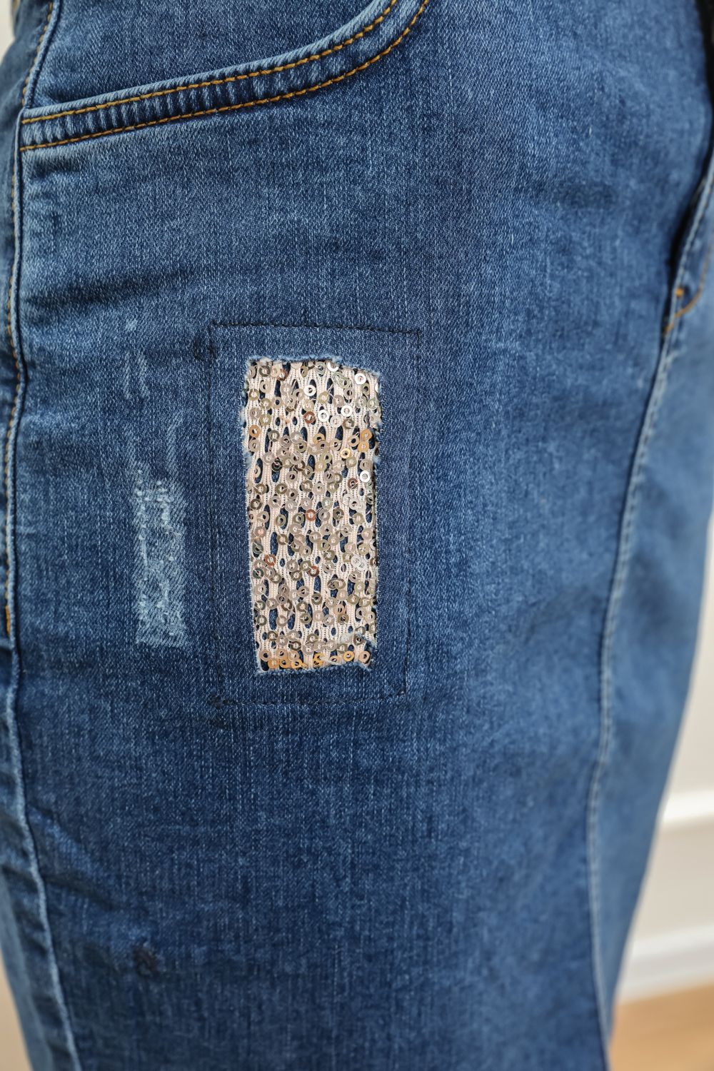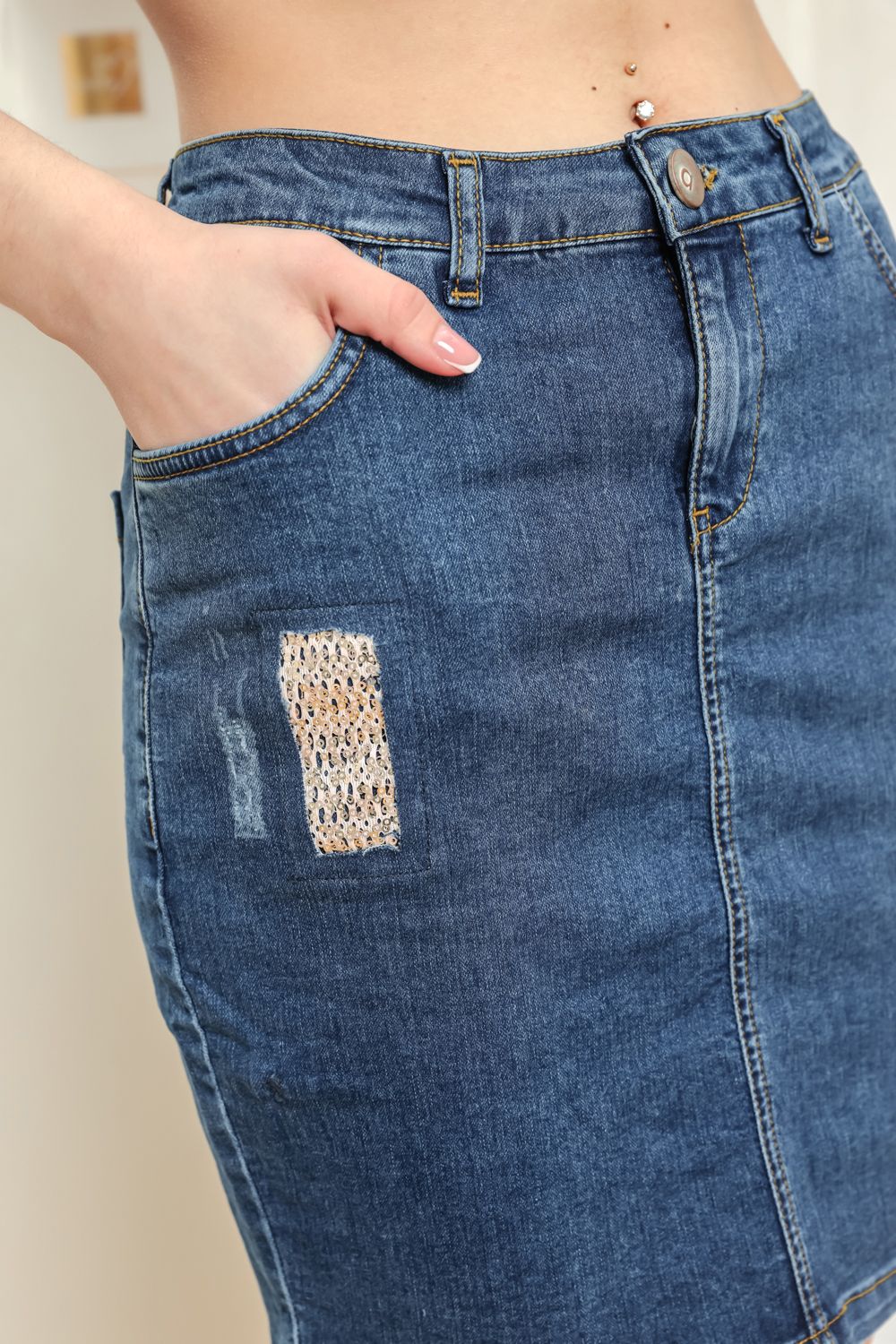 Женская юбка выполнена из джинсовой хлопковой ткани с добавлением полиэстера. Сбоку юбки отделка из пайеток.