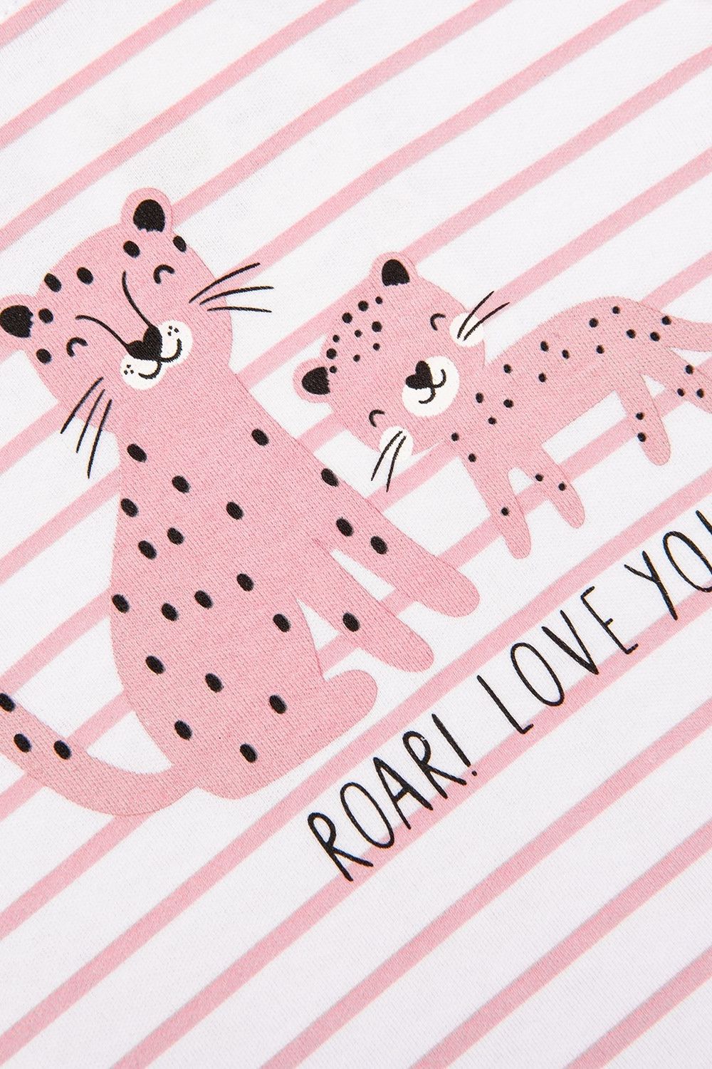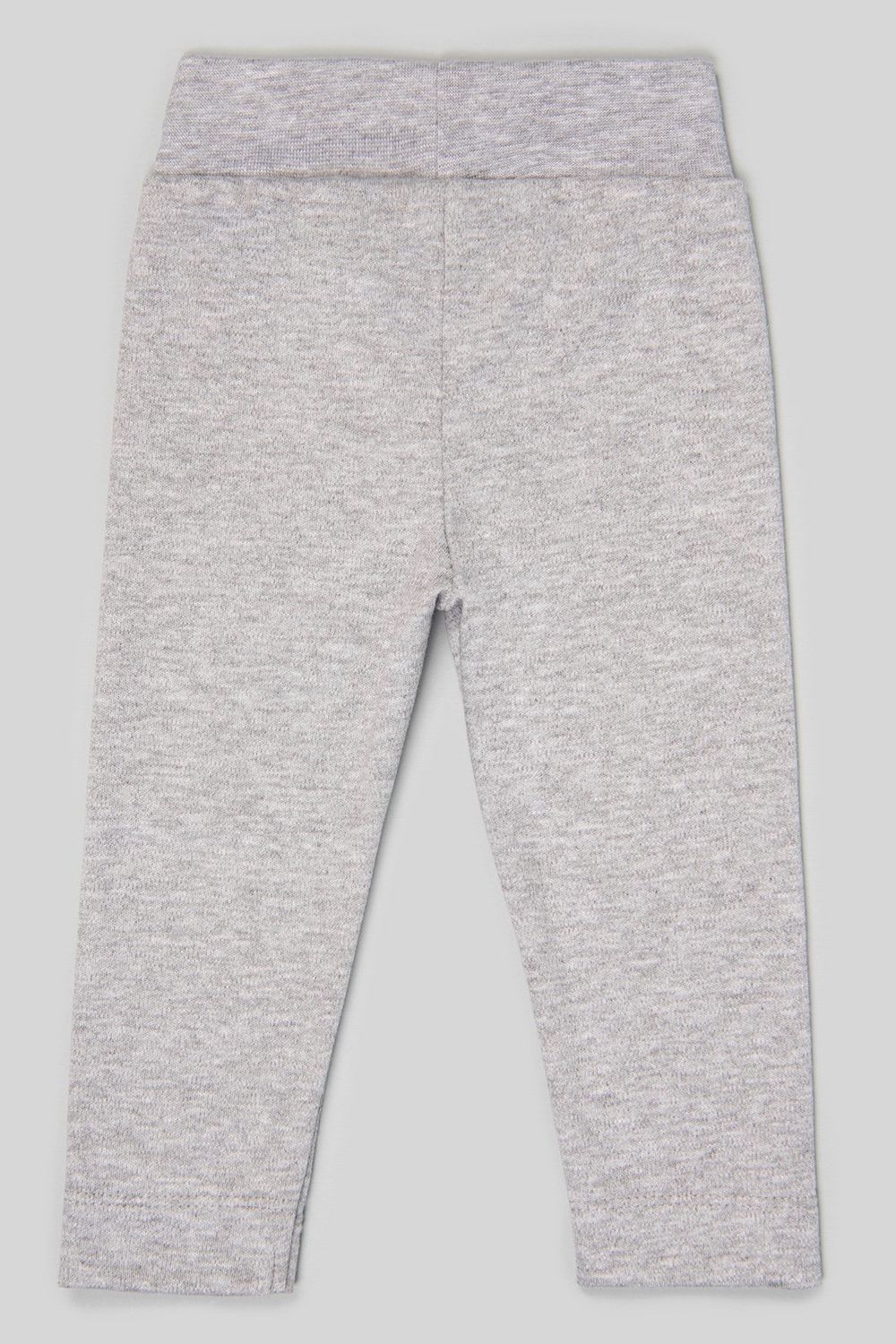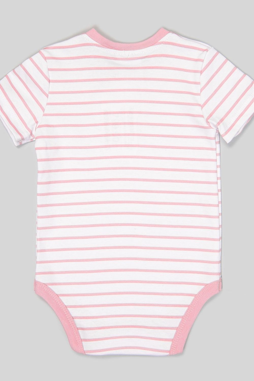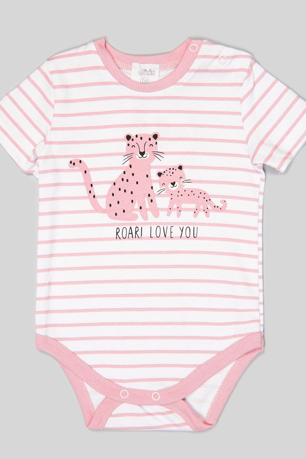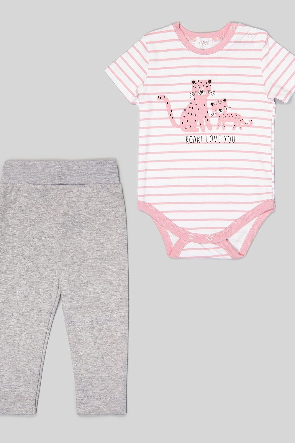 Комплект для девочки из двух предметов: серых брюк и белого боди в розовую полоску с принтом. Застёжки-кнопки на плечике и по низу изделия. У боди короткий рукав. Широкий эластичный пояс у брюк.