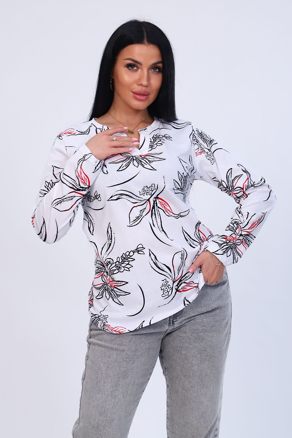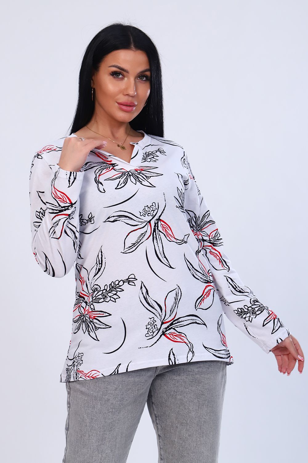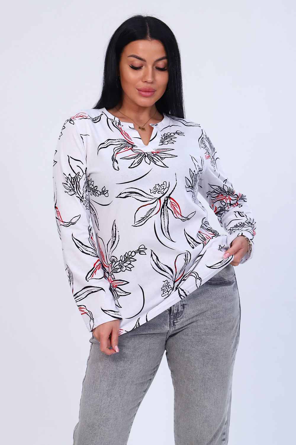 Туника женская с длинным рукавом из 100% хлопка. Оригинальная горловина с планкой без пуговиц. Низ изделия ассиметричен.