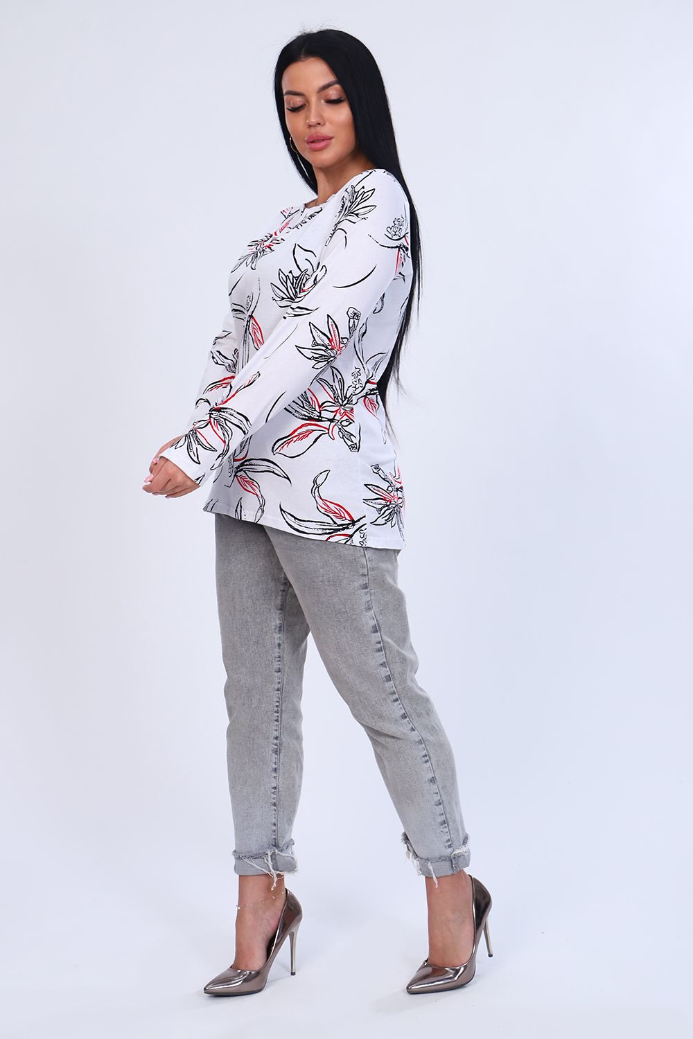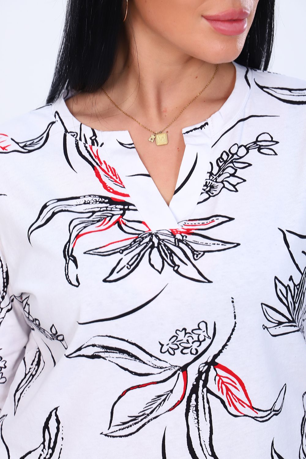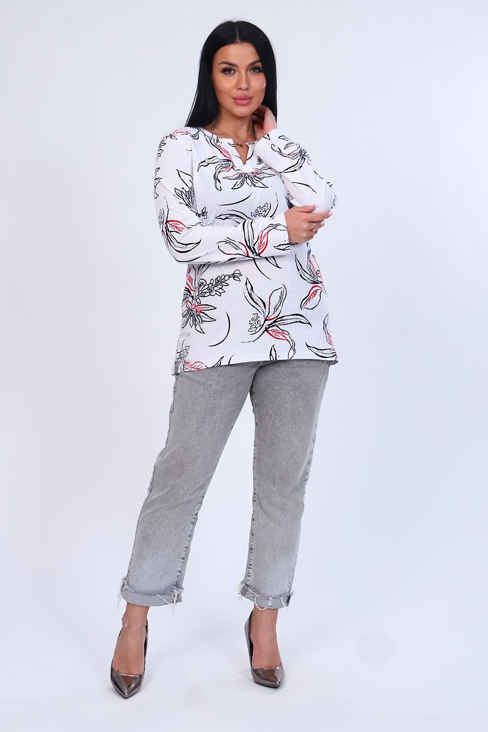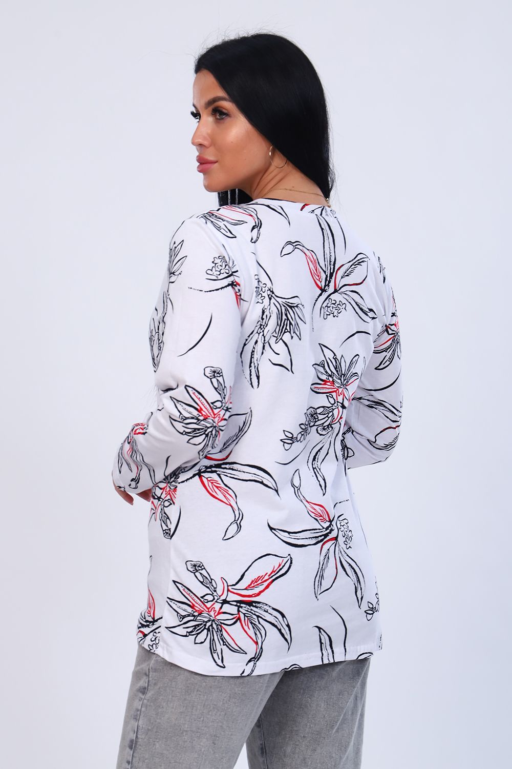Туника женская с длинным рукавом из 100% хлопка. Оригинальная горловина с планкой без пуговиц. Низ изделия ассиметричен.