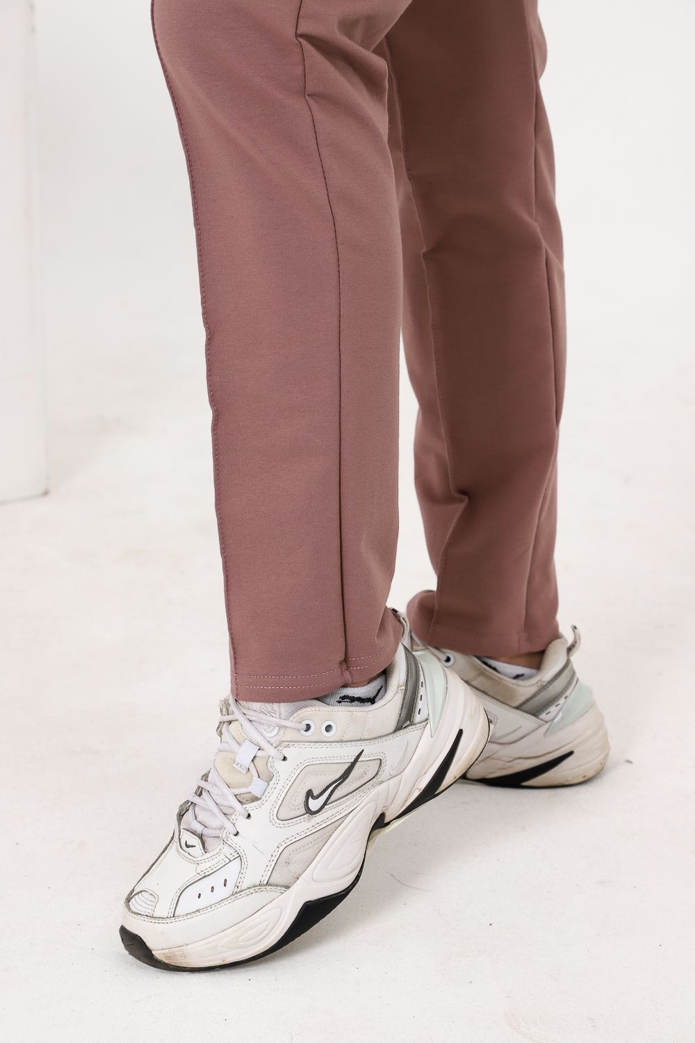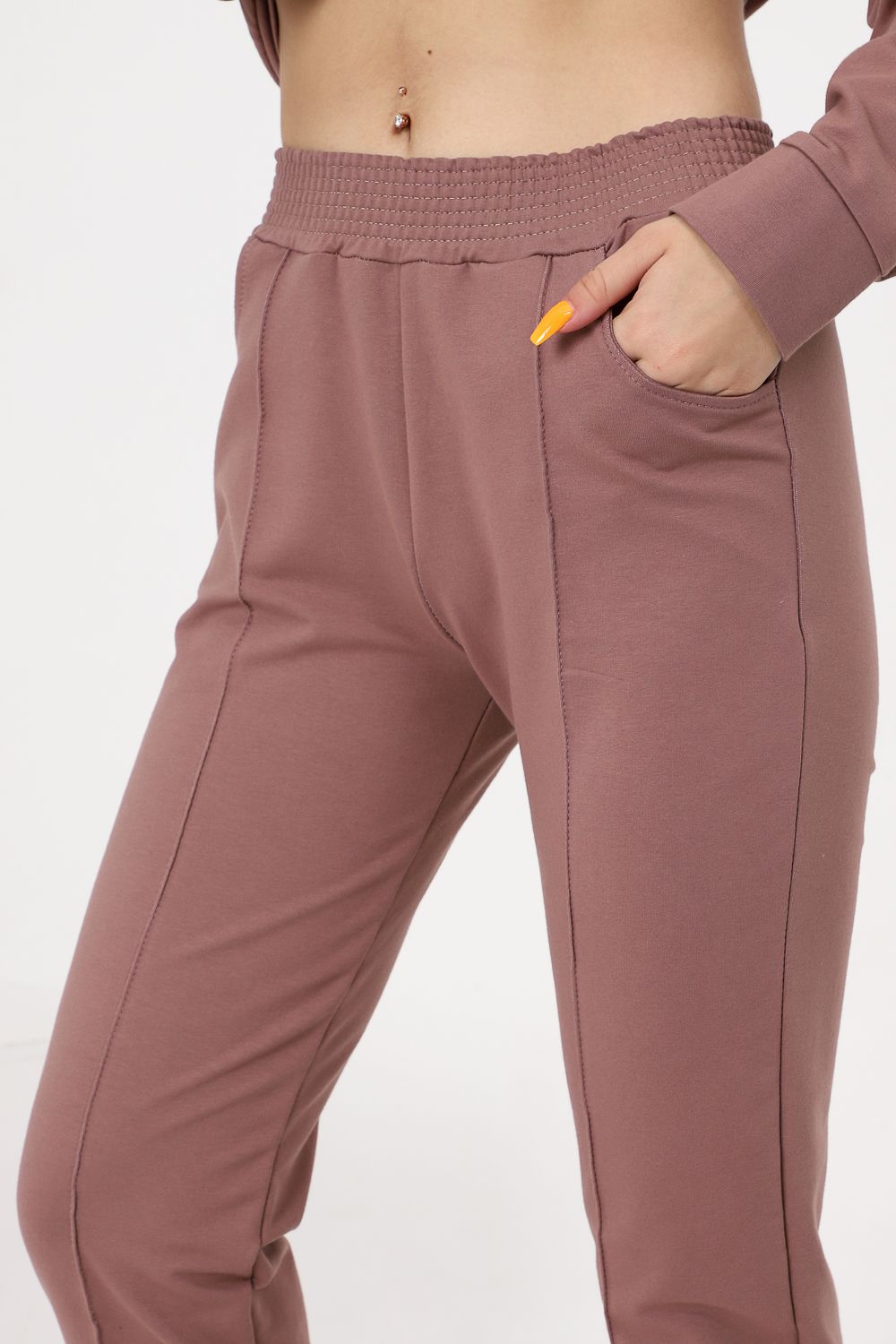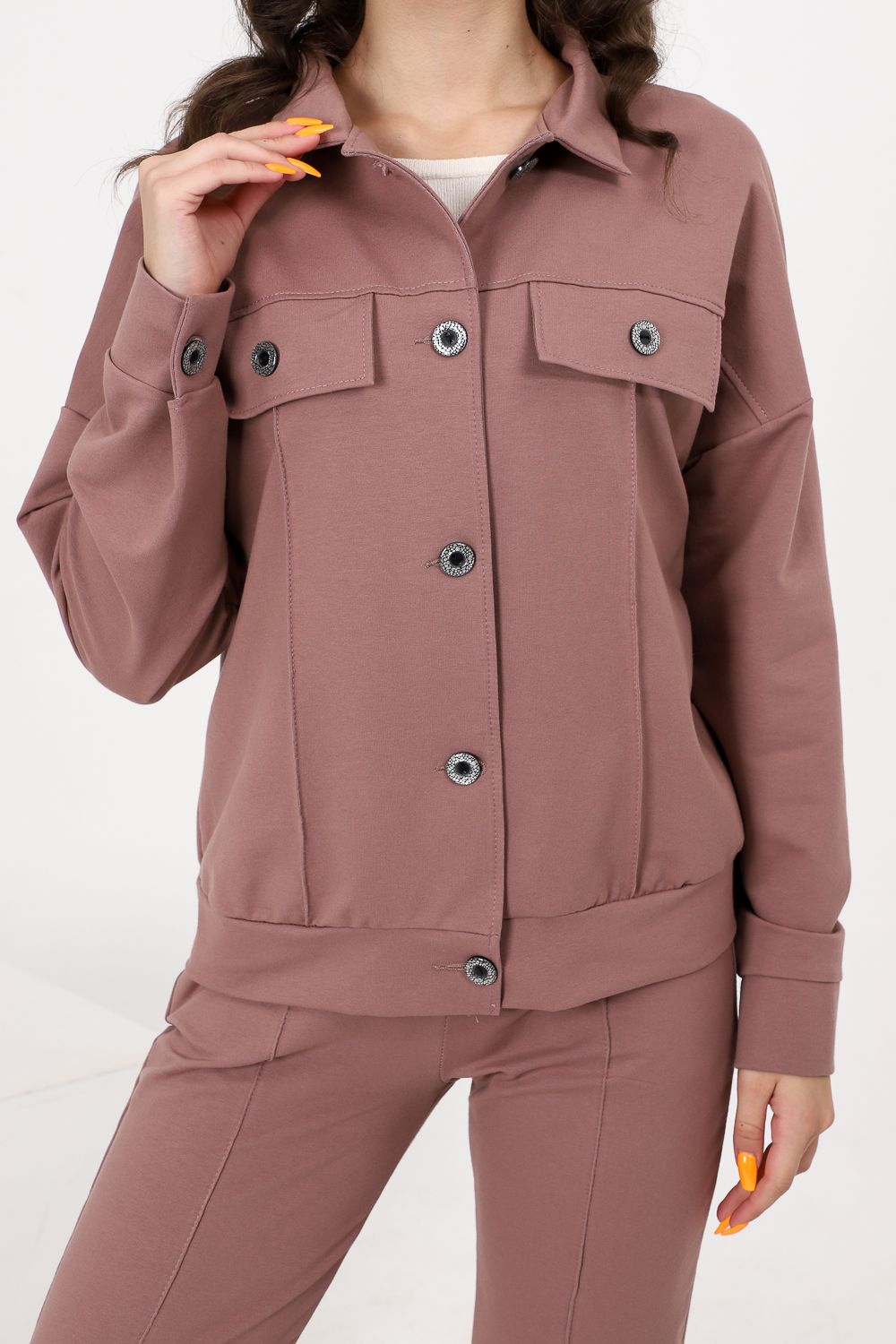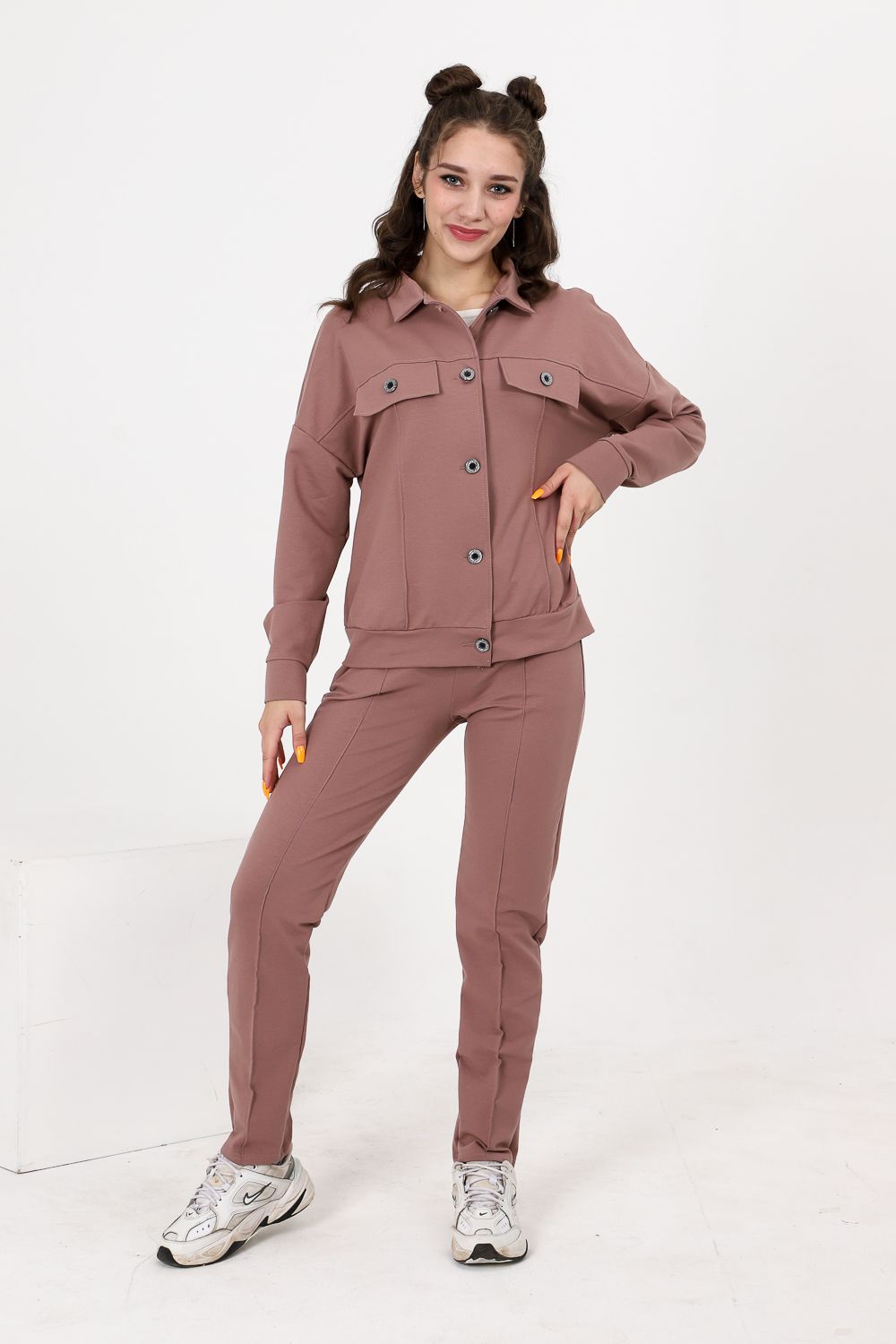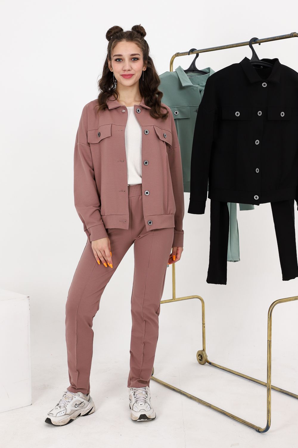Костюм состоит из бомбера и брюк. Бомбер с застежкой на пуговицы и петли, с отложным воротником, свободная, на поясе. Полочка и спинка с кокетками. Рукав длинный, на манжете с застежкой на петлю и пуговицу. Брюки на поясе, с боковыми карманами. Вдоль передних половинок обработаны "стрелки".