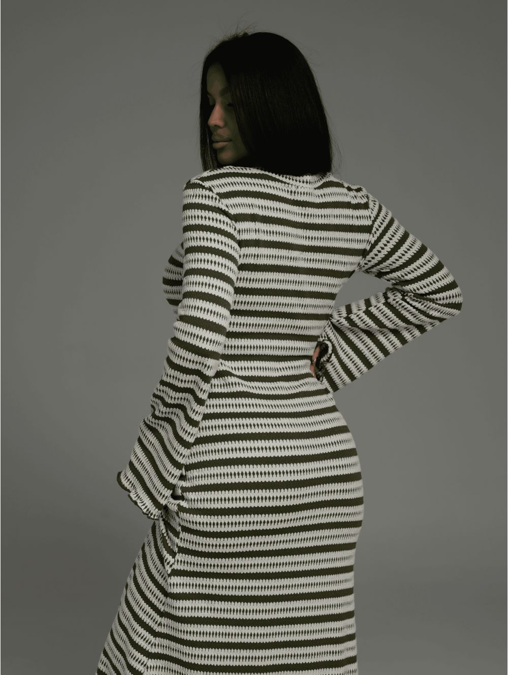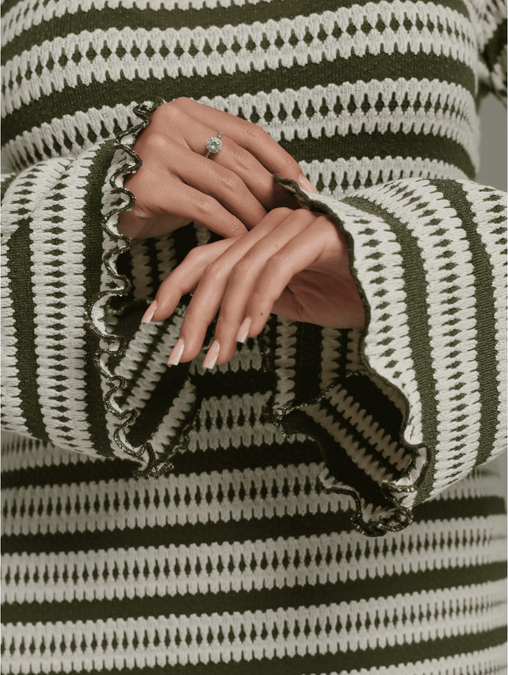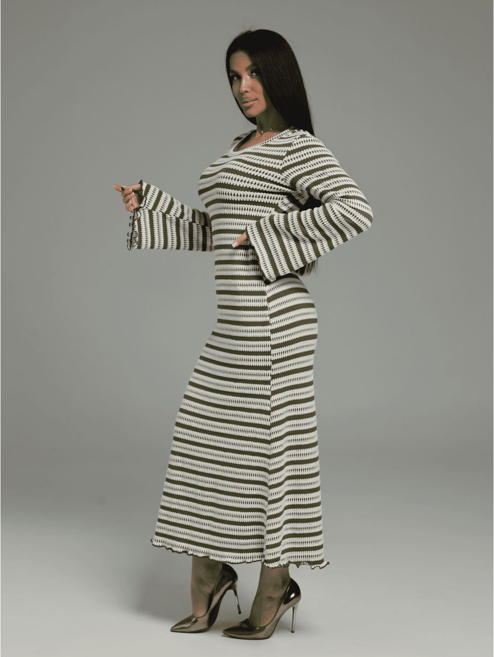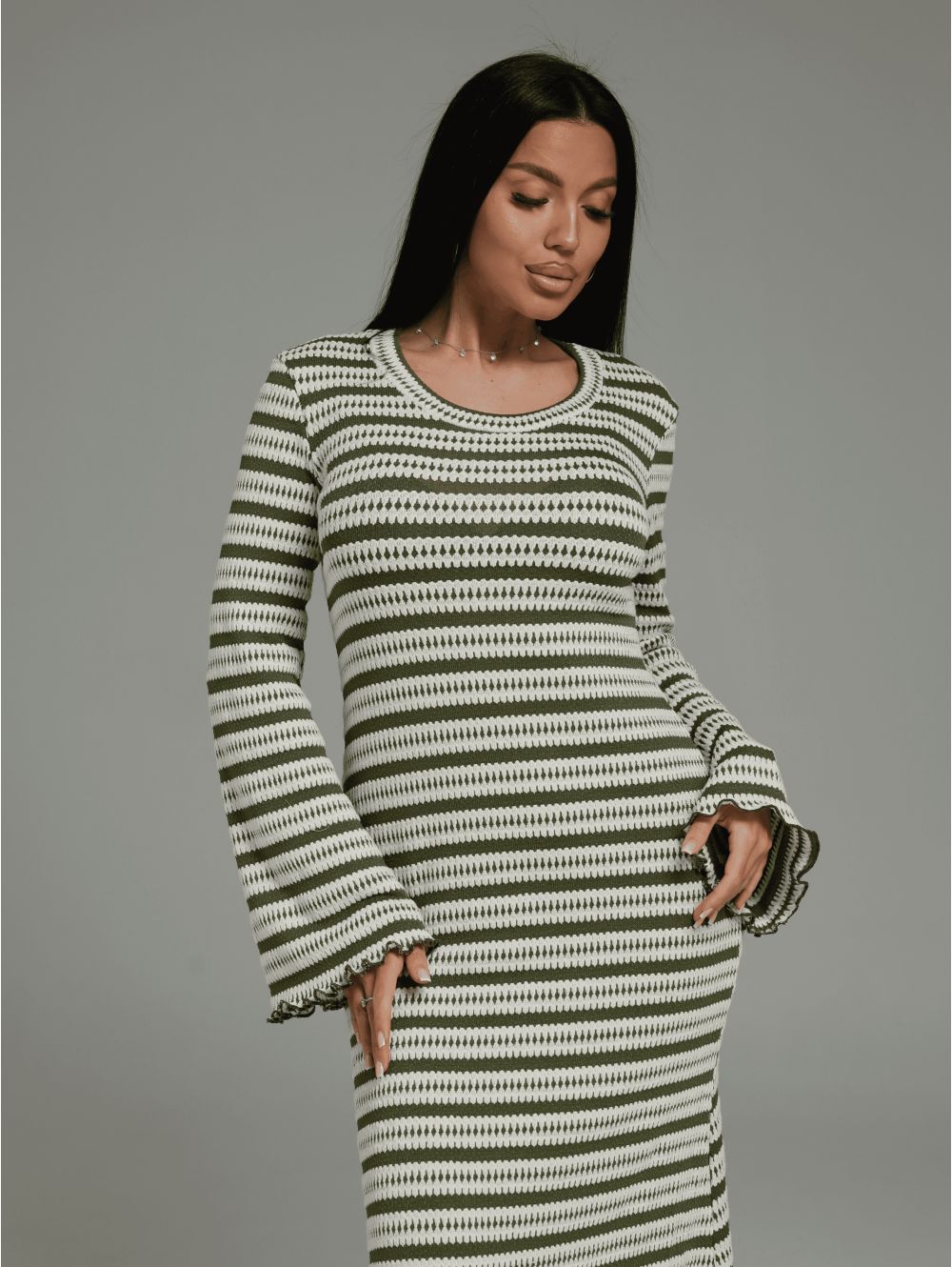 Женственный силуэт: Приталенный крой мягко облегает талию и плавно расклешивается к низу, создавая изящный и романтичный образ. Длинный расклешенный рукав добавляет динамики и элегантности.