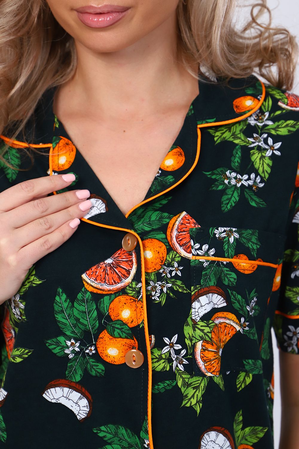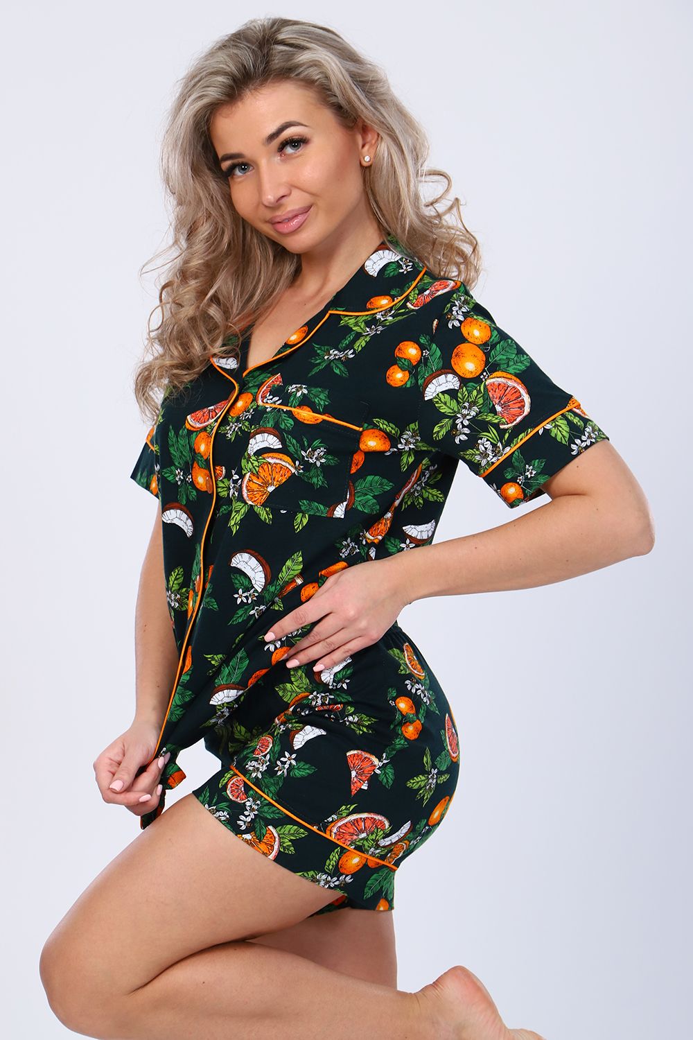 Пижама с ярким тропическим принтом, состоящий из кофты с коротким рукавом и шорт. Кофта застегивается на пуговицы, имеет красивый отложной воротник, на груди слева накладной карман, на рукавах манжеты, обработанные ярким атласным кантом. Шорты без карманов на мягкой резинке с удобной посадкой, снизу манжета, обработанная кантом. Пижама не стесняет движений, ткань мягкая, приятная к телу. Благодаря натуральному составу ткани в ней будет комфортно и удобно провести весь день, а ночью станет гарантией спокойного и крепкого сна.