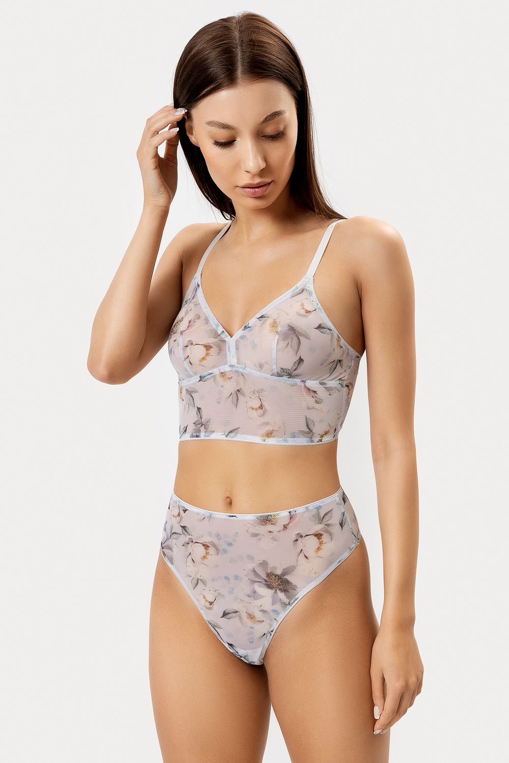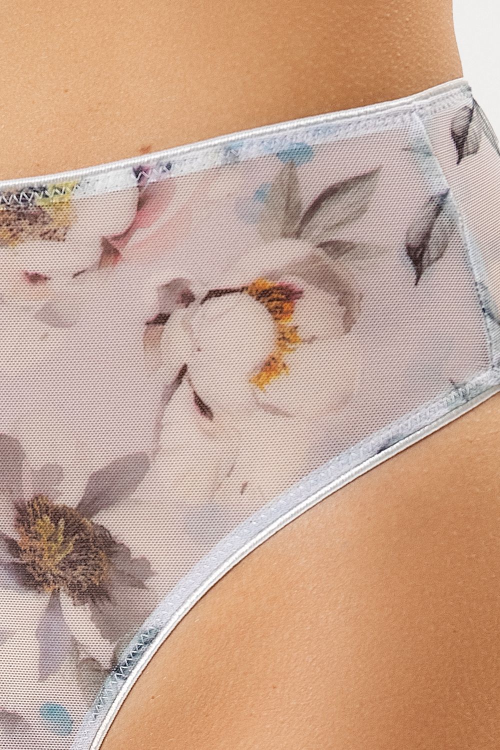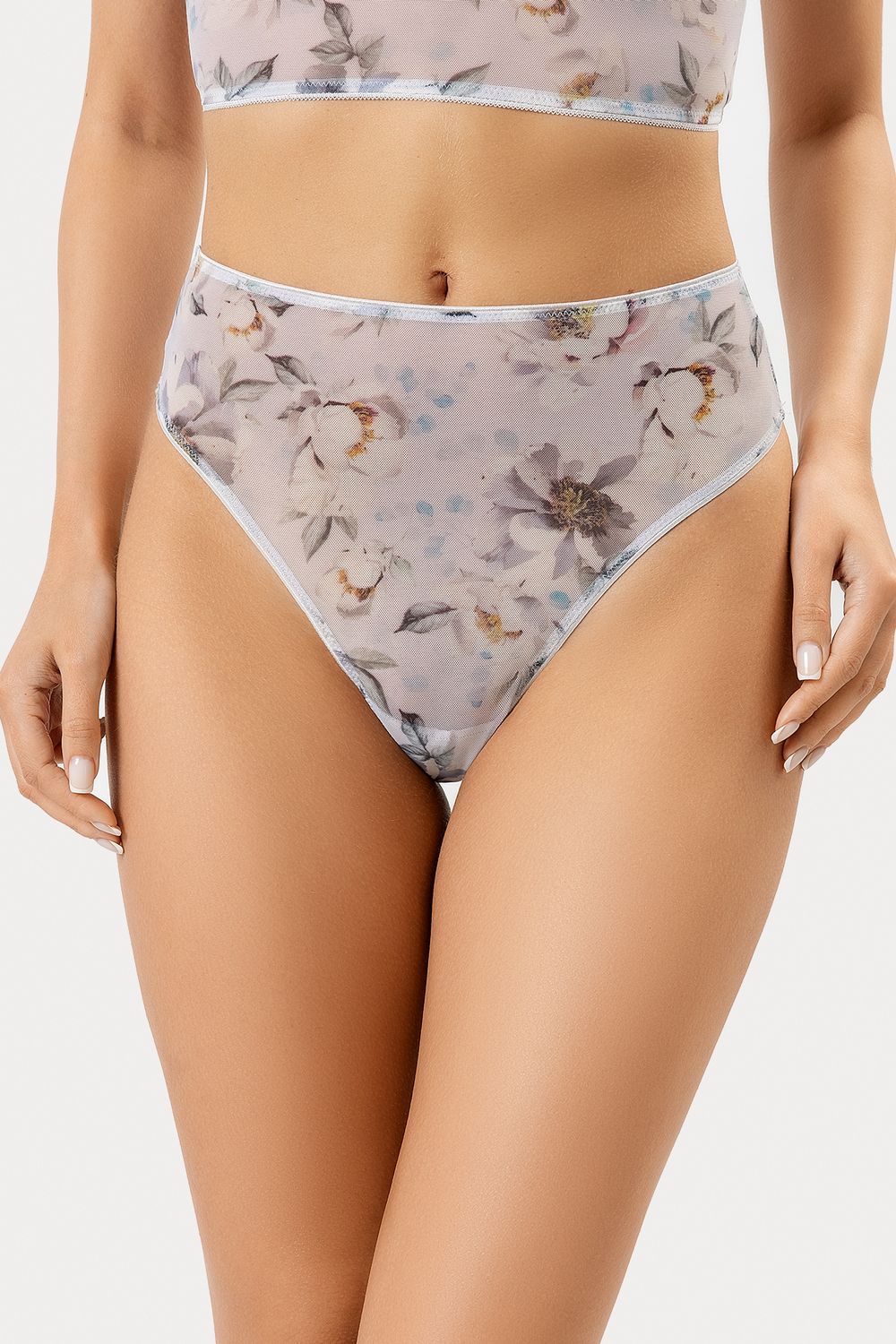 Женские трусики бразилиана, выполненные из эластичного сетчатого полотна. Линия талии завышенная. Верхний и нижние срезу трусиков обработаны тесьмой. Очаровательная модель!