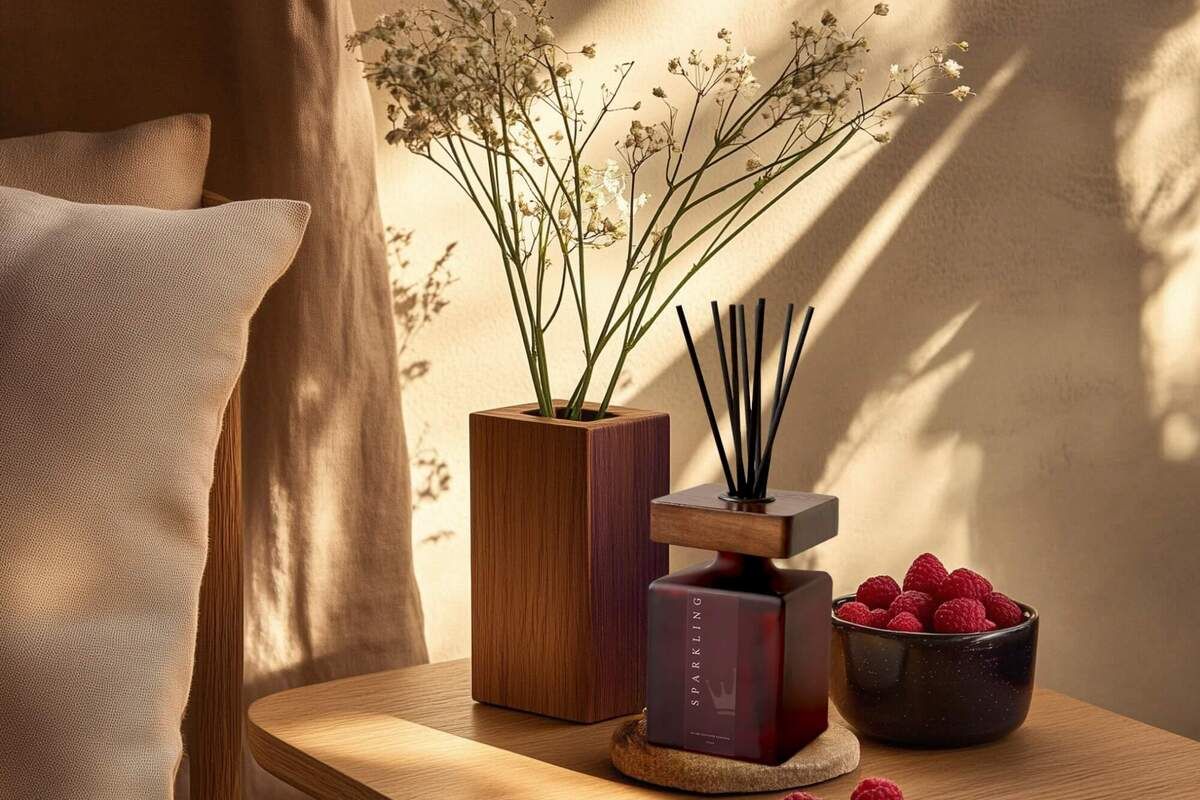 Комплектация: флакон цвета бордо с деревянной крышкой из монгольского дуба, 8 фибровых палочек длиной 25 см, коробка-футляр на магнитах как достойное обрамление дорогого подарка.
