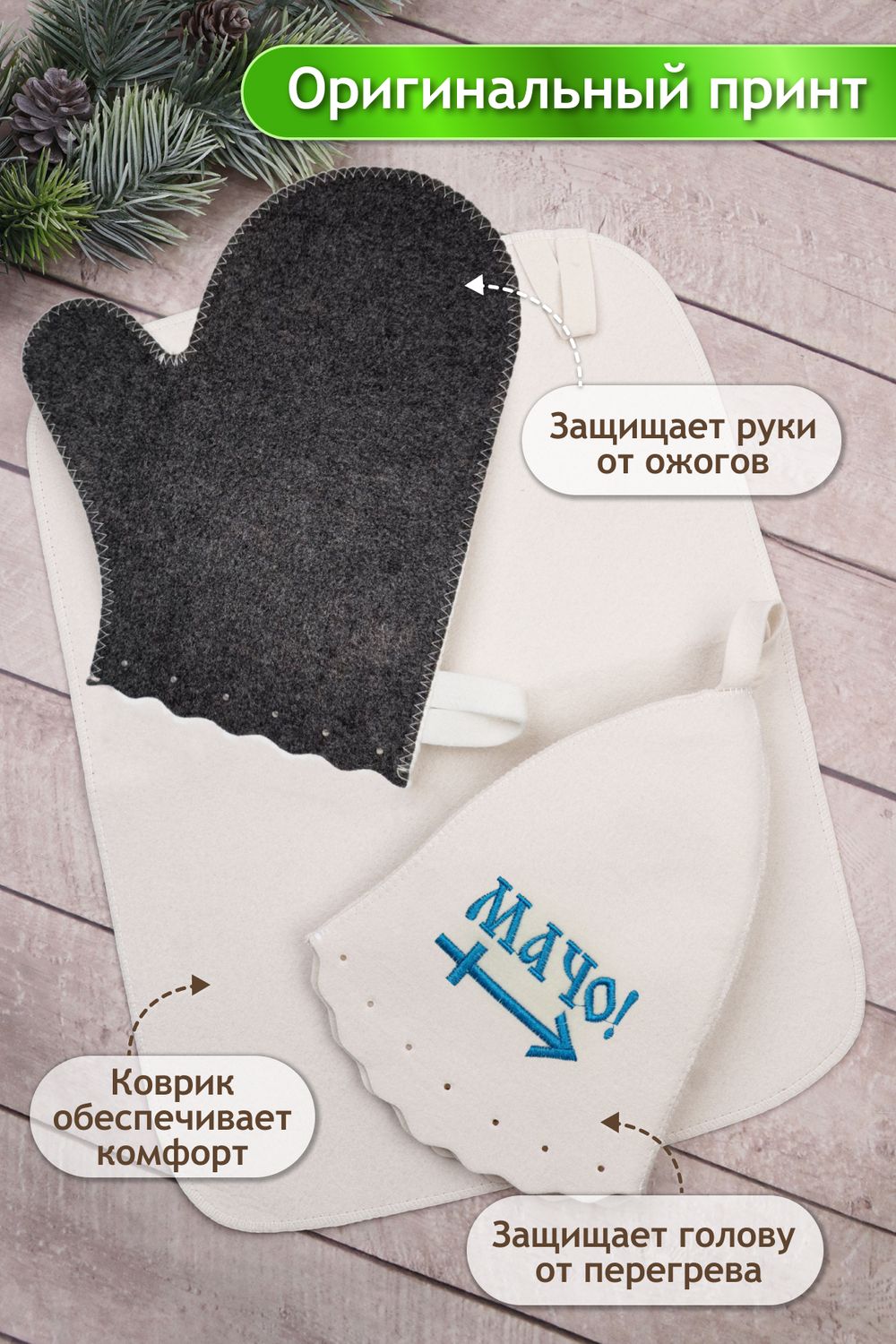 Наш оригинальный набор для бани включает в себя шапку, рукавицу и коврик. Это незаменимые аксессуары для любителей попариться в бане и сауне. Шапка защитит волосы от сухости и ломкости, голову от перегрева и предотвратит появление головокружения. Рукавицы – это повышение комфорта при использовании банного веника и безопасность ваших рук от появления ожогов. А индивидуальный коврик защитит от высоких температур при контакте с горячей лавкой в парилке. Оригинальная вышивка выполнена качественно и не сотрётся в процессе использования. На изделиях имеются петельки, с помощью которых их можно повесить на крючок в предбаннике. Такой набор станет отличным подарком для любителей отдыха в бане или сауне.