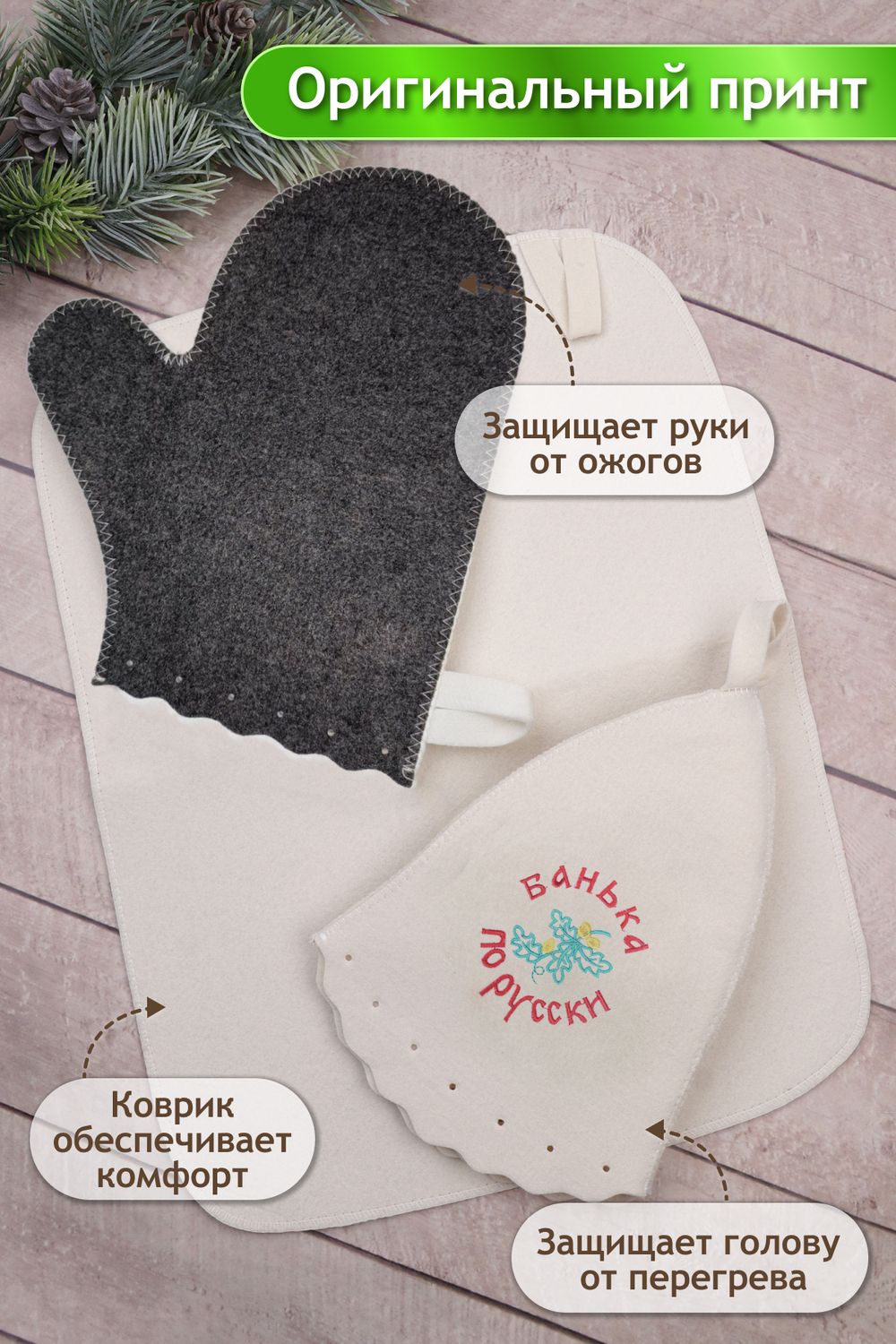 Наш оригинальный набор для бани включает в себя шапку, рукавицу и коврик. Это незаменимые аксессуары для любителей попариться в бане и сауне. Шапка защитит волосы от сухости и ломкости, голову от перегрева и предотвратит появление головокружения. Рукавицы – это повышение комфорта при использовании банного веника и безопасность ваших рук от появления ожогов. А индивидуальный коврик защитит от высоких температур при контакте с горячей лавкой в парилке. Оригинальная вышивка выполнена качественно и не сотрётся в процессе использования. На изделиях имеются петельки, с помощью которых их можно повесить на крючок в предбаннике. Такой набор станет отличным подарком для любителей отдыха в бане или сауне.
