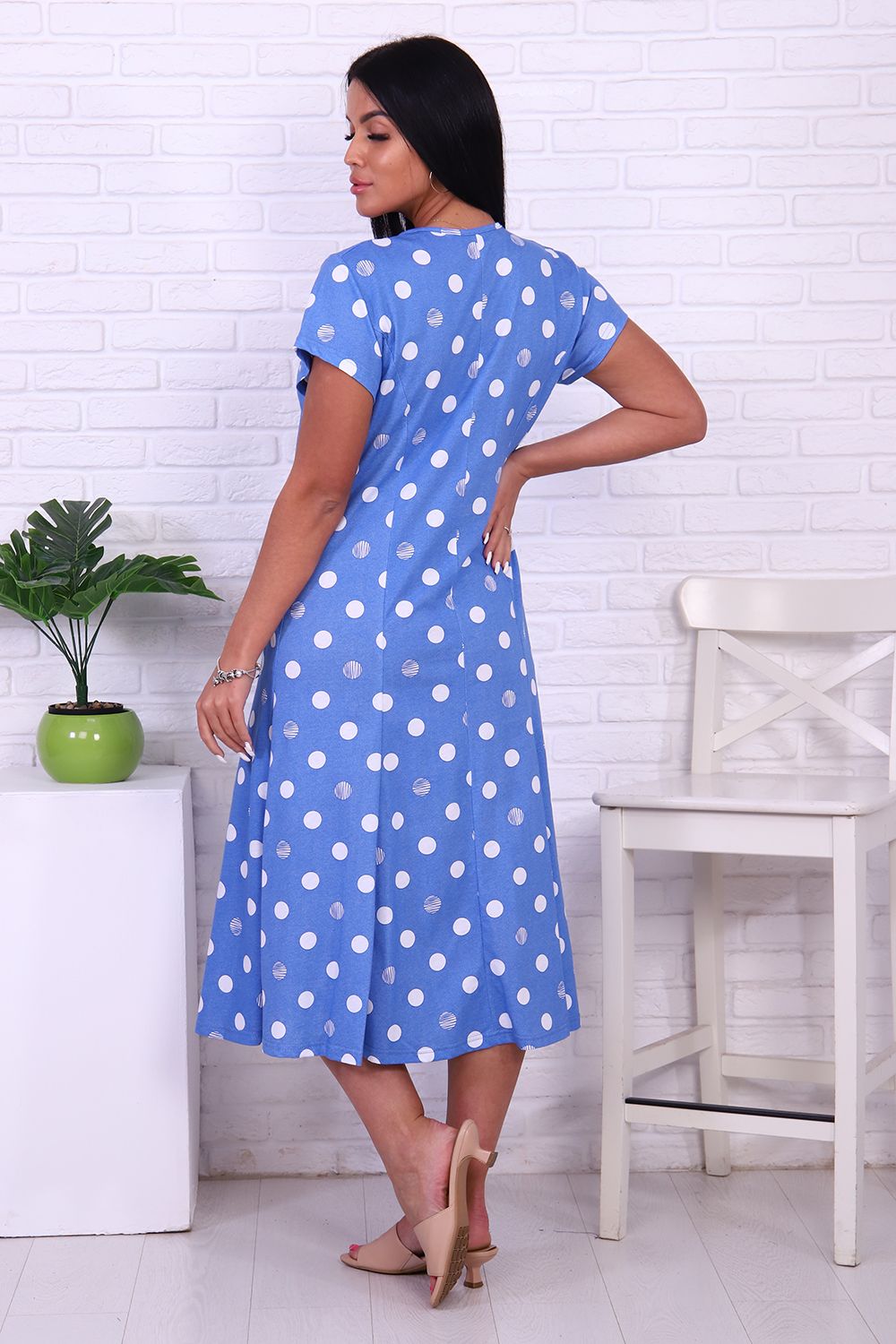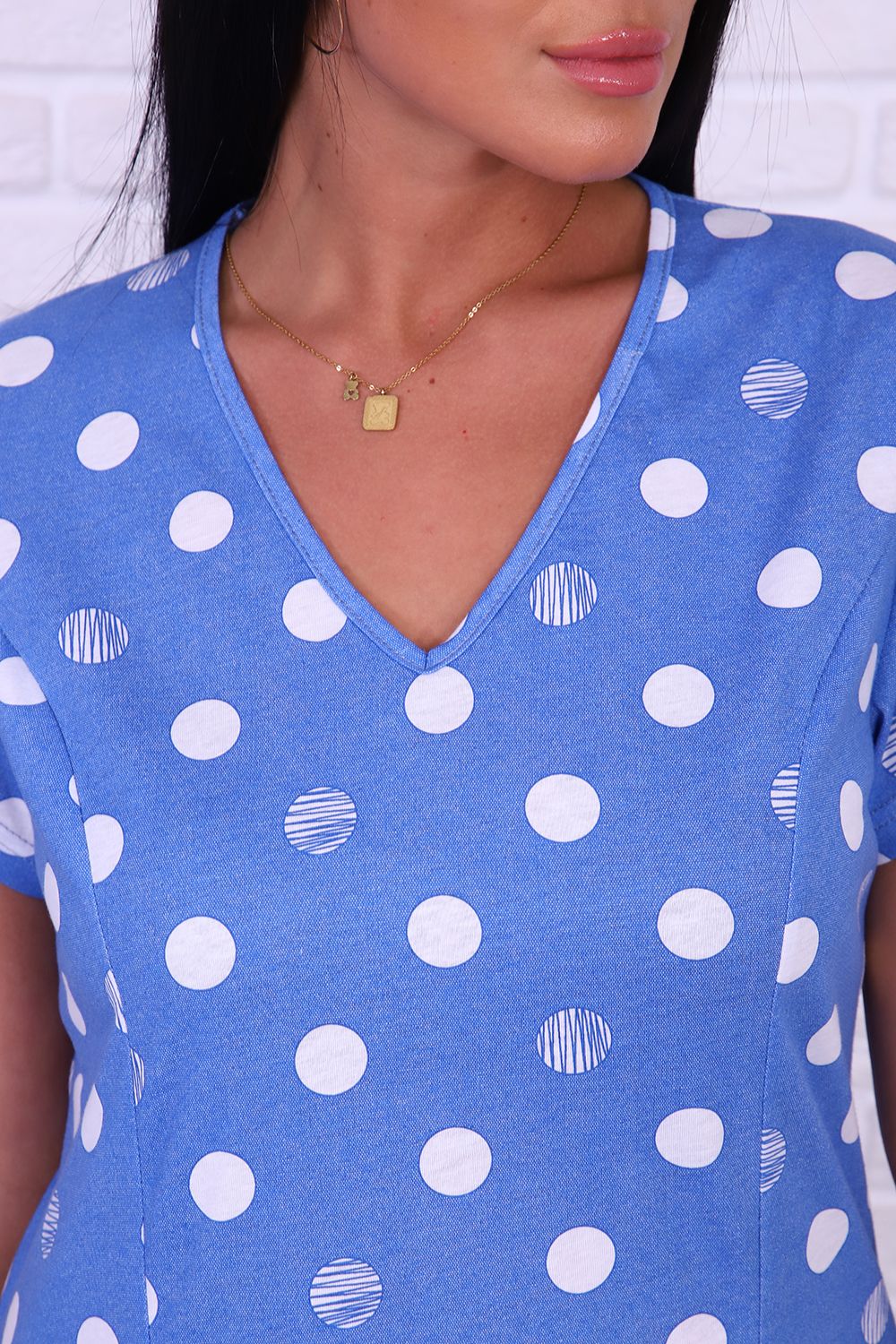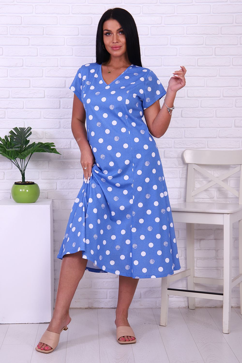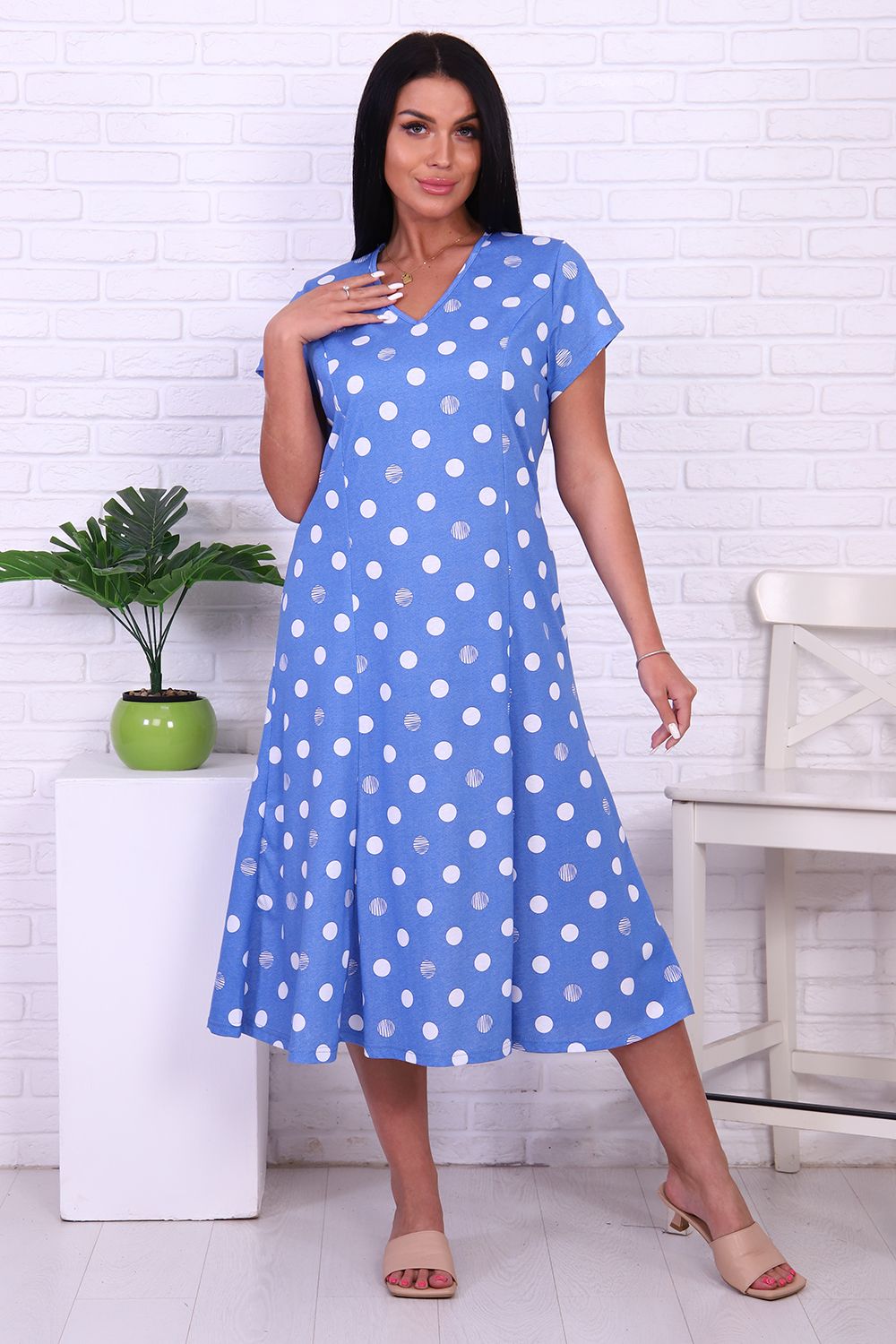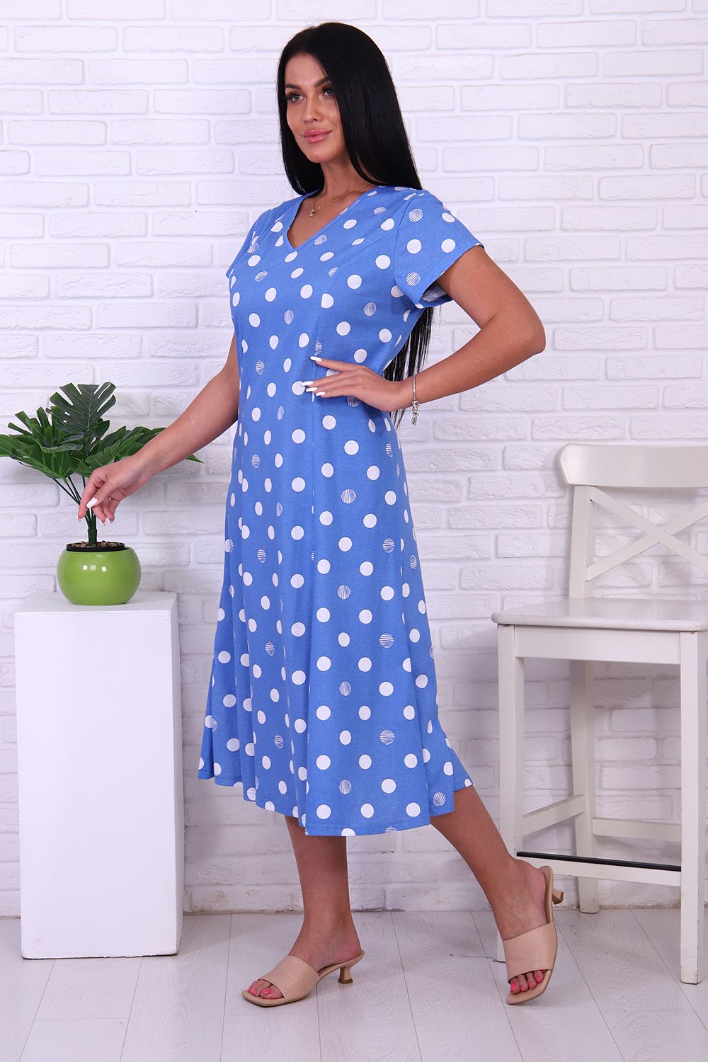 Платье из ткани кулирка расцветка "горох". Платье выполнено в легком стиле, с коротким рукавом, горловина V вырезом, в районе талии немного заужено, к низу умеренно расклёшено, что придает платью легкость и элегантность. Подойдет для прогулок, дома, и отдыха.