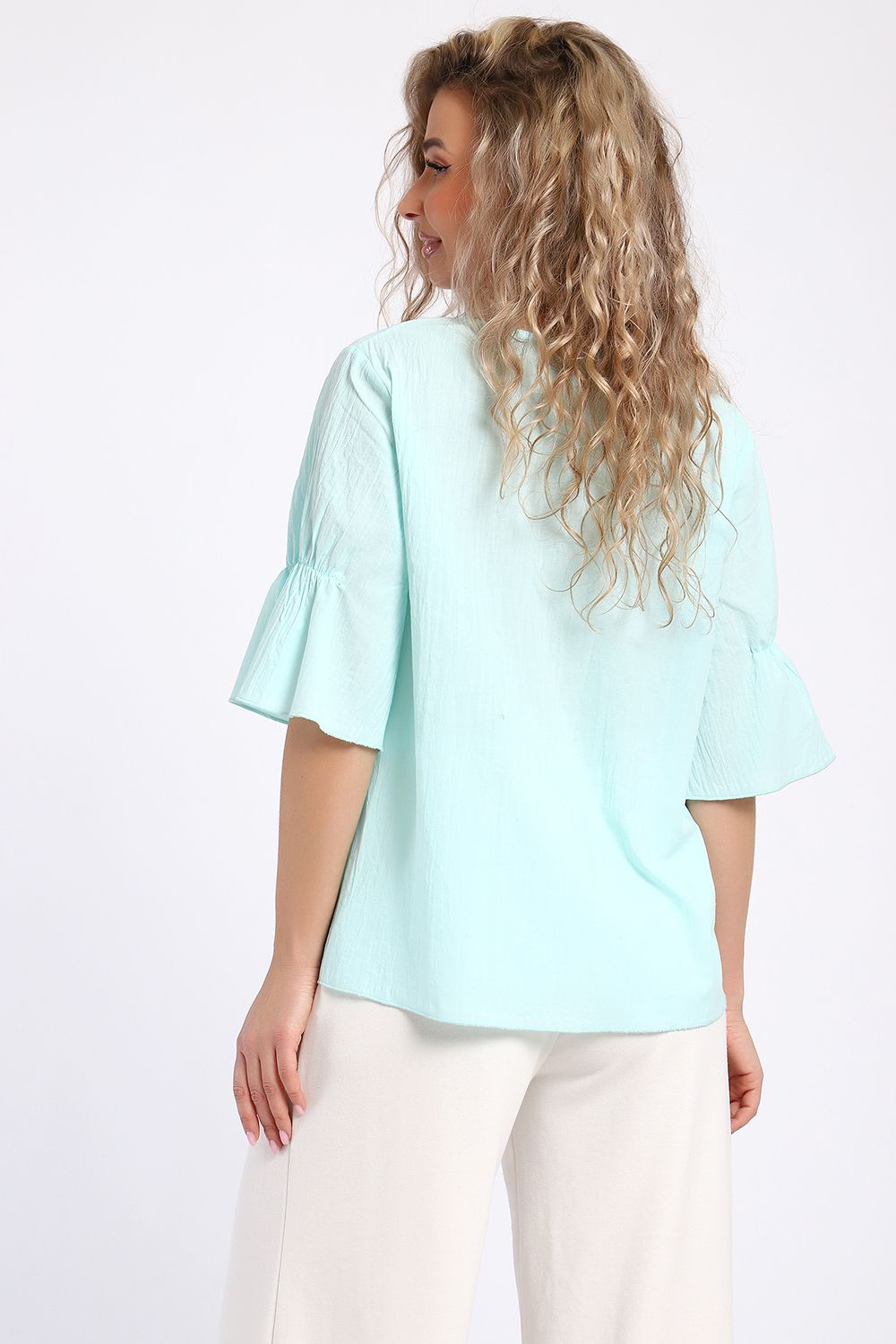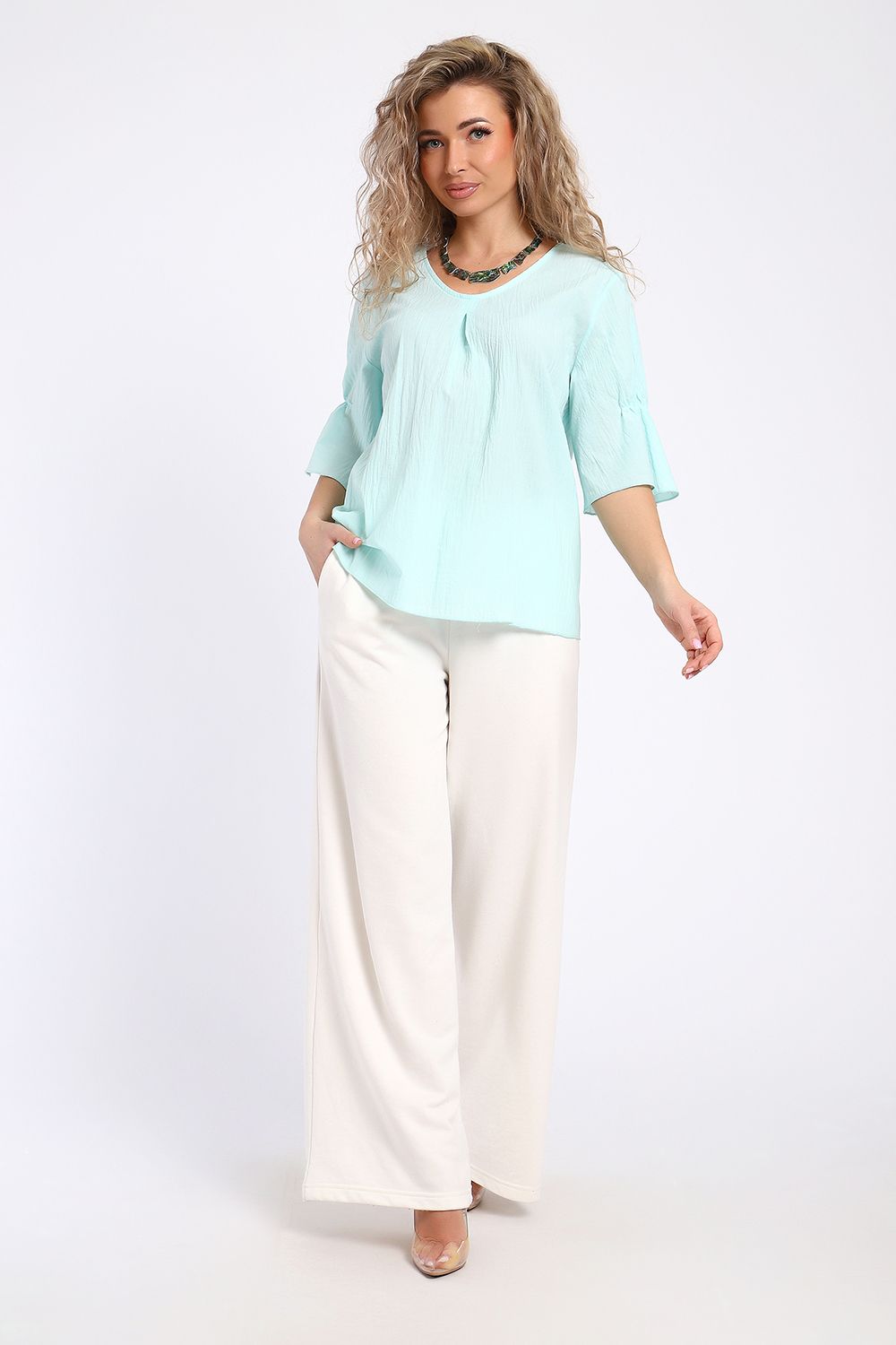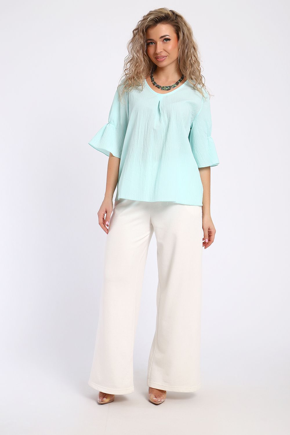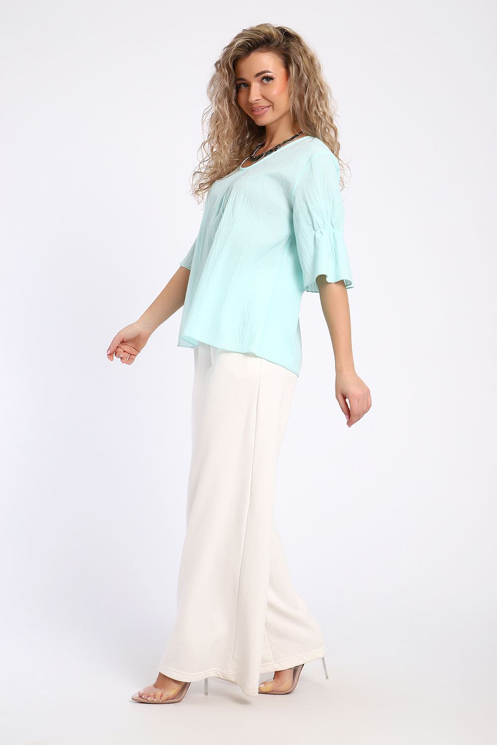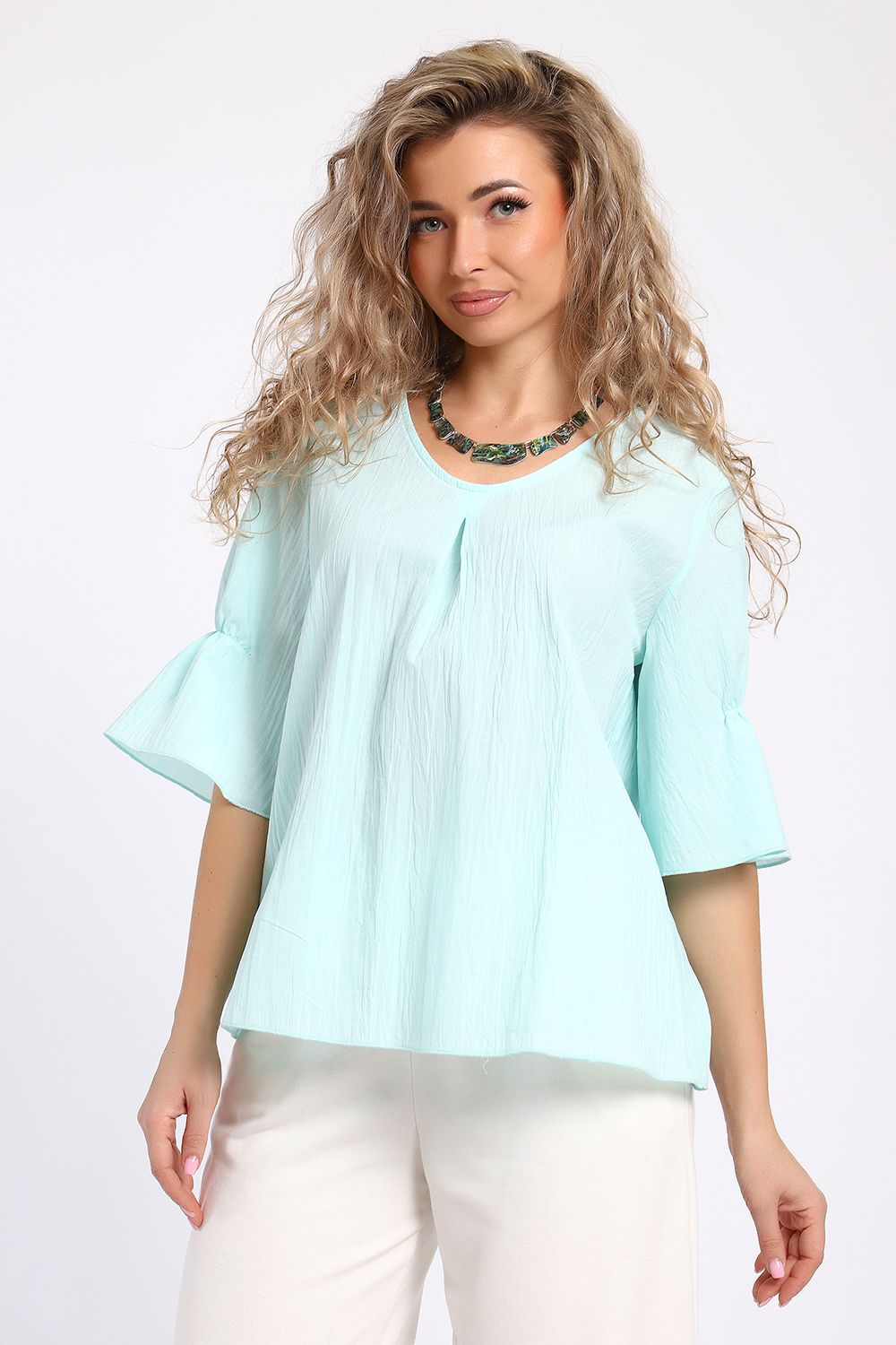 Женственная и очаровательная блузка для любительниц одежды из натуральных тканей. Блузка выполнена из тонкого хлопчатобумажного полотна с эффектом жатки, благодаря чему изделие не мнется. Свободный крой блузки дополняет расклешенные рукава, присборенные по центру на резинку. Округлая горловина обработана окантовкой, низ изделия и рукавов — краевой спецмашиной. Длина блузки до линии бедра. Легкая ткань и свободный крой обеспечит комфорт на отдыхе и на работе