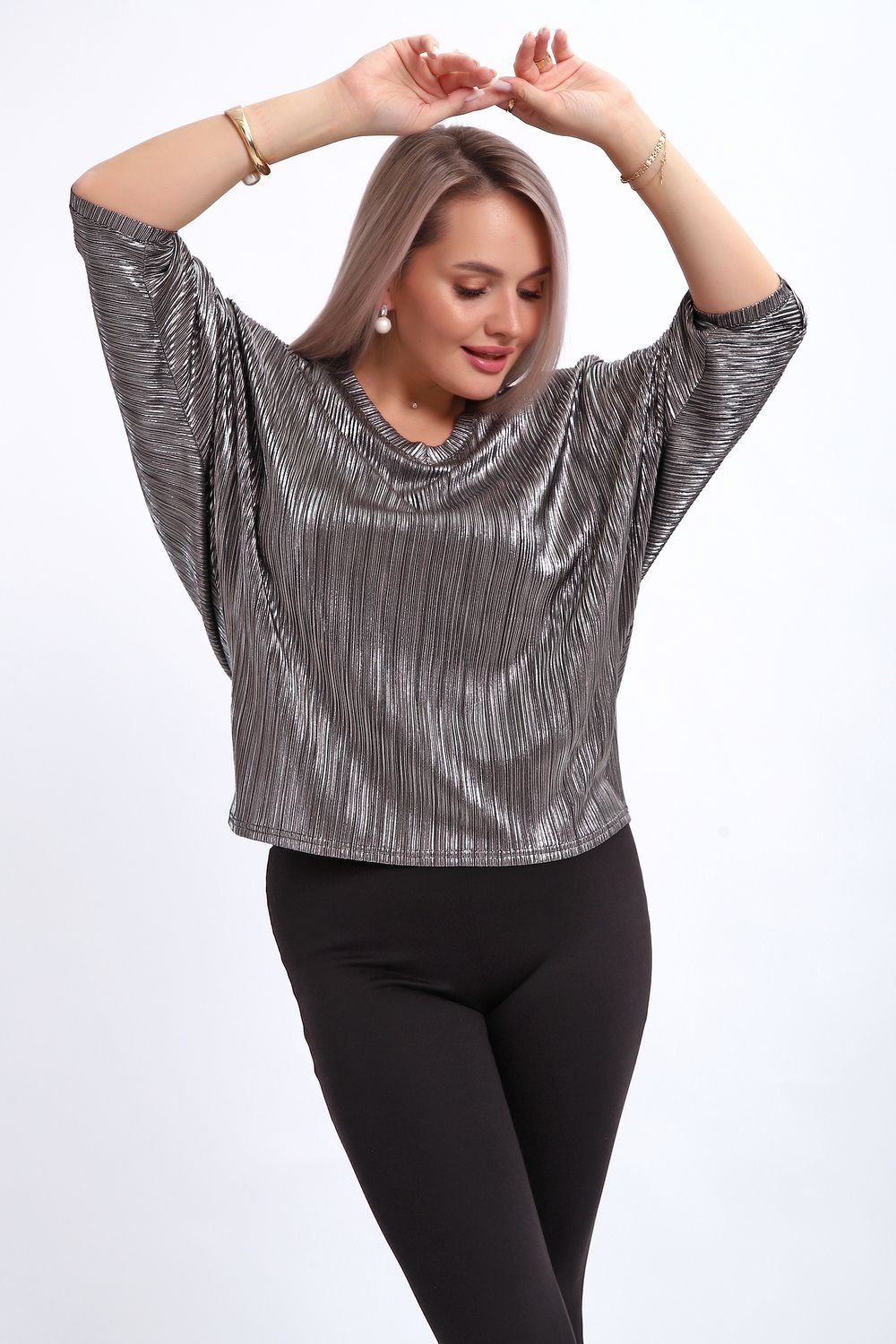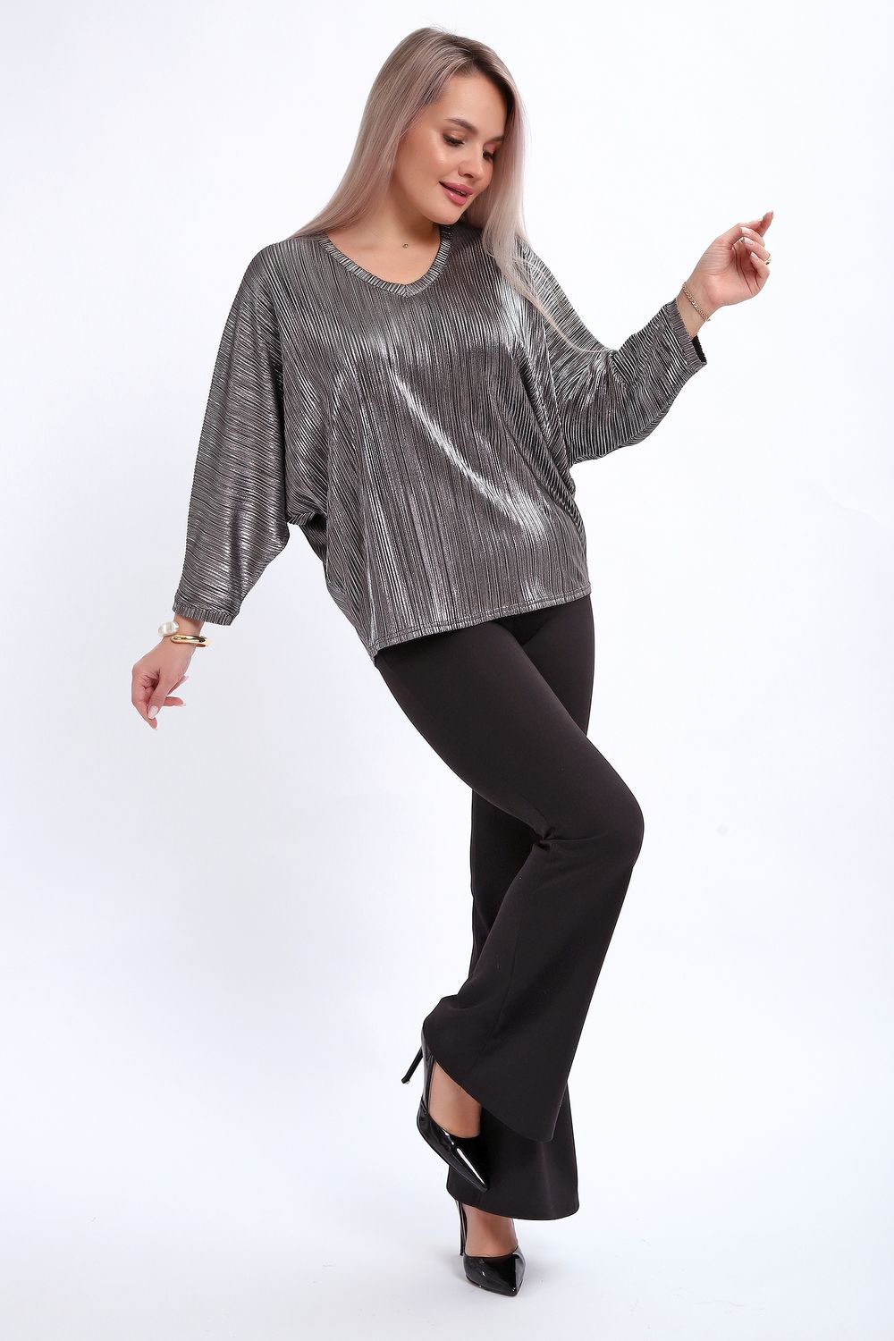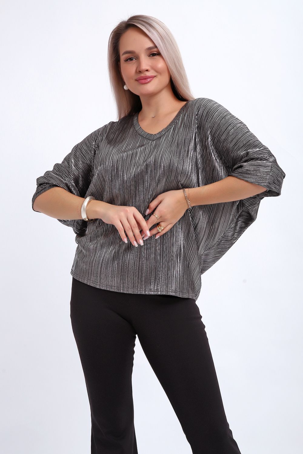 Сделайте акцент на вашем стиле с помощью комфортной и изысканной блузки. Нарядная кофта - это необходимый предмет в любом гардеробе. Благодаря свободному крою, она идеально садится на любую фигуру, скрывая то, что хотелось бы спрятать и подчеркивая достоинства. Блузка выигрышно смотрится за счет ткани атлас гофре со стойким напылением фойл, которое не осыпается в процессе носки и после стирки. Ткань атлас гофре хорошо тянется и драпируется, имеет мягкий благородный блеск и совершенно не мнется. Крой блузки лаконичен, без лишних деталей, рукав "летучая мышь" не сковывает движений, имеет длину 3/4 и оканчивается небольшим манжетом. V-образный воротник зрительно удлиняет шею, обработан обтачкой, длина блузки до линии бедра. Легкая изящная блузка отлично впишется в вечерний наряд, а также будет блестящим дополнением к деловому и повседневному образу.