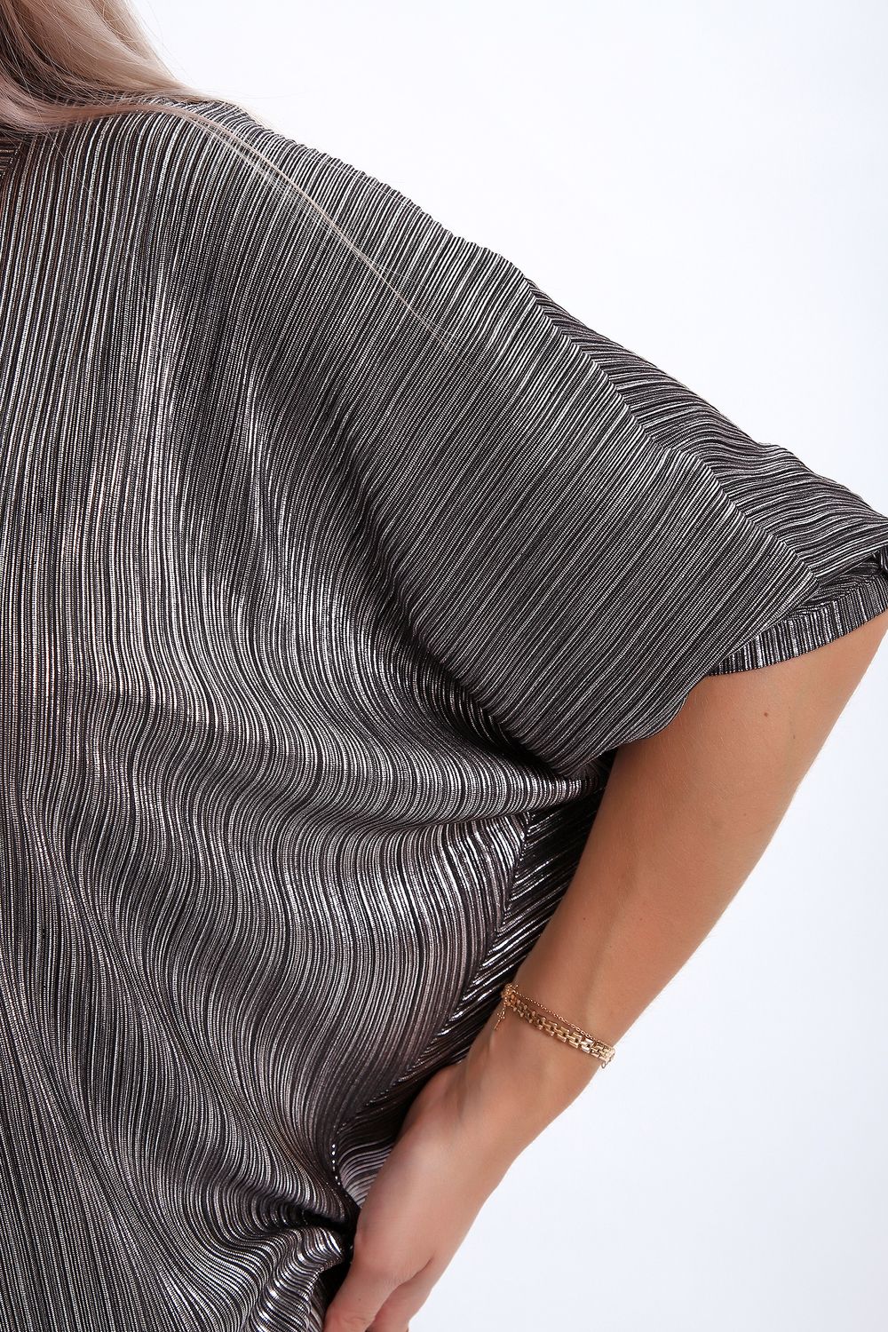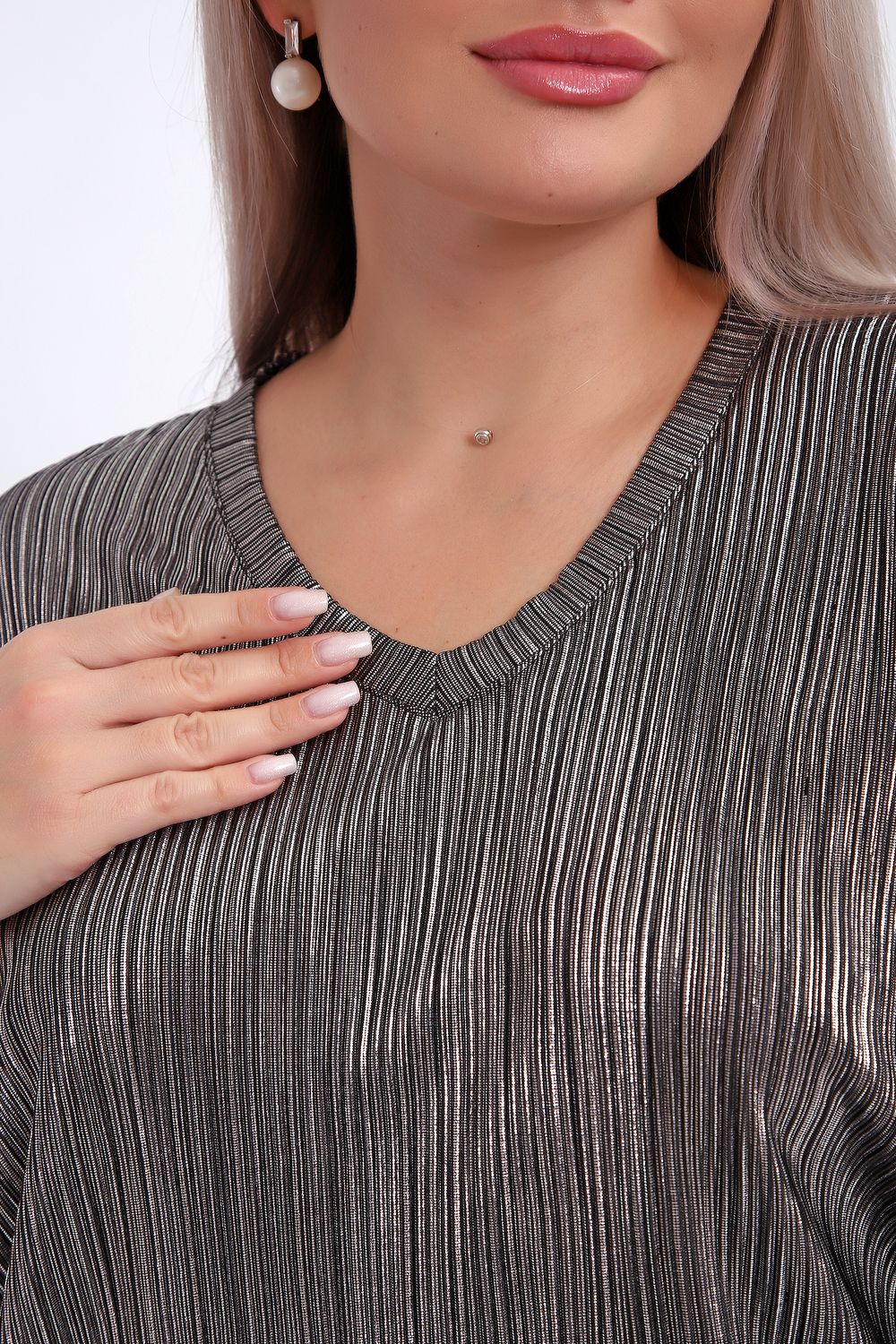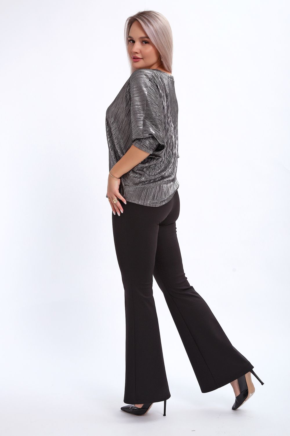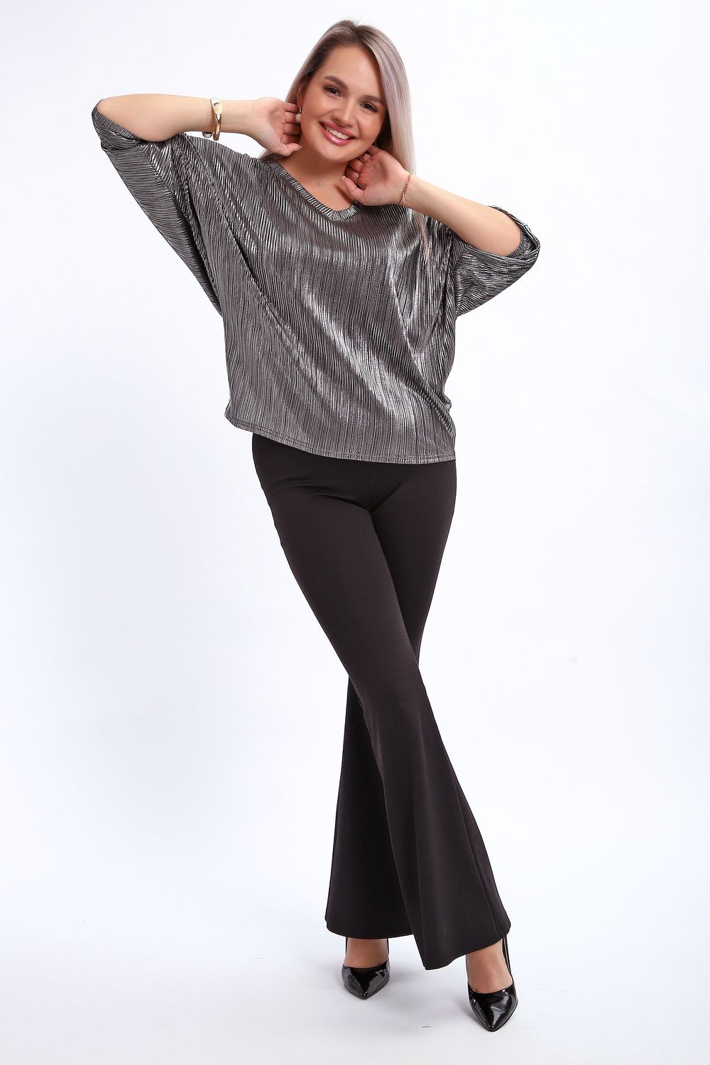 Сделайте акцент на вашем стиле с помощью комфортной и изысканной блузки. Нарядная кофта - это необходимый предмет в любом гардеробе. Благодаря свободному крою, она идеально садится на любую фигуру, скрывая то, что хотелось бы спрятать и подчеркивая достоинства. Блузка выигрышно смотрится за счет ткани атлас гофре со стойким напылением фойл, которое не осыпается в процессе носки и после стирки. Ткань атлас гофре хорошо тянется и драпируется, имеет мягкий благородный блеск и совершенно не мнется. Крой блузки лаконичен, без лишних деталей, рукав "летучая мышь" не сковывает движений, имеет длину 3/4 и оканчивается небольшим манжетом. V-образный воротник зрительно удлиняет шею, обработан обтачкой, длина блузки до линии бедра. Легкая изящная блузка отлично впишется в вечерний наряд, а также будет блестящим дополнением к деловому и повседневному образу.