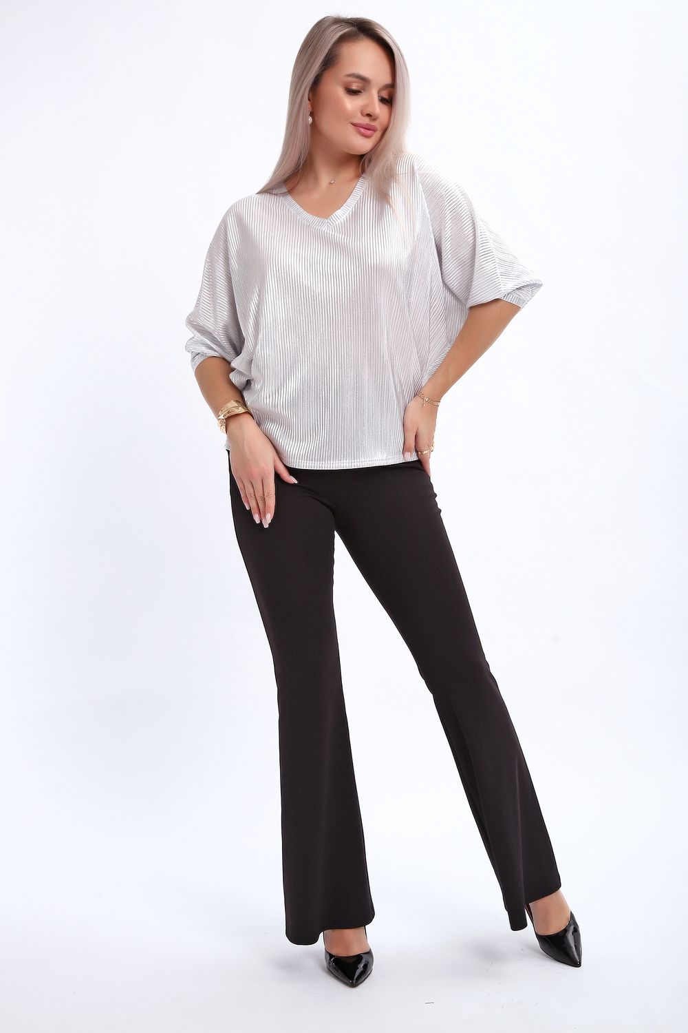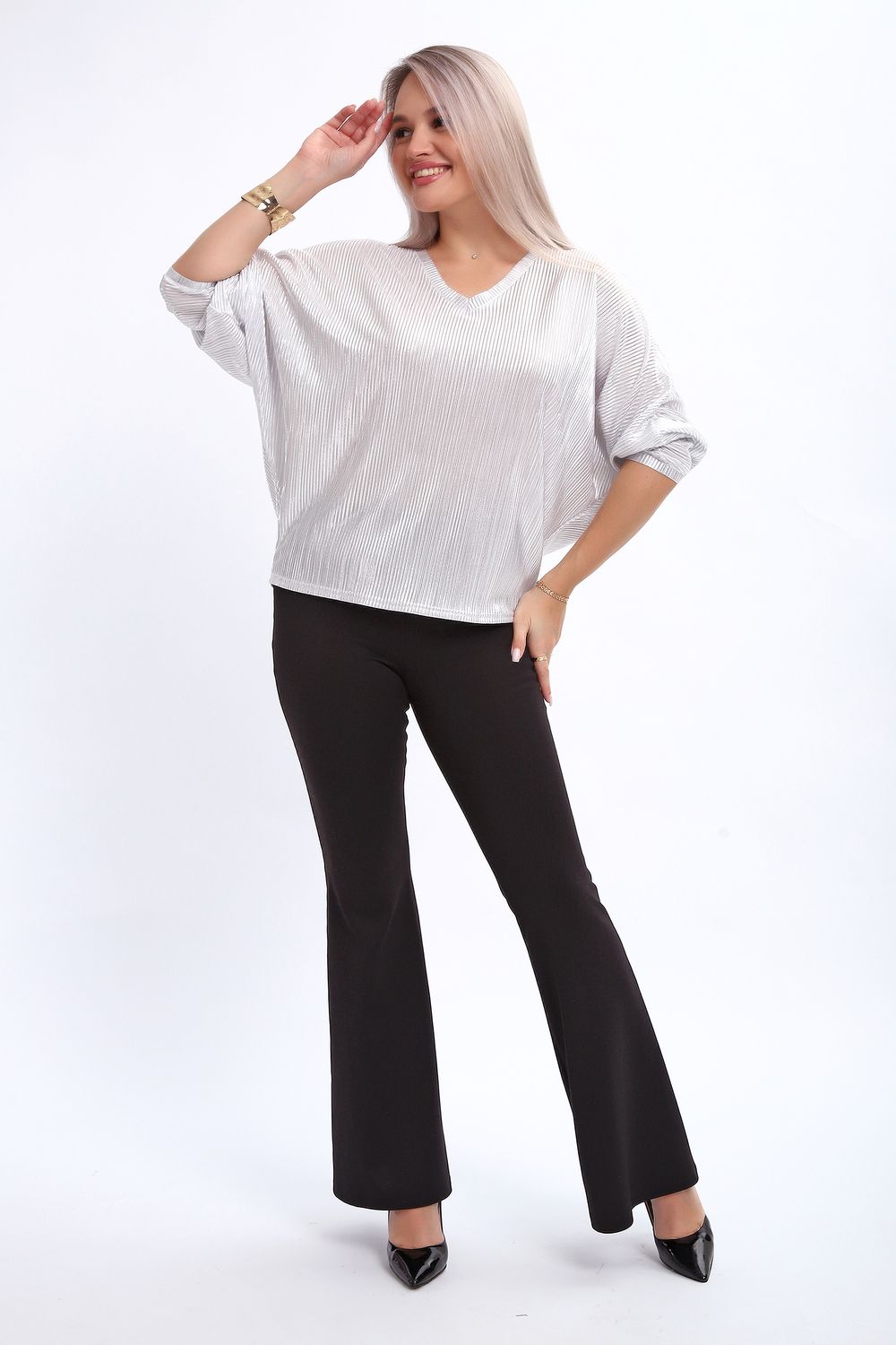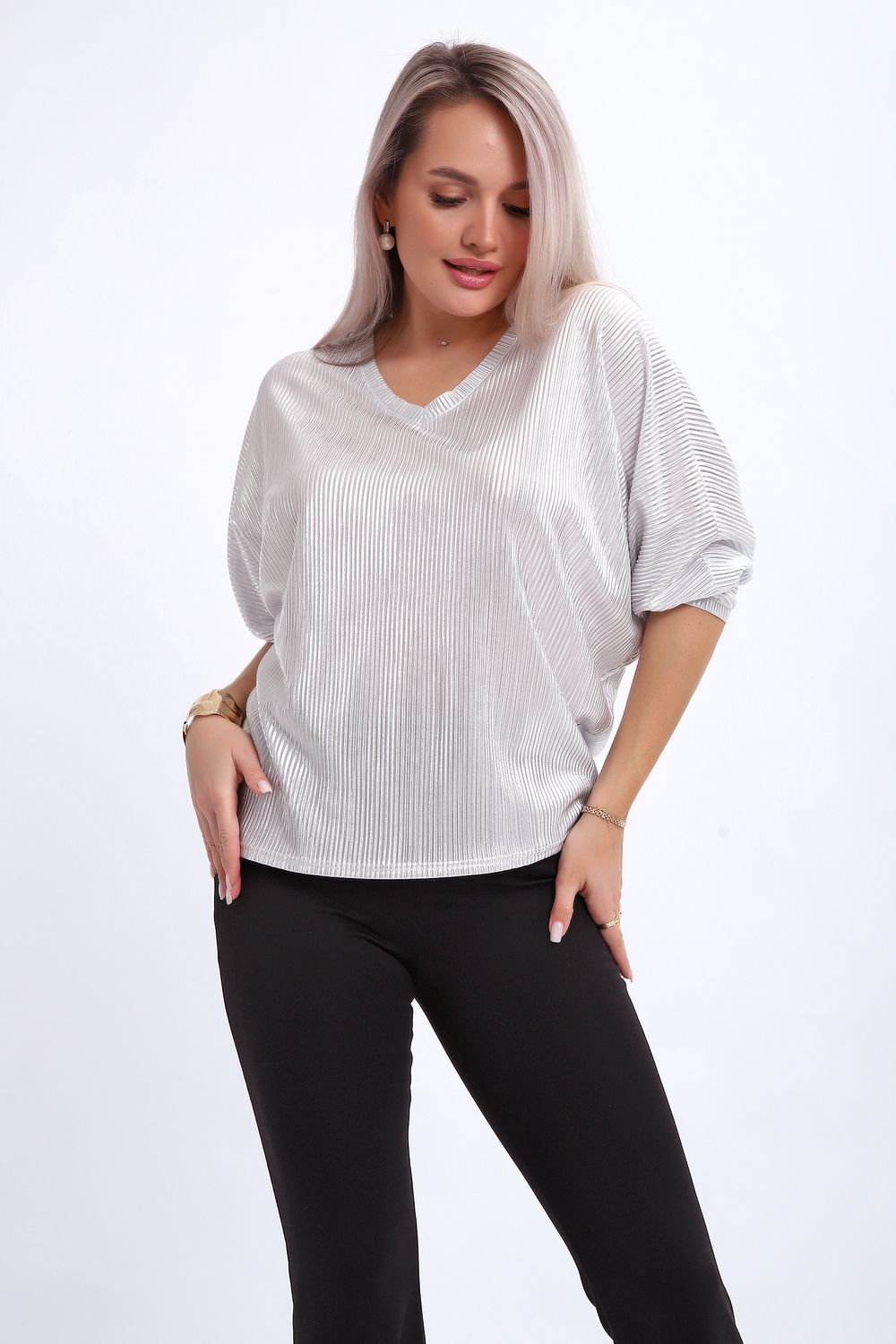 Сделайте акцент на вашем стиле с помощью комфортной и изысканной блузки. Нарядная кофта - это необходимый предмет в любом гардеробе. Благодаря свободному крою, она идеально садится на любую фигуру, скрывая то, что хотелось бы спрятать и подчеркивая достоинства. Блузка выигрышно смотрится за счет ткани атлас гофре со стойким напылением фойл, которое не осыпается в процессе носки и после стирки. Ткань атлас гофре хорошо тянется и драпируется, имеет мягкий благородный блеск и совершенно не мнется. Крой блузки лаконичен, без лишних деталей, рукав "летучая мышь" не сковывает движений, имеет длину 3/4 и оканчивается небольшим манжетом. V-образный воротник зрительно удлиняет шею, обработан обтачкой, длина блузки до линии бедра. Легкая изящная блузка отлично впишется в вечерний наряд, а также будет блестящим дополнением к деловому и повседневному образу.