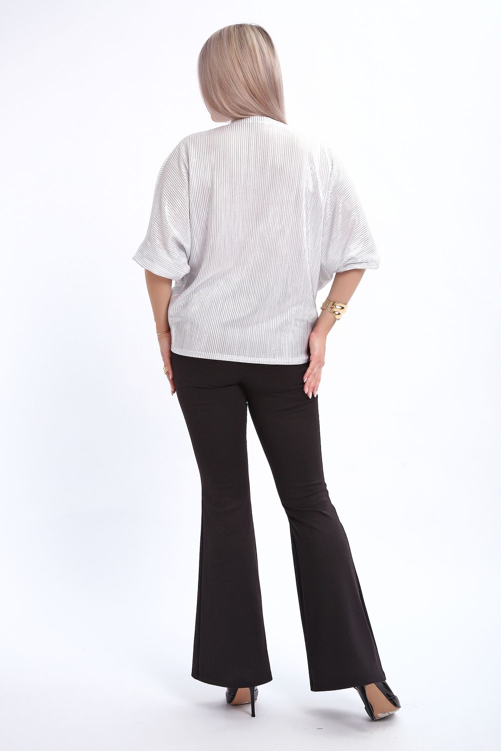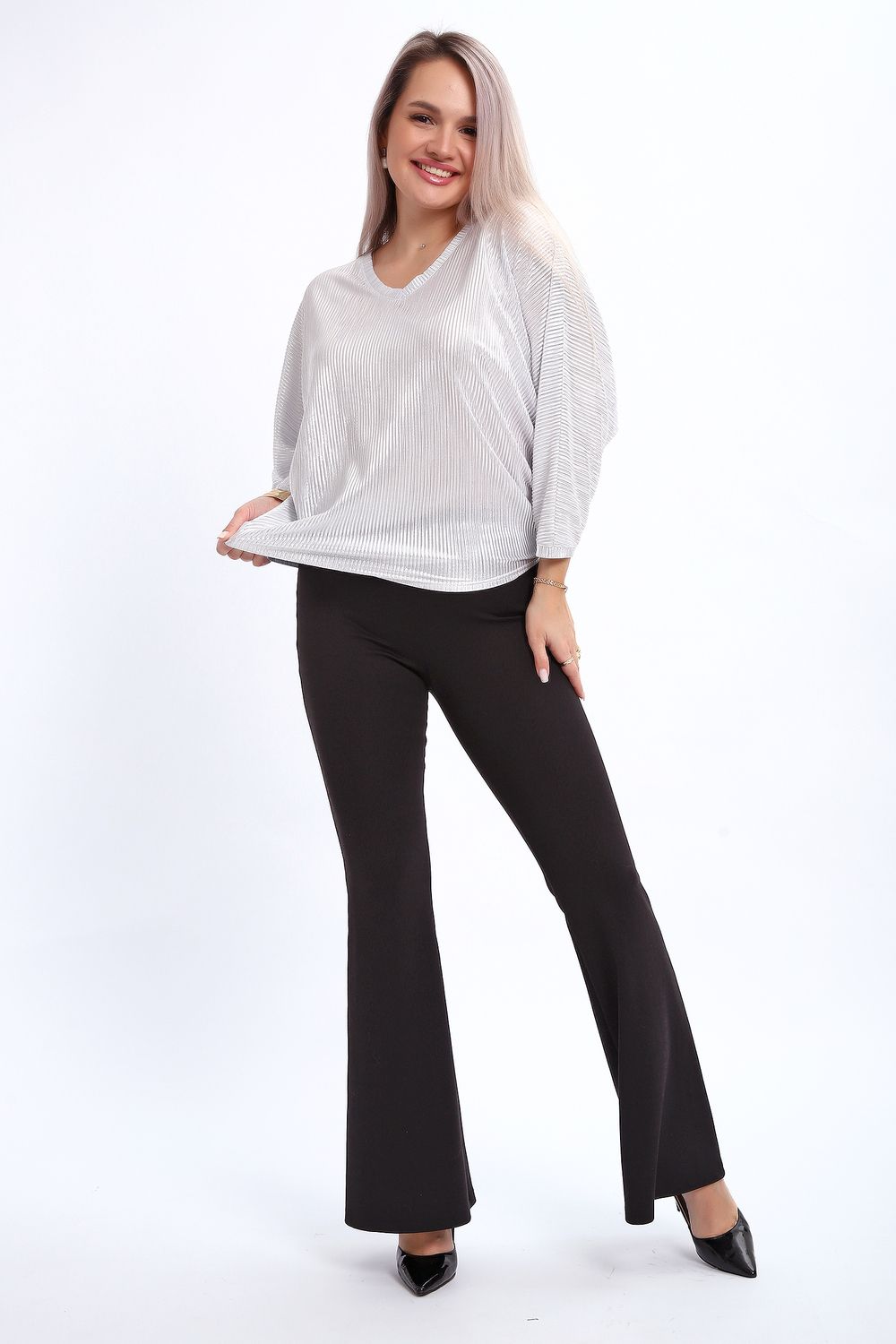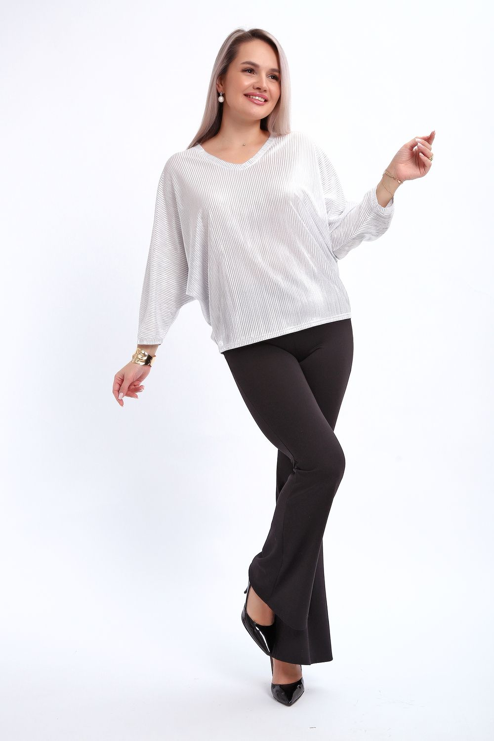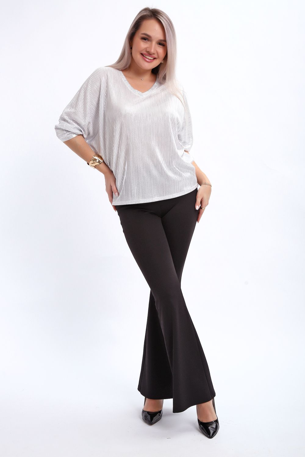 Сделайте акцент на вашем стиле с помощью комфортной и изысканной блузки. Нарядная кофта - это необходимый предмет в любом гардеробе. Благодаря свободному крою, она идеально садится на любую фигуру, скрывая то, что хотелось бы спрятать и подчеркивая достоинства. Блузка выигрышно смотрится за счет ткани атлас гофре со стойким напылением фойл, которое не осыпается в процессе носки и после стирки. Ткань атлас гофре хорошо тянется и драпируется, имеет мягкий благородный блеск и совершенно не мнется. Крой блузки лаконичен, без лишних деталей, рукав "летучая мышь" не сковывает движений, имеет длину 3/4 и оканчивается небольшим манжетом. V-образный воротник зрительно удлиняет шею, обработан обтачкой, длина блузки до линии бедра. Легкая изящная блузка отлично впишется в вечерний наряд, а также будет блестящим дополнением к деловому и повседневному образу.