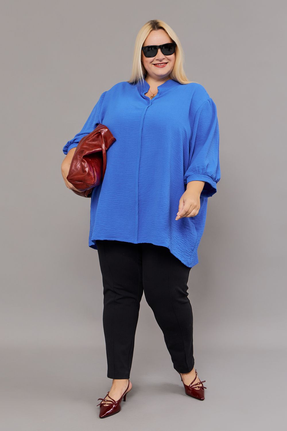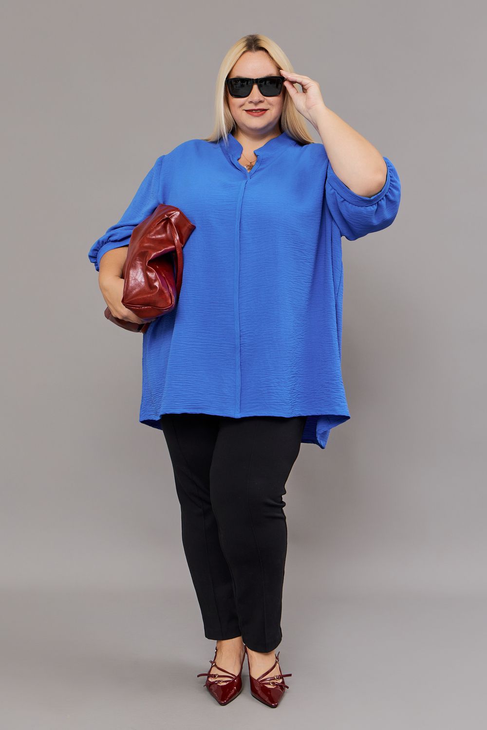 Блузка женская больших размеров – это идеальный выбор для комфорта и стиля в тёплые весенние и летние дни. Эта удлиненная блузка выполнена из мягкой ткани, что делает её невероятно приятной к телу и обеспечивает превосходную вентиляцию. Классический крой рукава и гладкая фактура материала создают элегантный и универсальный образ, подходящий как для повседневной носки, так и для особых случаев. Блузка украшена стильной окантовкой, которая добавляет ей изюминку. Однотонный цвет придает блузке оригинальность и индивидуальность. Блузка прекрасно садится по фигуре, подчеркивая достоинства и скрывая недостатки. Модель доступна в широком диапазоне размеров, что позволяет каждой женщине найти свой идеальный вариант. Эта блузка станет незаменимой вещью в гардеробе любой женщины, ценящей комфорт и стиль.