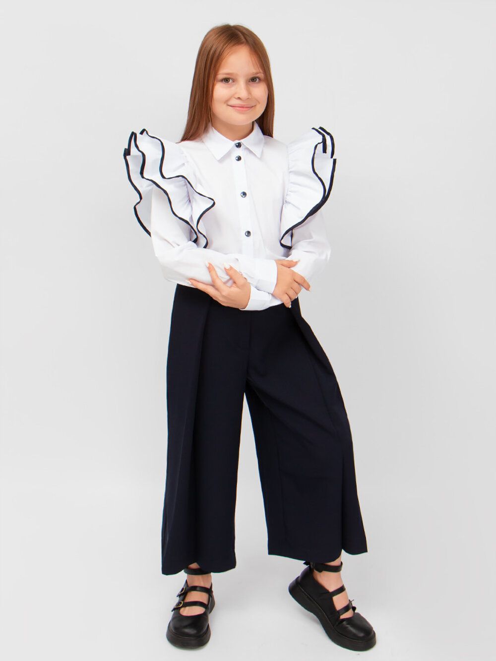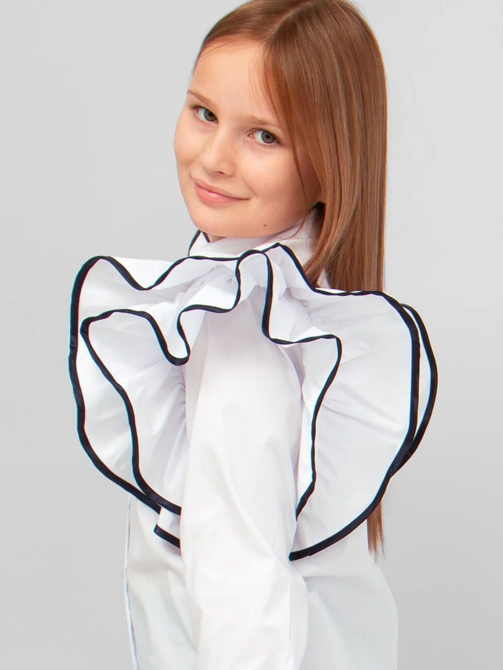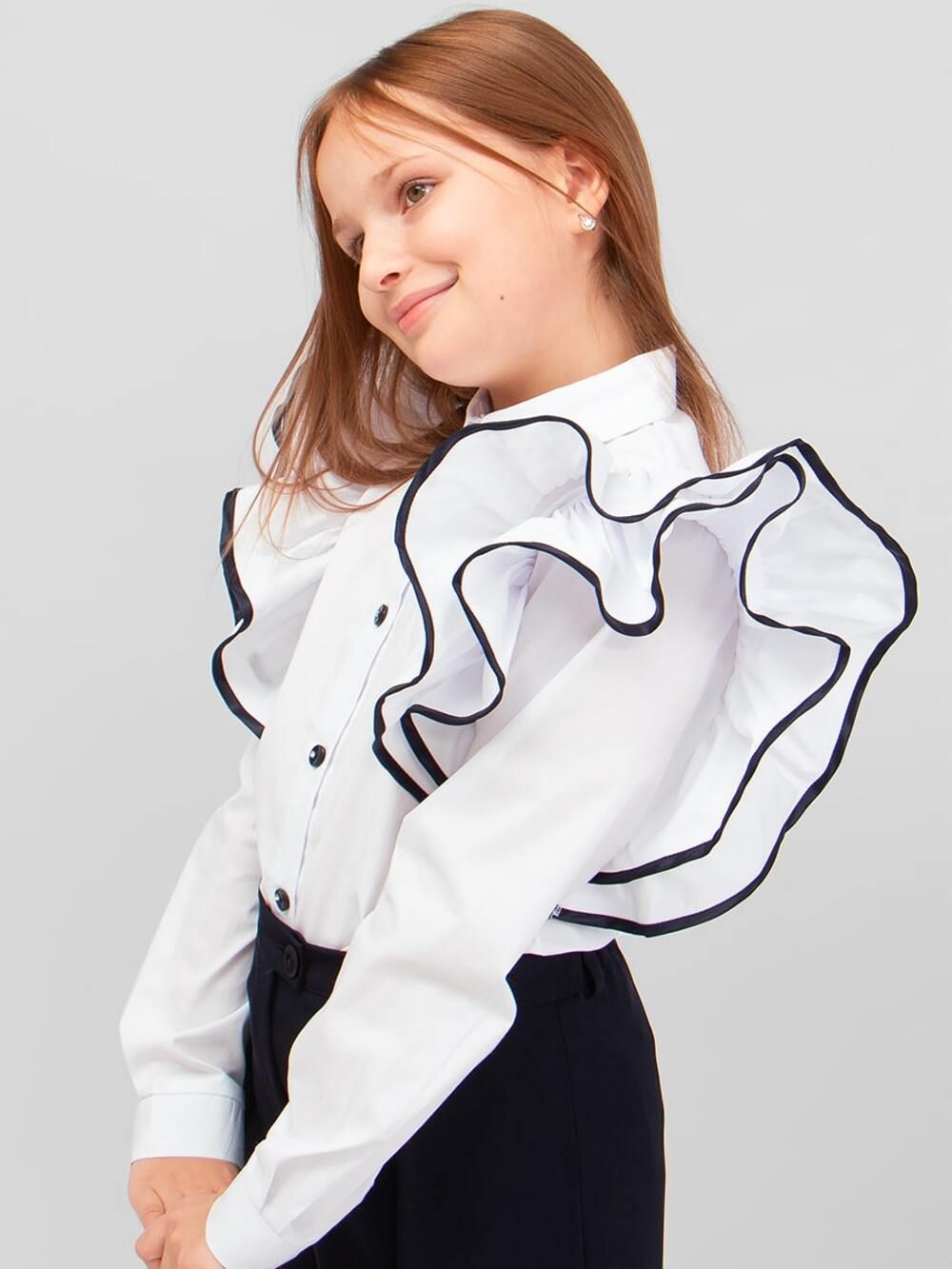 Блузка для девочки. Модель с декоративной отделкой, плечи украшены пышными воланами, планка с застежкой на пуговицы. Блузка отлично сочетается с брюками, юбками и сарафанами. Прекрасно подойдет для создания эффектного школьного образа.