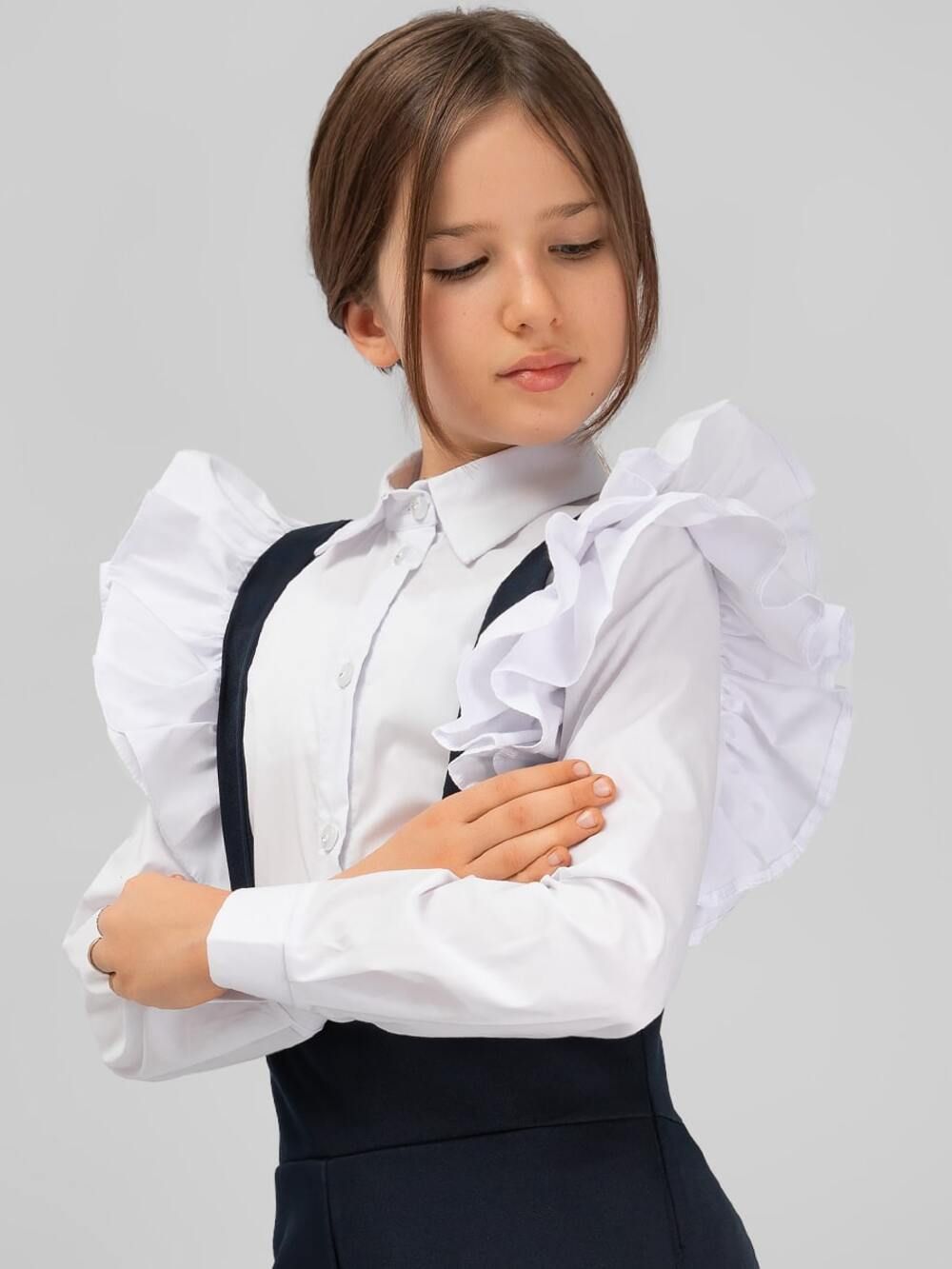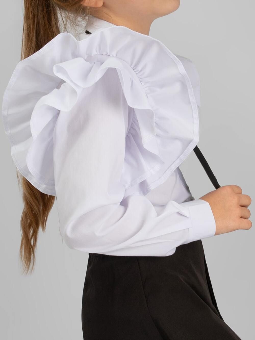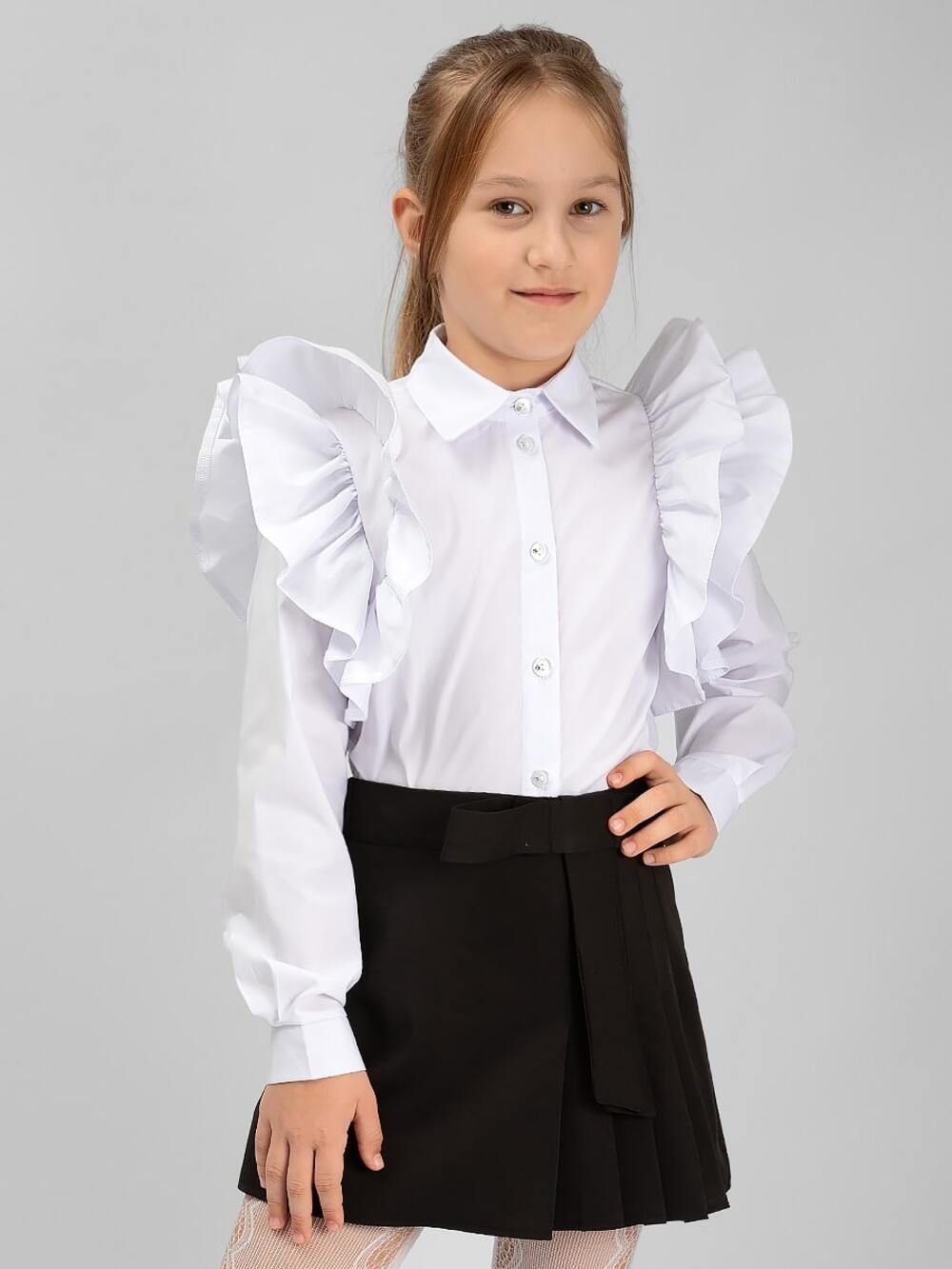 Блузка для девочки Соль&Перец. Модель с декоративной отделкой, плечи украшены пышными воланами, планка с застежкой на пуговицы. Блузка отлично сочетается с брюками, юбками и сарафанами. Прекрасно подойдет для создания эффектного школьного образа.