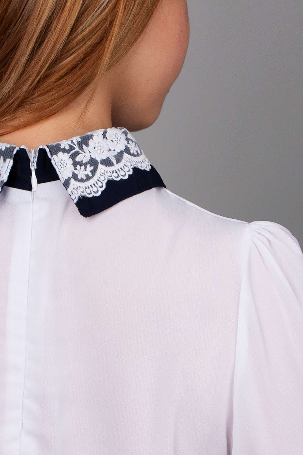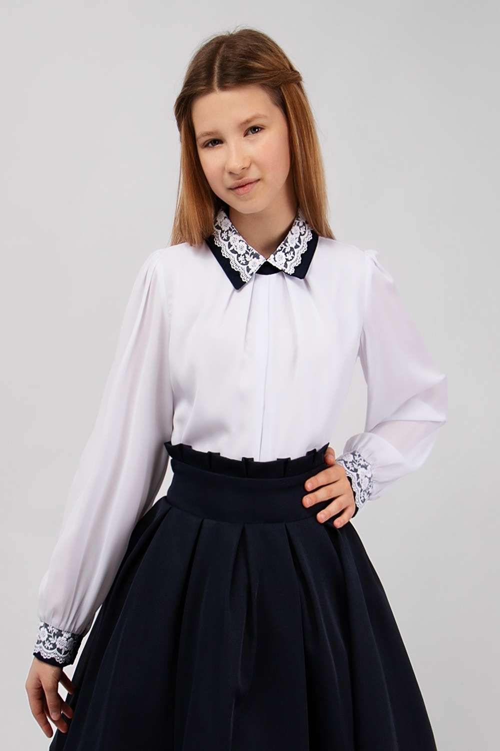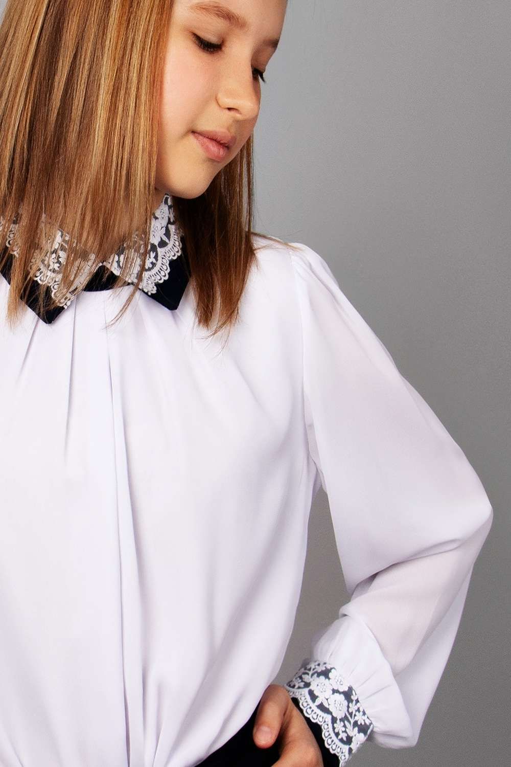 Элегантная блузка свободного силуэта для девочки. Отложной воротник и манжеты на рукавах оформлены кружевным декором. На спине застежка - молния, передняя часть блузки с подкладом. Прекрасный выбор для создания красивого школьного образа.