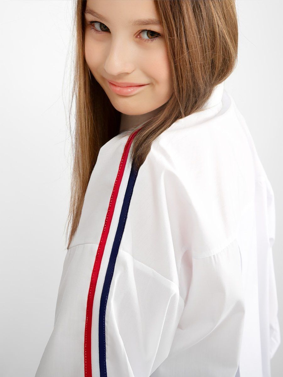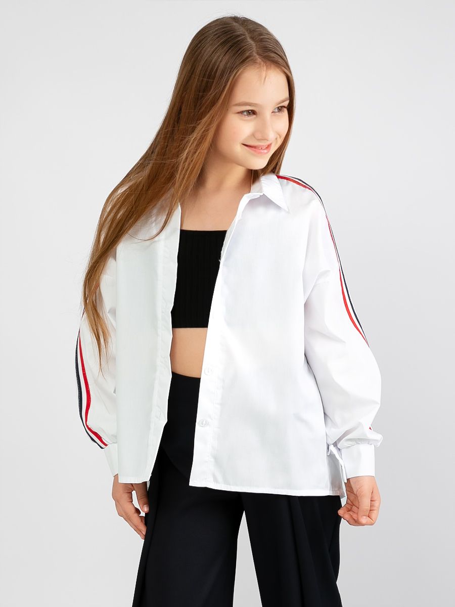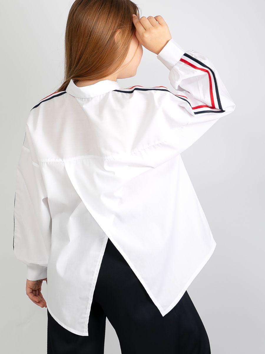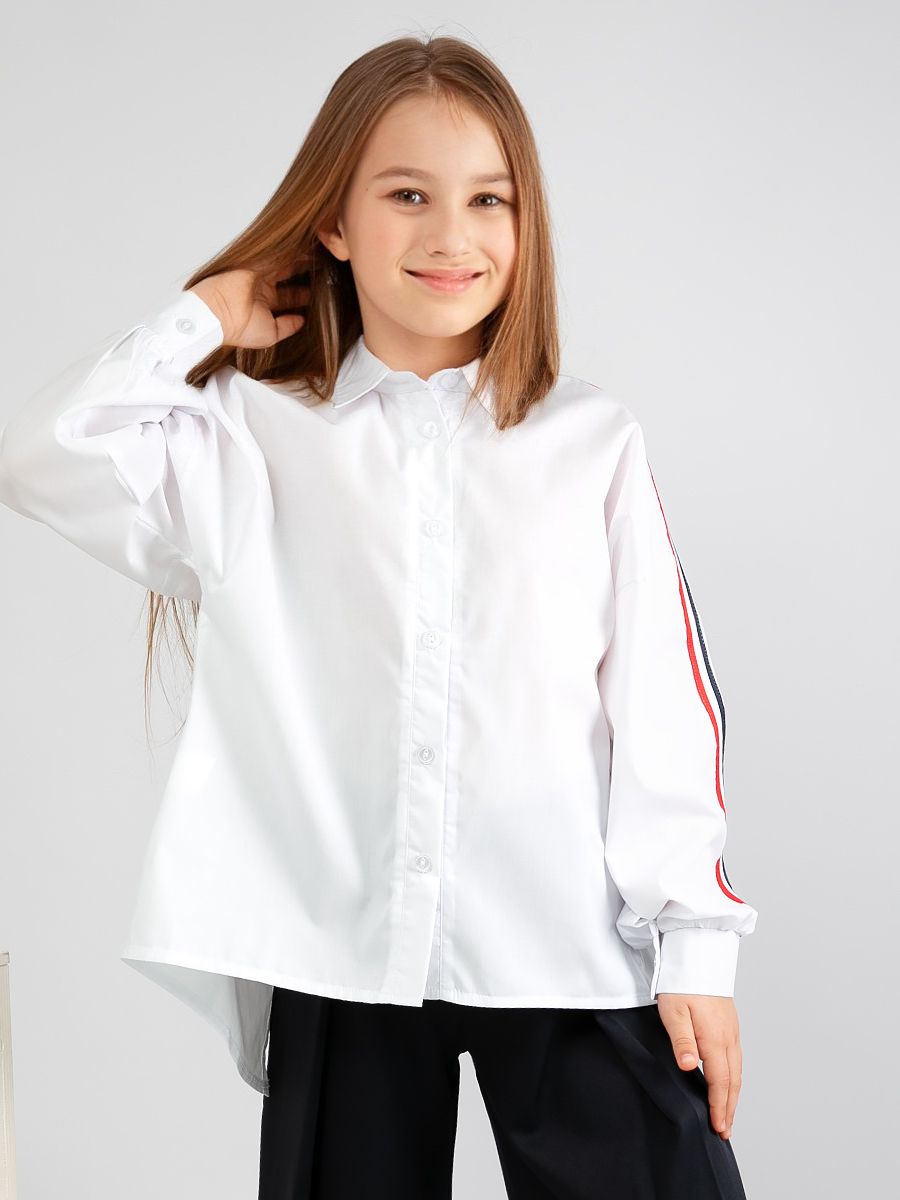 Блузка для девочки Соль&Перец, модель оверсайз, на пуговицах. Удлиненная спинка с разрезом, рукав-реглан с лампасами, линия плеча приспущена. Блузка прекрасно сочетается как с брюками, так и с юбкой, подчеркнет индивидуальный стиль девочки, и разнообразит ее повседневный школьный образ.
