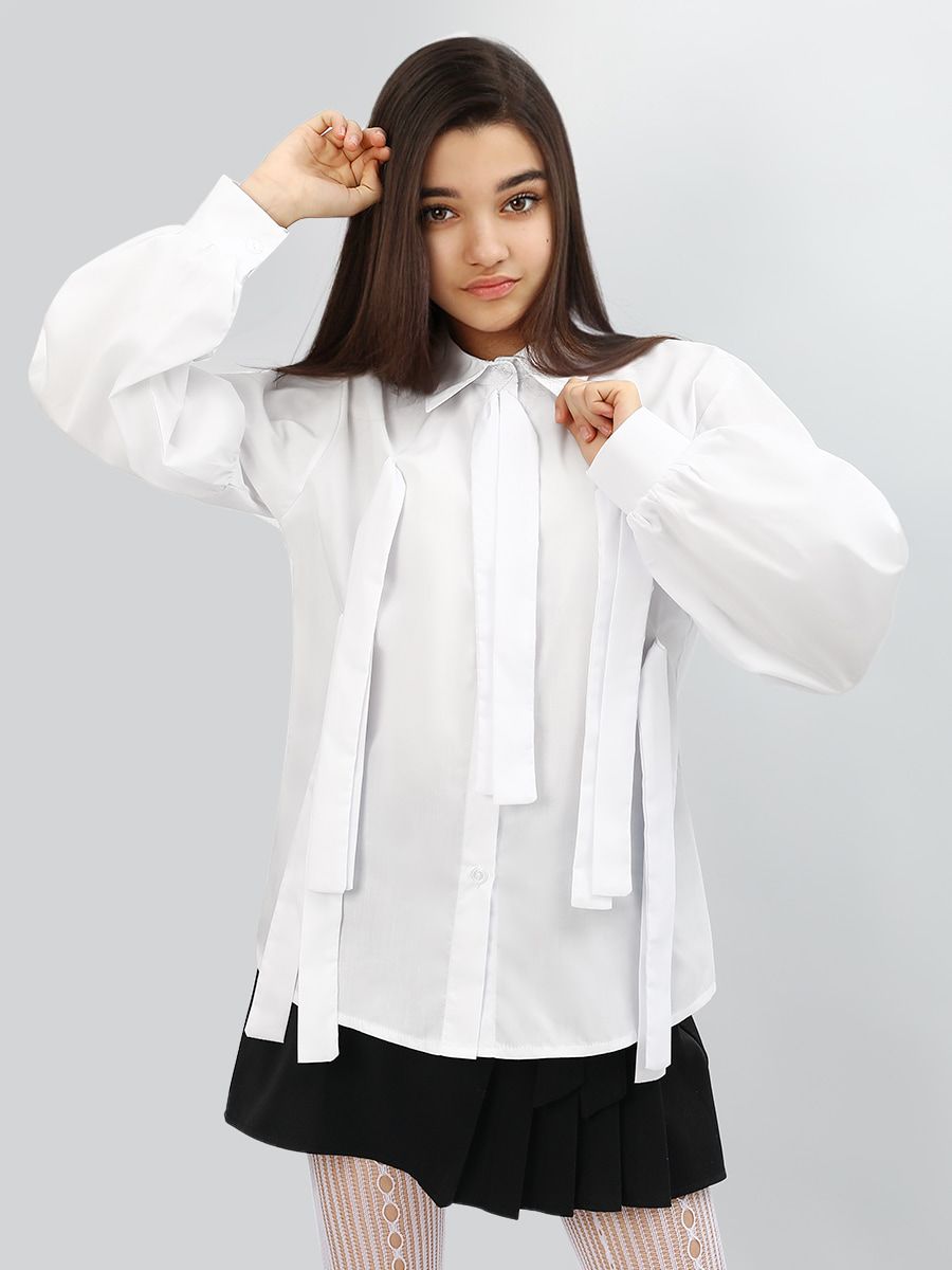 Блузка для девочки Соль&Перец, на пуговицах, из натурального хлопка. Особенностью блузки являются пышные рукава фонарики и пришитые ленты из основной ткани, которые добавляют ей изящества и уникальности. Блузка прекрасно сочетается с брюками или с юбкой, подчеркнёт индивидуальный стиль девочки, и разнообразит ее повседневный школьный образ.