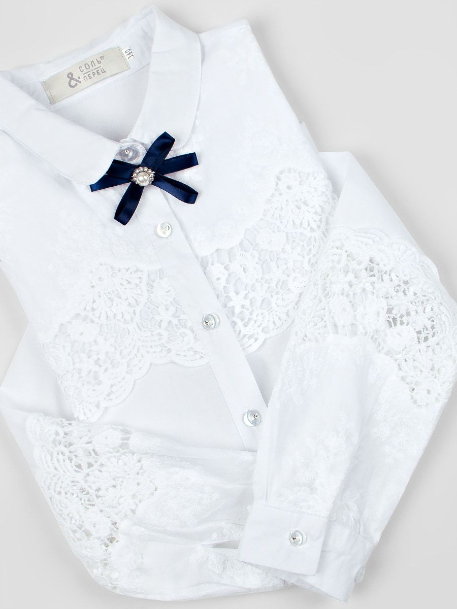 Блузка на пуговицах приталенного силуэта. Пуговицы дополнены стразами, передняя часть и рукава декорированы кружевом и вышивкой. Модель дополнена съёмной брошью. Классический элемент школьной формы прекрасно вольется в гардероб каждой девочки.