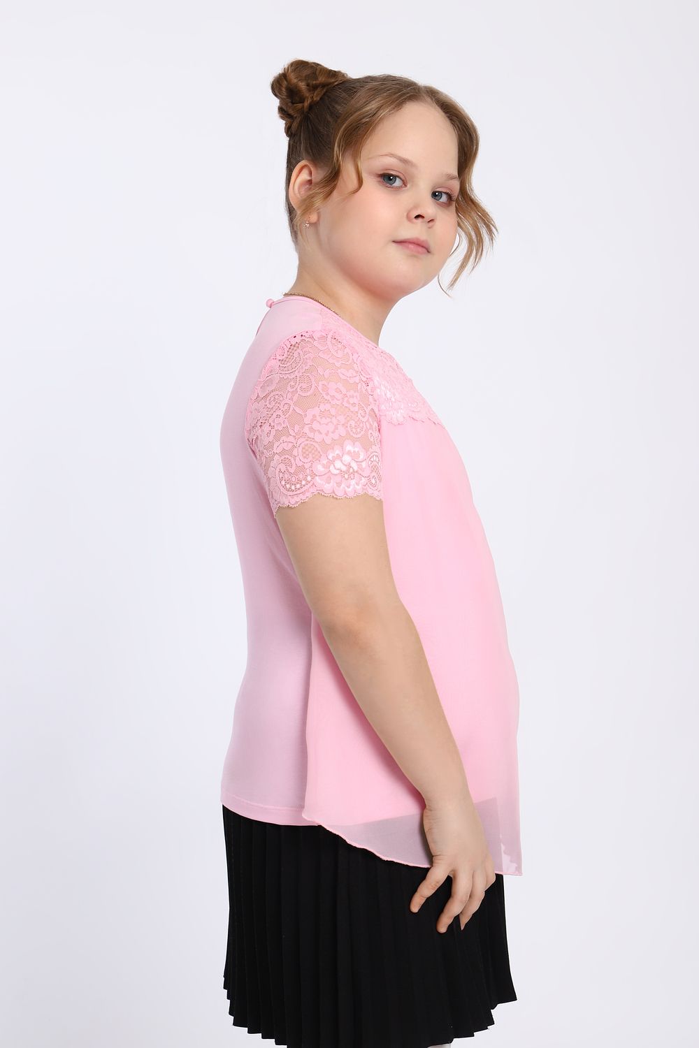 Блузка трикотажная для девочки - вторая полнота! С красивой кружевной кокеткой и верхним слоем из шифона в тон блузке. Рукав кототкий - кружевной. Застегивается сзади на пуговку. Дополнительный шифоновый слой позволяет скрыть все нюансы фигуры. Силуэт свободный. Смотрится нарядно и подходит как для повседневной носки, так и для торжественных мероприятий. Будет находкой в гардеробе стильной школьницы. Выполнена из высококачественного турецкого трикотажного полотна состава 95% хлопок, 5% эластан. Мягкий и нежный трикотаж приятен к телу. Подойдет как школьная форма, нарядная и даже повседневная одежда для девочки. Стильные, модные блузки могут быть использованы как элемент к школьным сарафанам, юбкам и брюкам. Нарядные и строгие блузки школьные помогут сделать наряд школьницы привлекательным и элегантным.