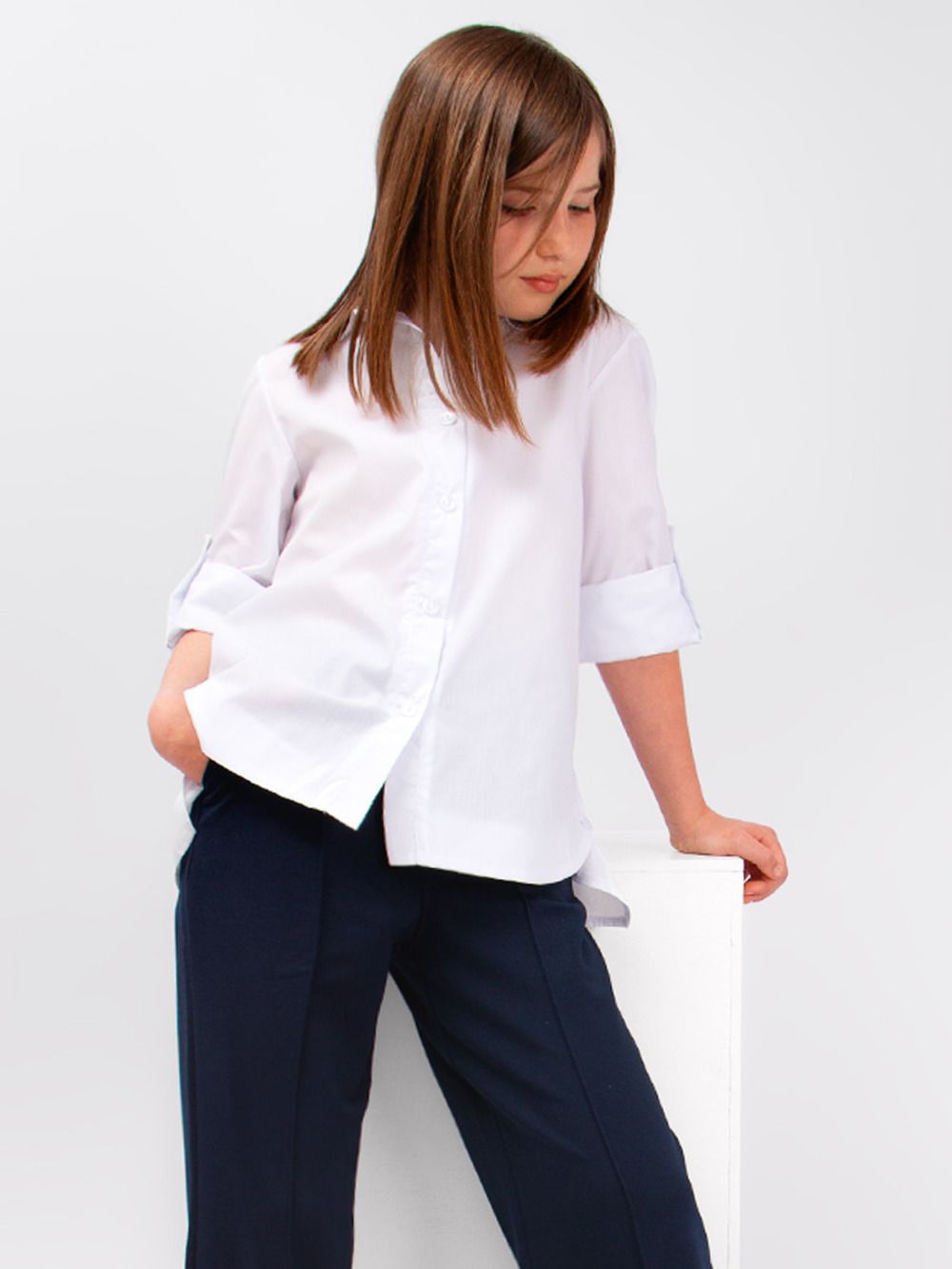 Блузка для девочки Соль&Перец на пуговицах. Асимметричная линия низа, рукава трансформируются в 3/4. Блузка прекрасно сочетается как с брюками, так и с юбкой, подчеркнет индивидуальный стиль девочки, и разнообразит ее повседневный школьный образ.
