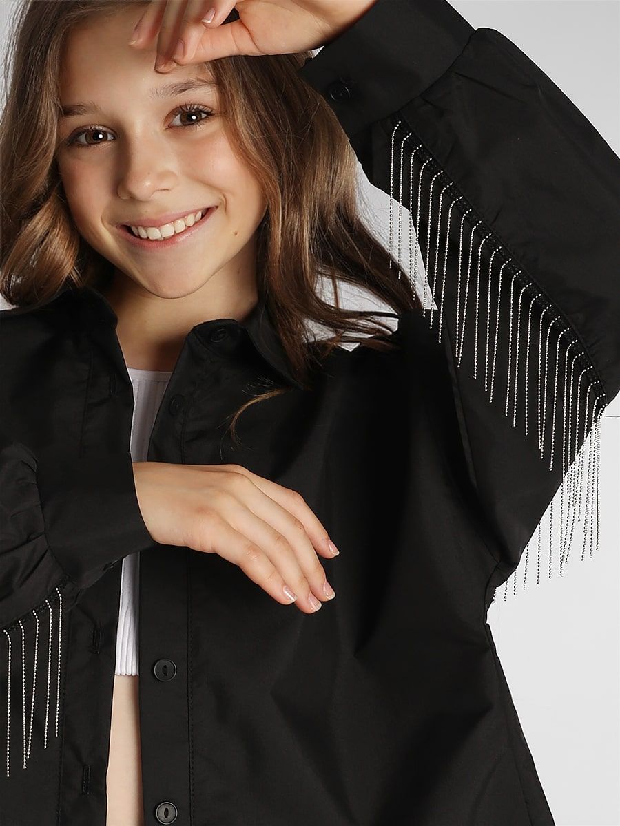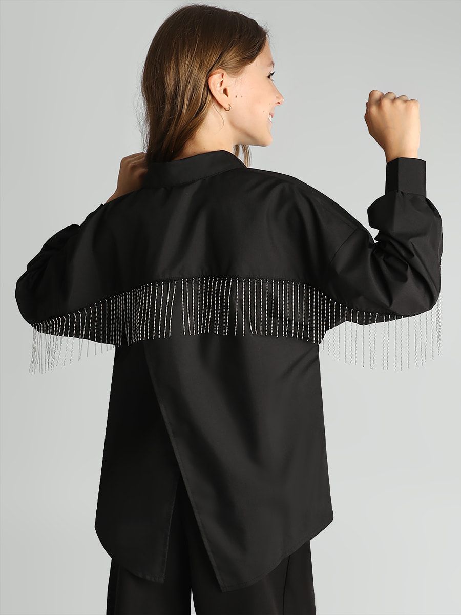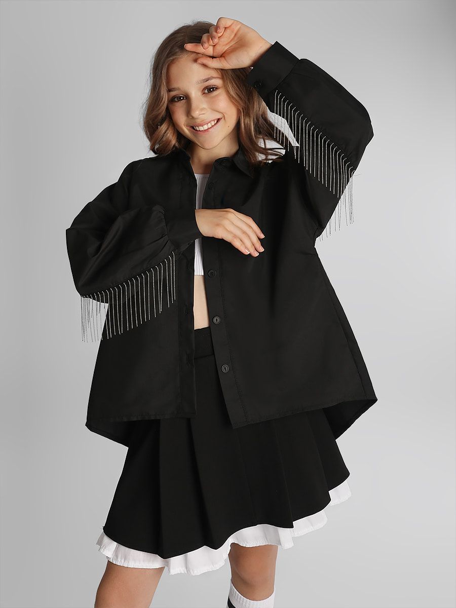 Блузка для девочки Соль&Перец, модель оверсайз, на пуговицах. Удлиненная спинка с эффектным декором и разрезом, рукав-реглан, линия плеча приспущена. Блузка прекрасно сочетается как с брюками, так и с юбкой, подчеркнет индивидуальный стиль девочки, и разнообразит ее повседневный школьный образ.