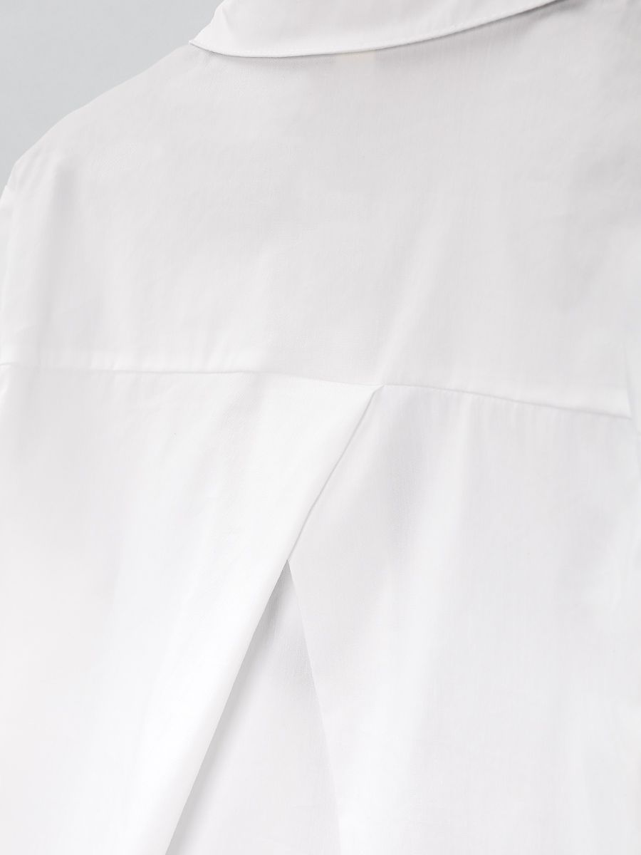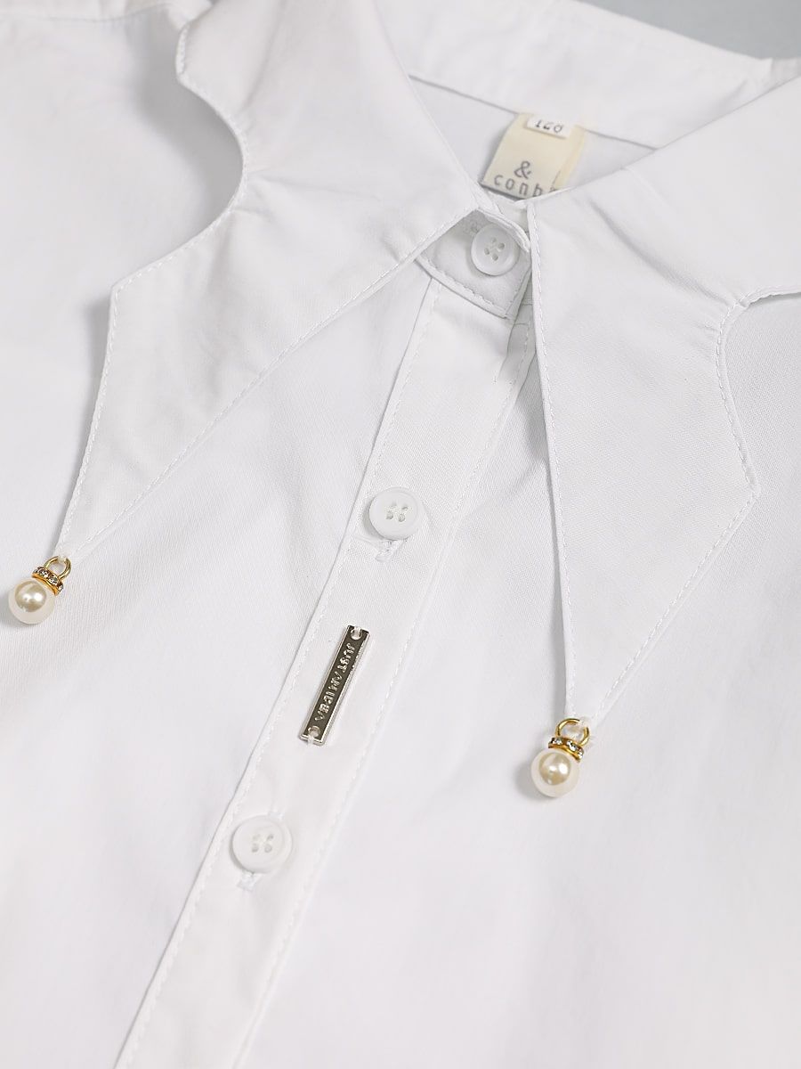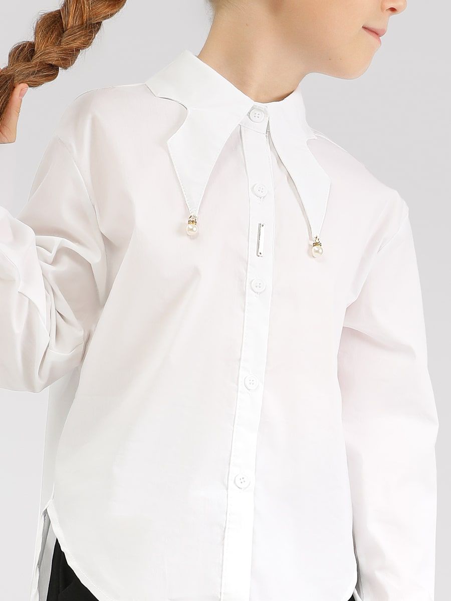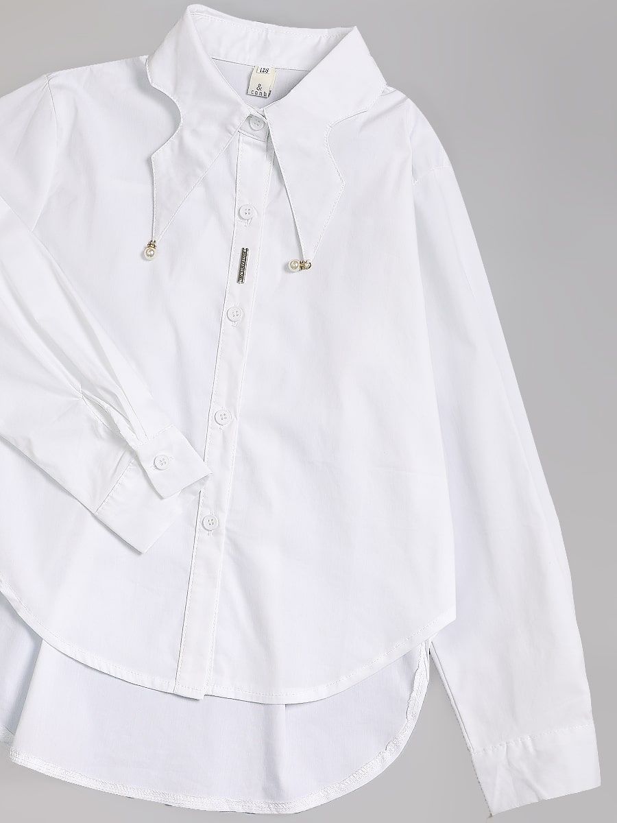 Блузка для девочки Соль&Перец, на пуговицах, с удлинённой спинкой. Отложной, фигурный воротник декоирован бусиной со стразами. Ткань-бенгалин. Эластан, входящий в состав материала, обеспечит идеальную посадку изделия по фигуре. Классический элемент школьной формы прекрасно дополнит гардероб каждой девочки.
