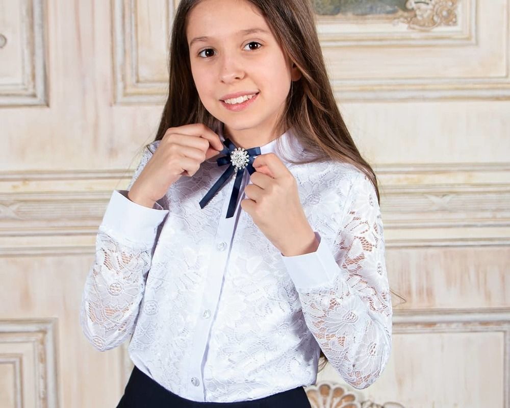 Передняя часть и рукава выполнены из кружева, спинка и подклад из ткани (вискоза). Спандекс, входящий в состав материала, обеспечит идеальную посадку изделия по фигуре. Легко сочетается с юбками или брюками и идеально подойдет как для школы, так и для торжественного мероприятия.