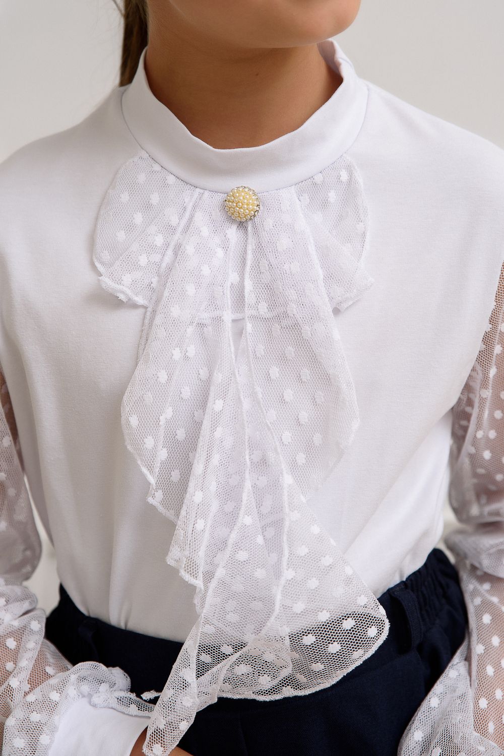 Блузка школьная для девочек с длинными рукавами из фатина. Красивый джемпер для девочек с жабо на каждый день.