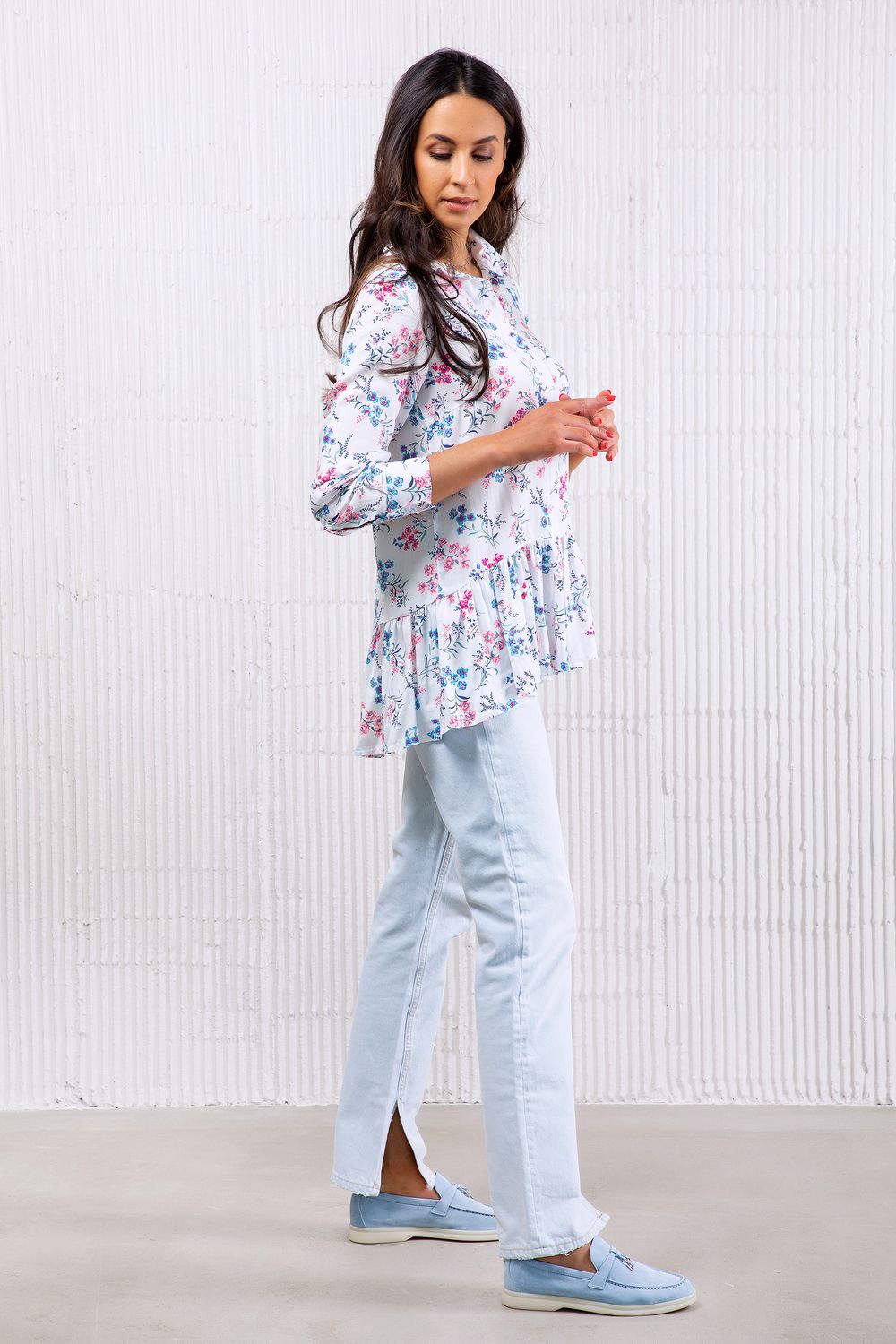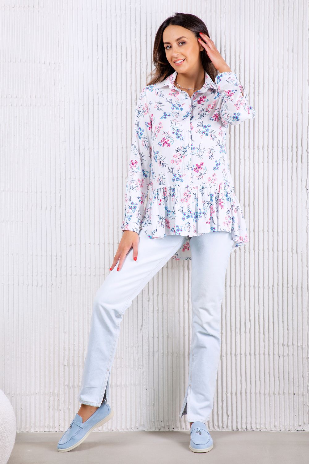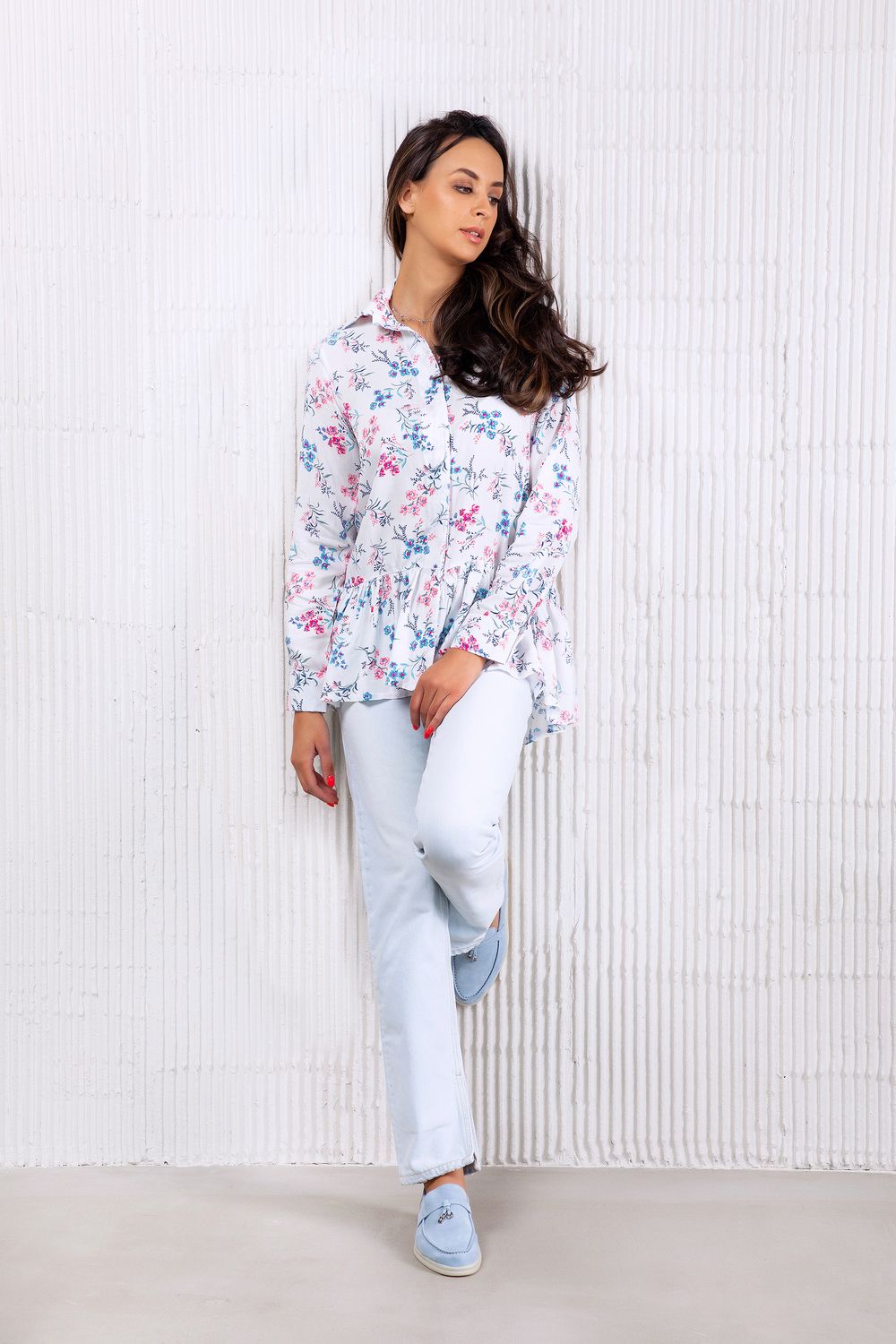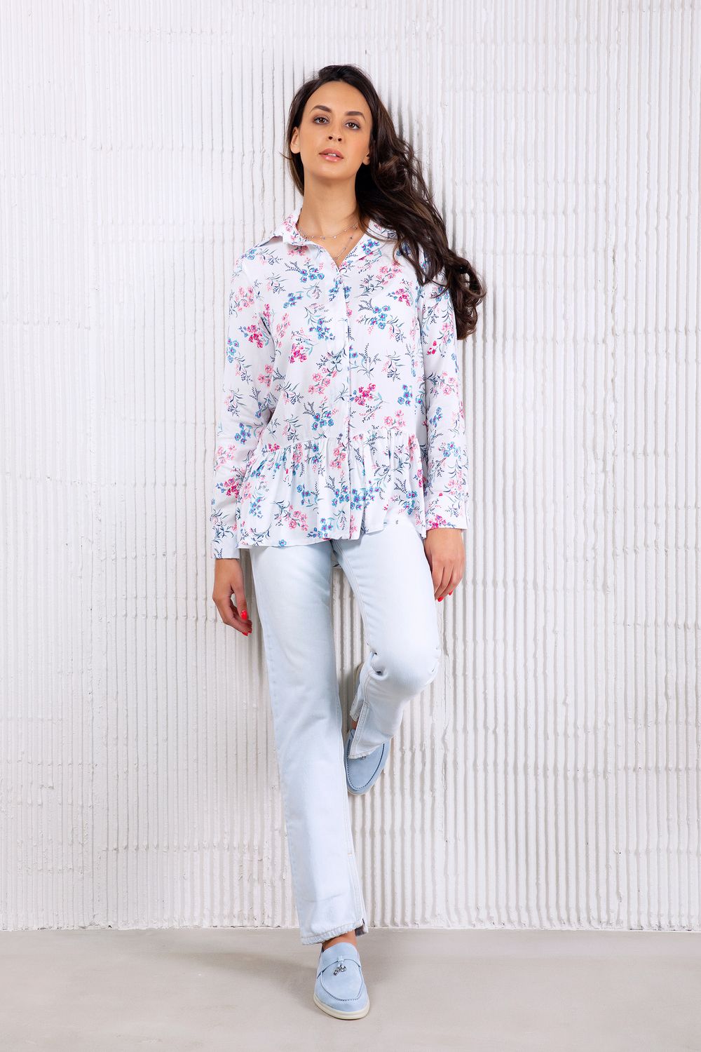 Блузка с длинным рукавом и баской 320WHT - белый/цветы