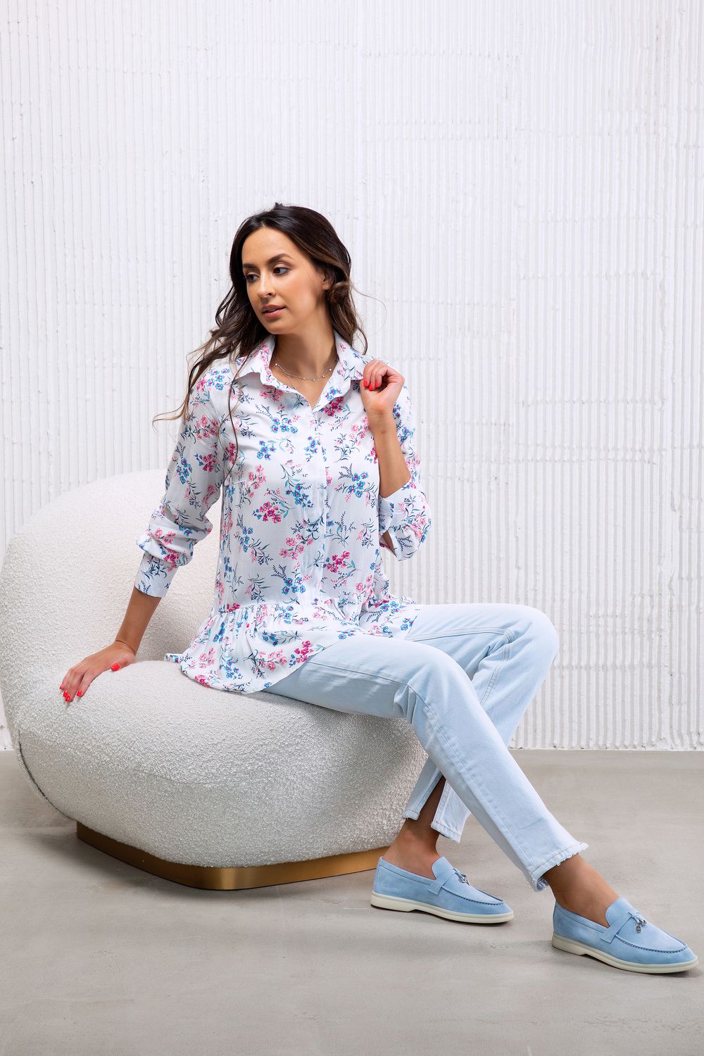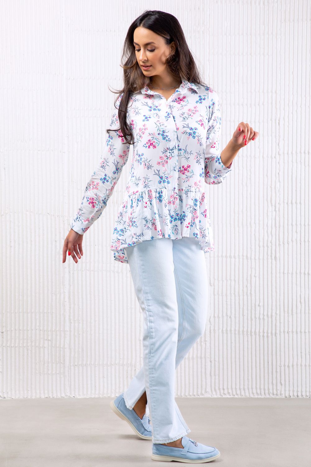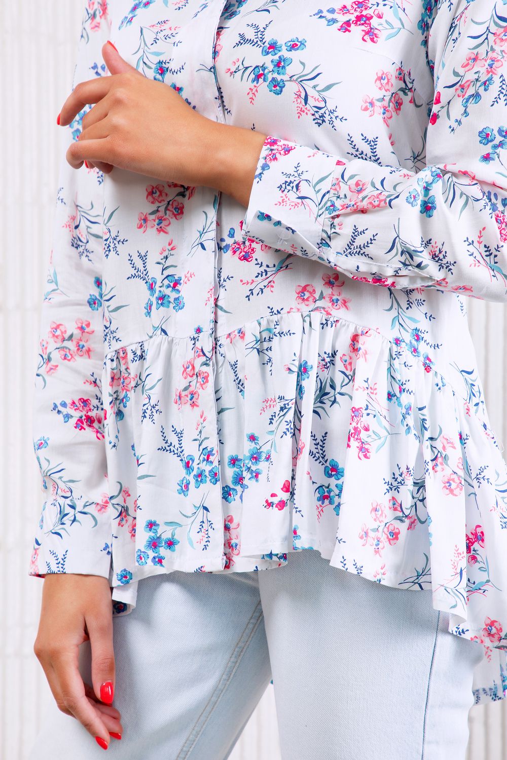 Блузка с длинным рукавом и баской 320WHT - белый/цветы