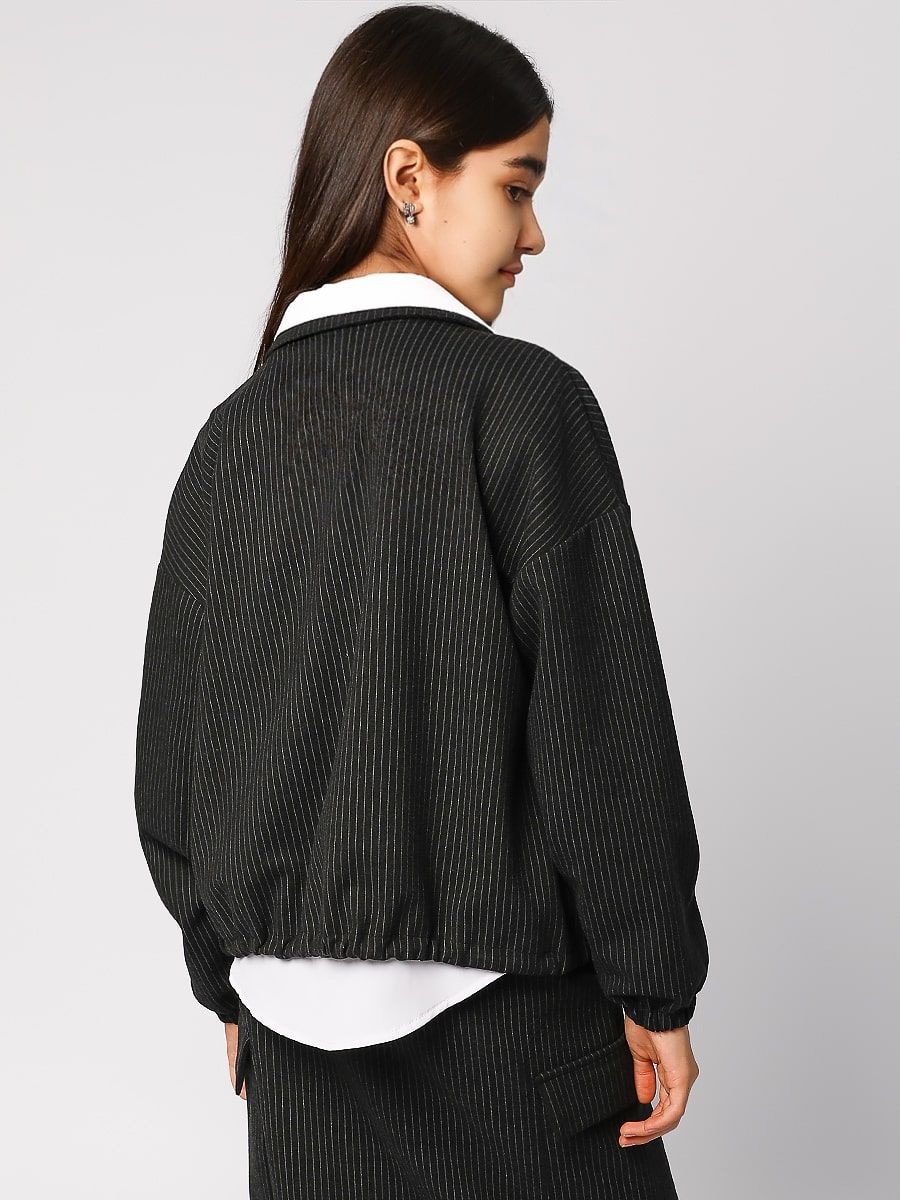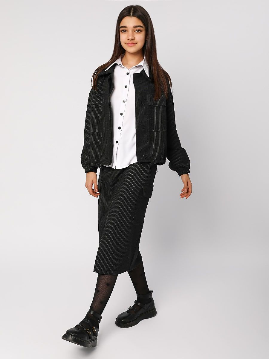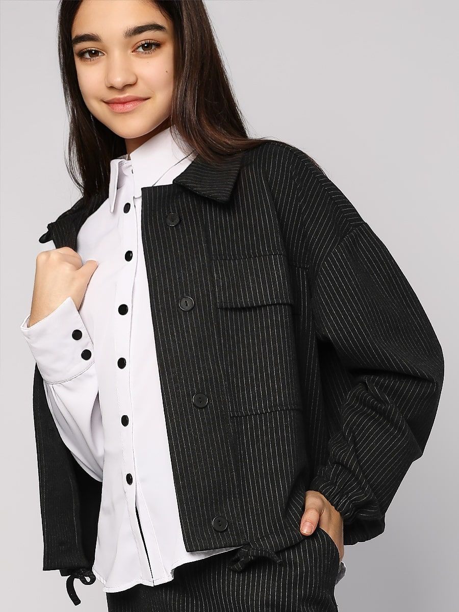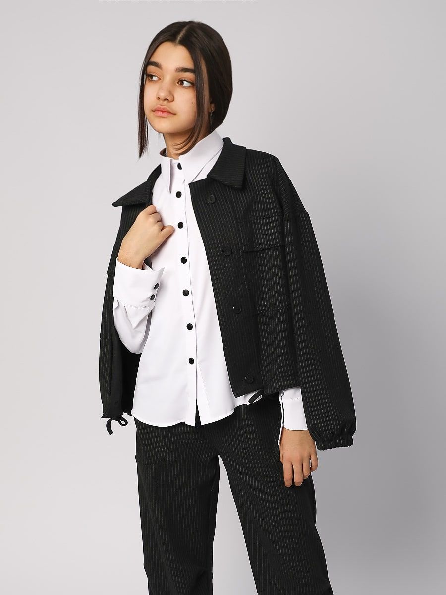 Бомбер для девочки Соль&Перец на пуговицах с потайной планкой, отложным воротником и большими накладными карманами с клапаном. Рукава на мягкой эластичной резинке, низ бомбера дополнен кулиской. Бомбер выполнен из износостойкой трикотажной ткани которая долго сохраняет форму и привлекательный внешний вид. Бомбер прекрасно сочетается с юбками и брюками. Подойдёт для посещения школы, официального или праздничного мероприятия.