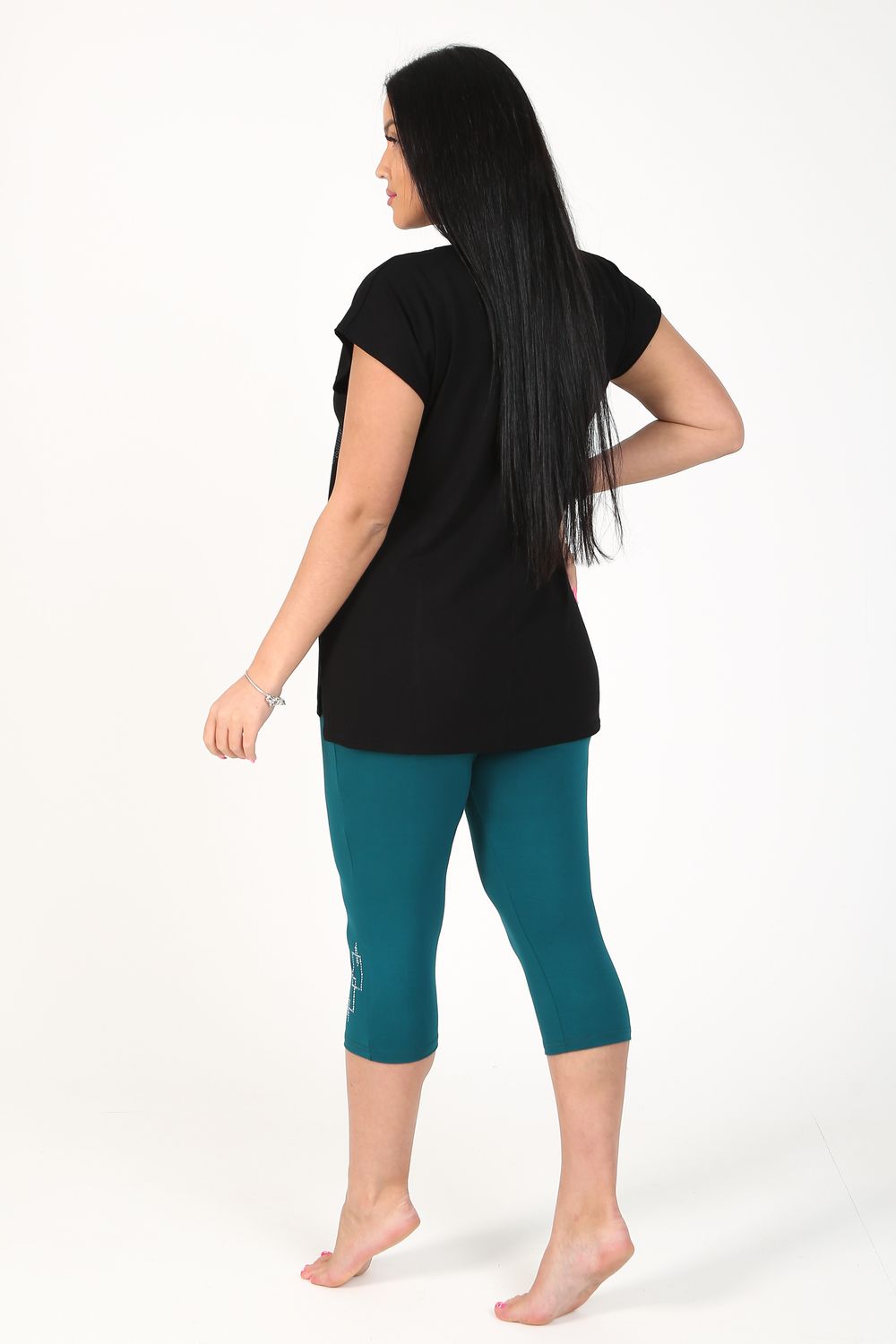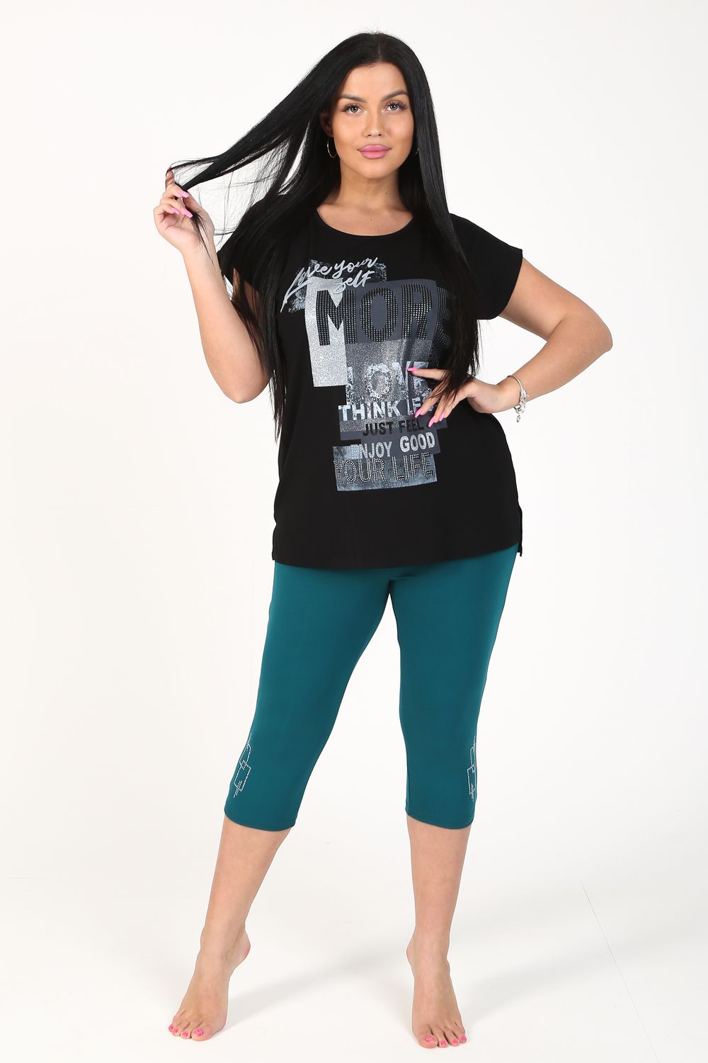 Бриджи облегающего силуэта из вискозы, длина чуть ниже колена, пояс на резинке, удобная высокая посадка. По переду в нижней части расположен декоративный узор из страз. Изготовлена модель из стрейчевого, комфортного, износостойкого трикотажного полотна в трёх расцветках на Ваш выбор.