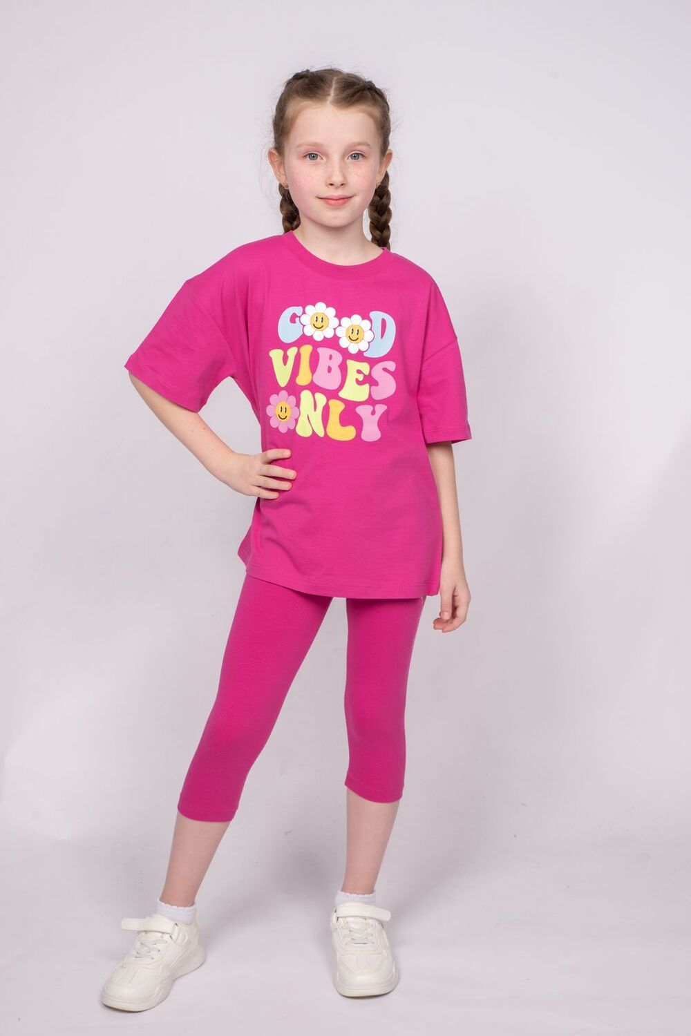 Бриджи для девочки прилегающего силуэта из гладкокрашеного полотна. Пояс цельнокроенный, с эластичной тесьмой внутри, закрепленной в шов. Низ бридж обработан швом в подгибку. На передней половинке бридж принт радужный глиттер.
