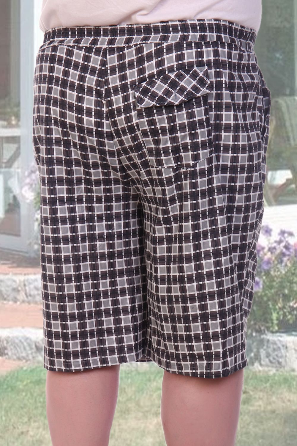 Мужские бриджи. Клетчатый дизайн, ткань-шотландка 100% хлопок. Свободного покроя. Пояс отрезной, собранный на широкой резинке с отстрочкой. Карманы внутренние, боковые и 1 задний накладной карман с клапаном. Длина чуть ниже колена. Данный товар не подбирается по цветам.