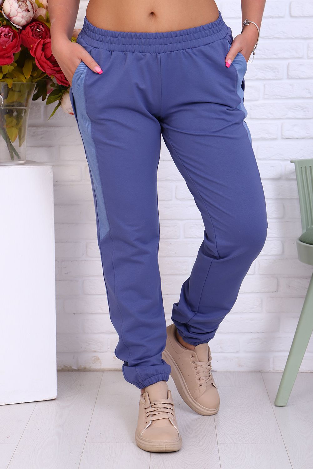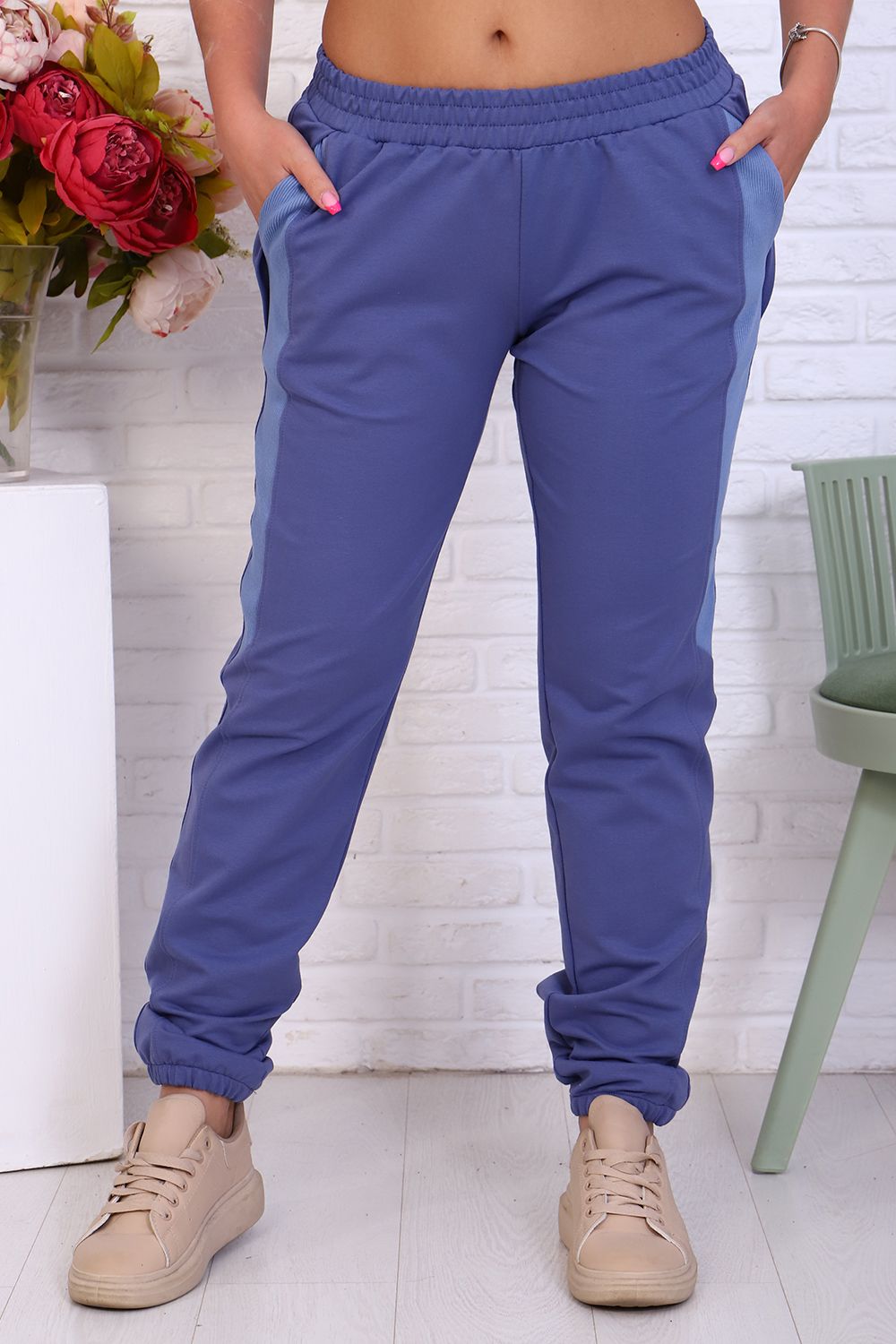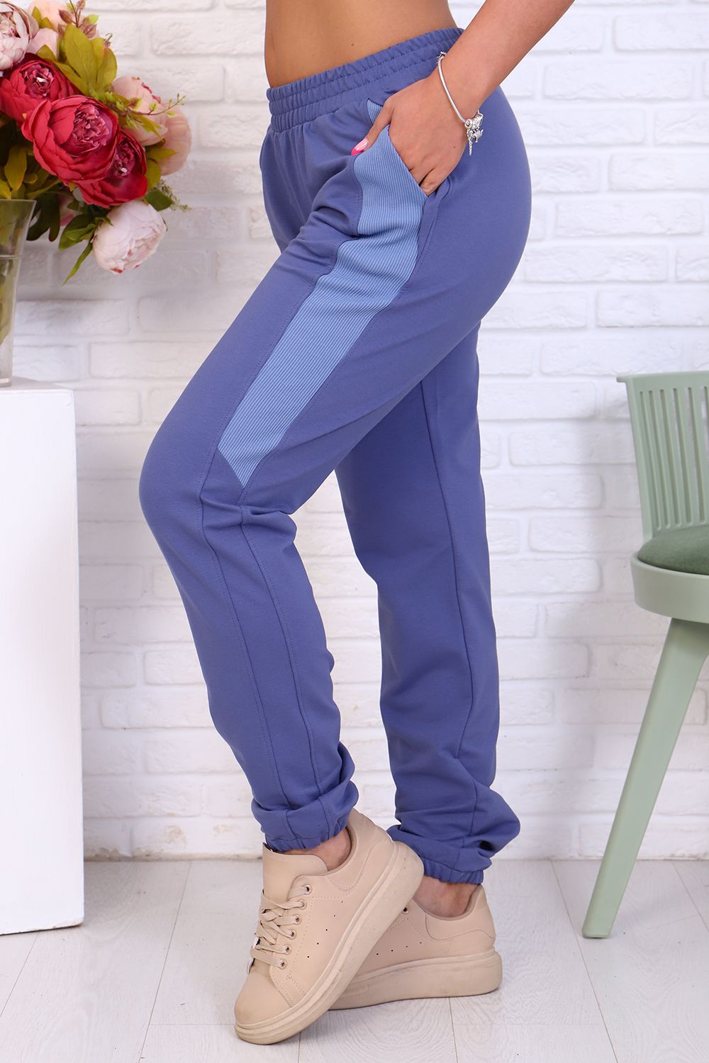 Брюки женские из футера 2-х нитка. Модель полуприлегающего силуэта на эластичном поясе с боковыми карманами. Вдоль бокового шва расположен лампас из отделочного полотна с фигурной вставкой, низ брюк обработан резинкой. Модель идеально подойдет для женщин, девушек как для дома, так и для прогулок.
