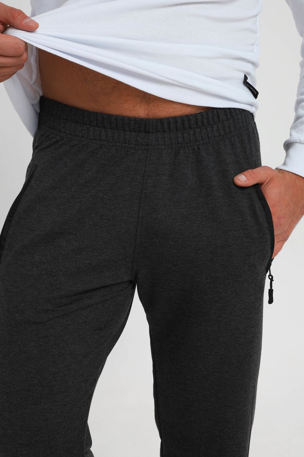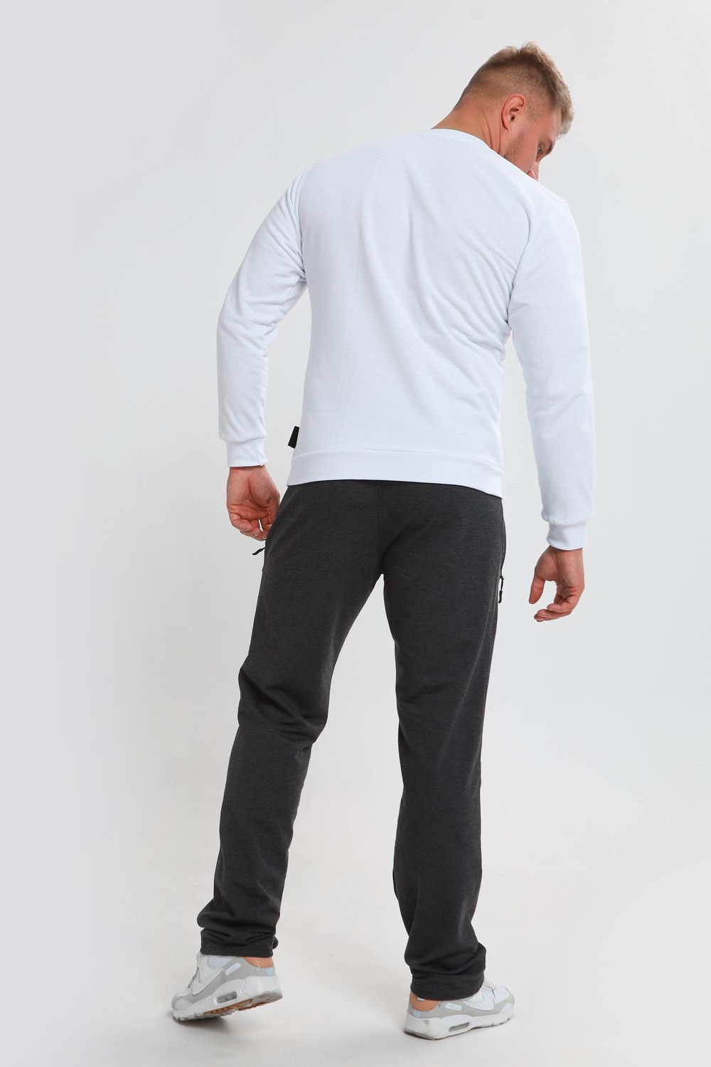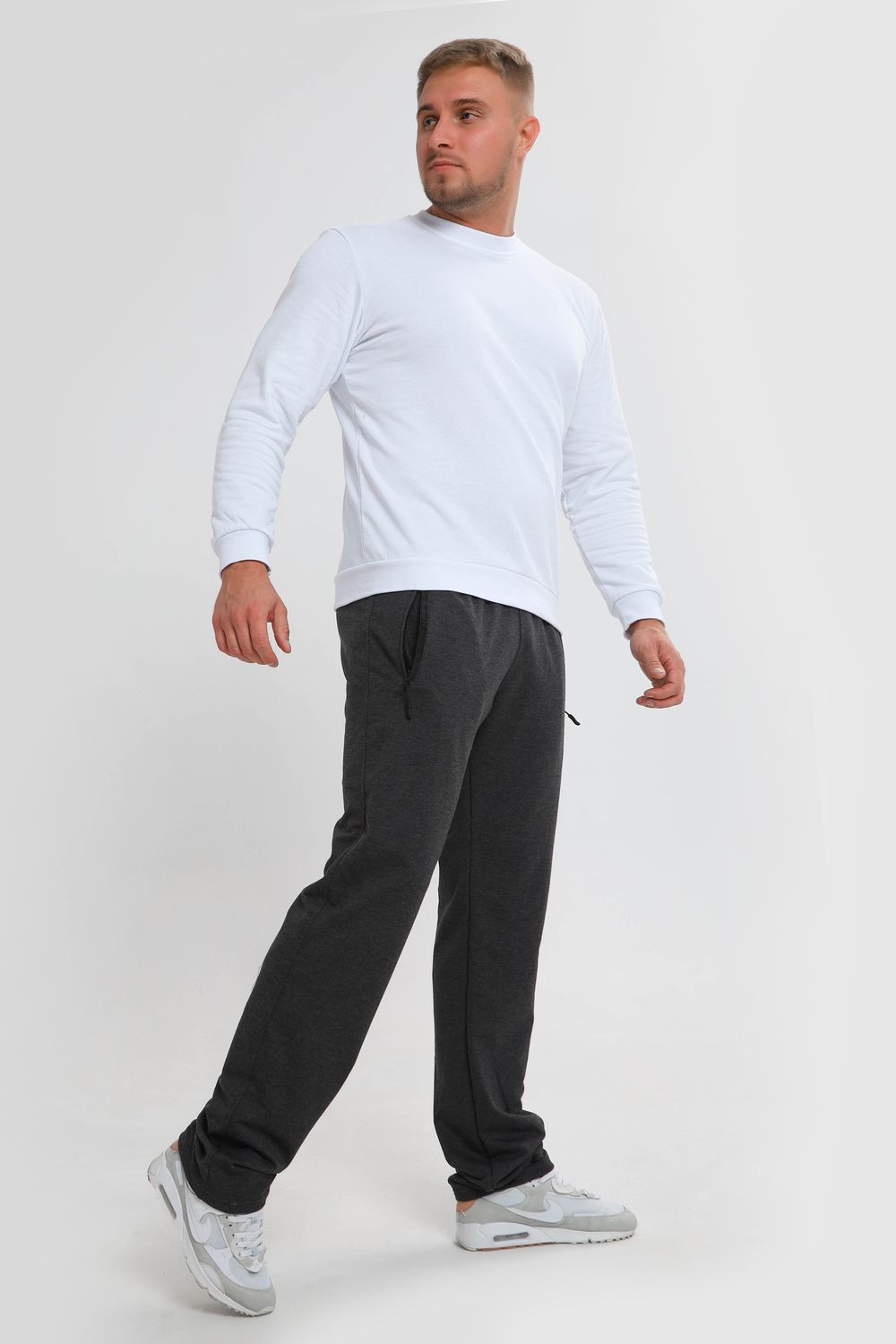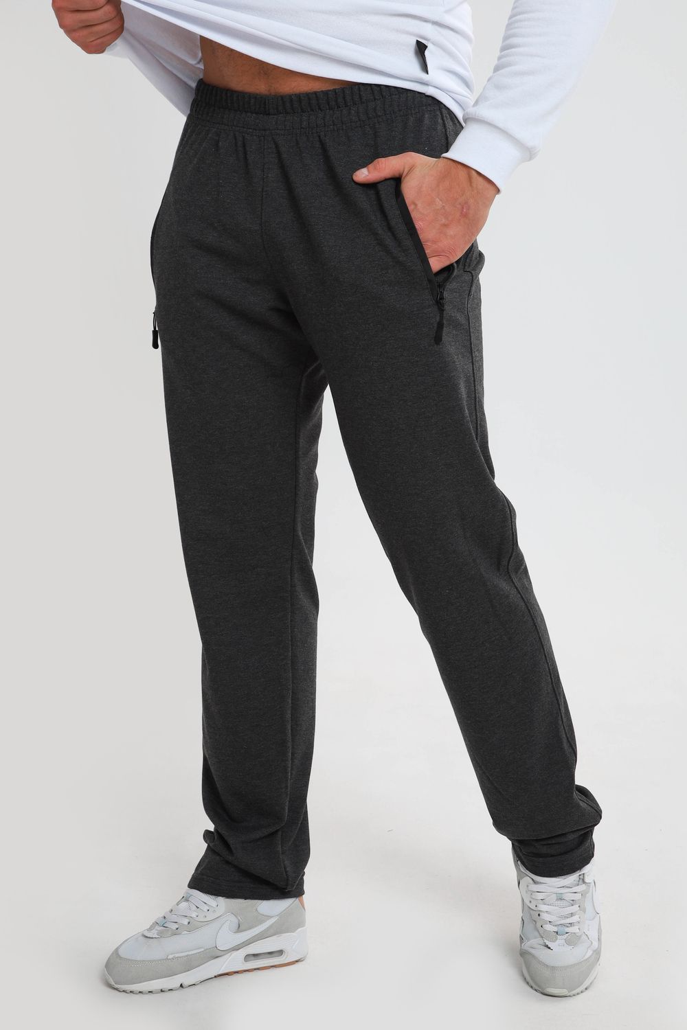 Мужские спортивные брюки прямого кроя, пояс на резинке - средняя посадка. Два боковых кармана на молнии с вставкой из плащевки. Материал держит форму, не скатывается. Подойдут для повседневной носки, для занятий спортом.