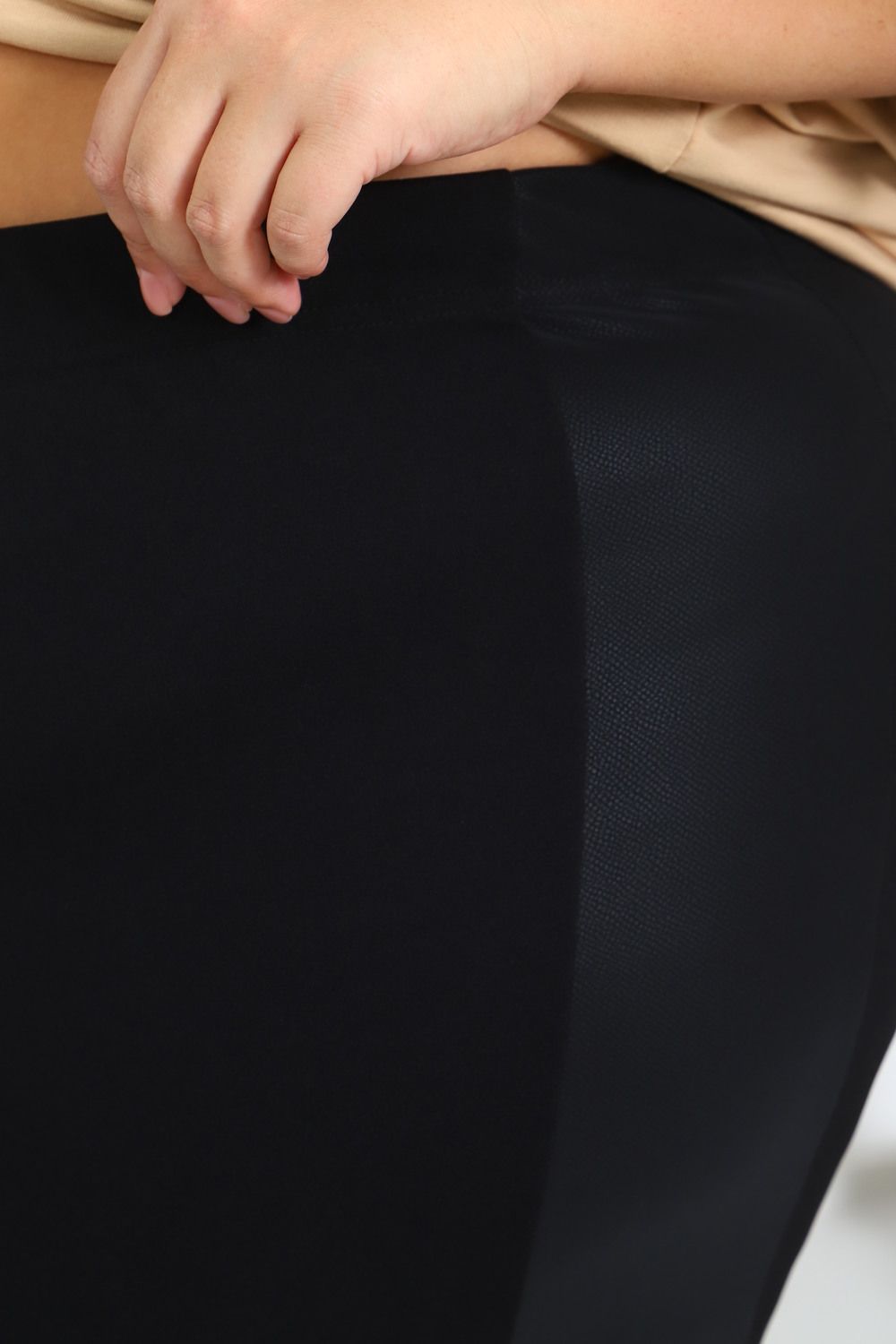 Модель полуприлегающего силуэта со вставками по бокам, низ на широком манжете, основная ткань-креп, вставка из эко-кожи. Брюки изготовлены из трикотажной ткани , которая хорошо тянется, удобна в носке, выдерживает многократные стирки. Замечательно сочетаются с любым верхом и обувью, подойдут и к классическому стилю, и к спортивному.
