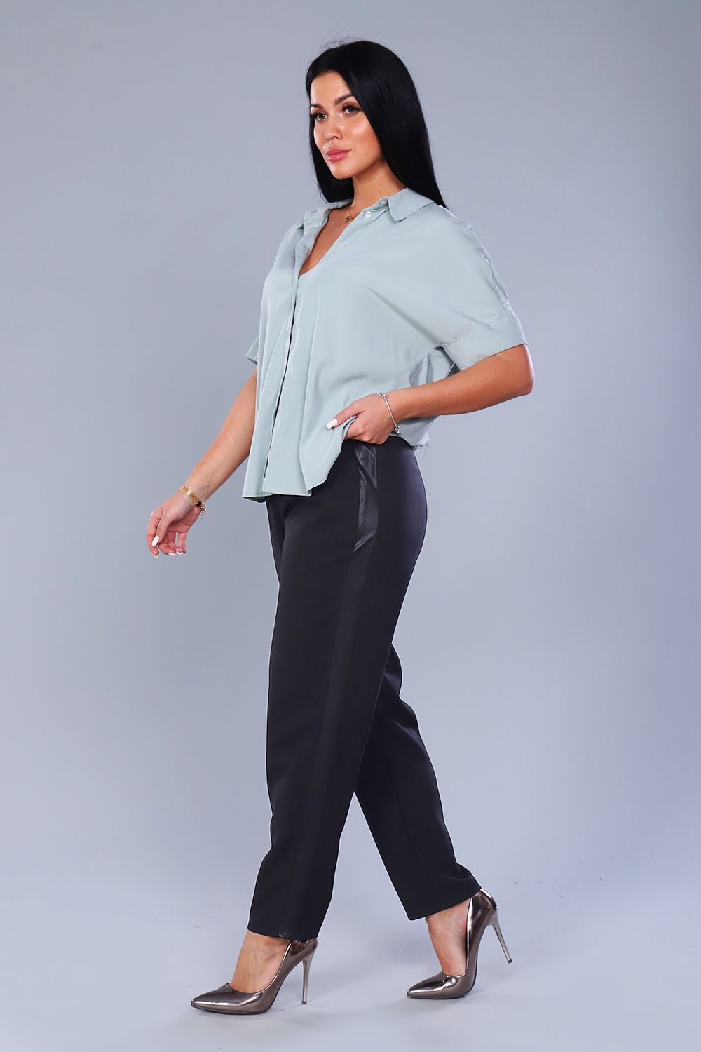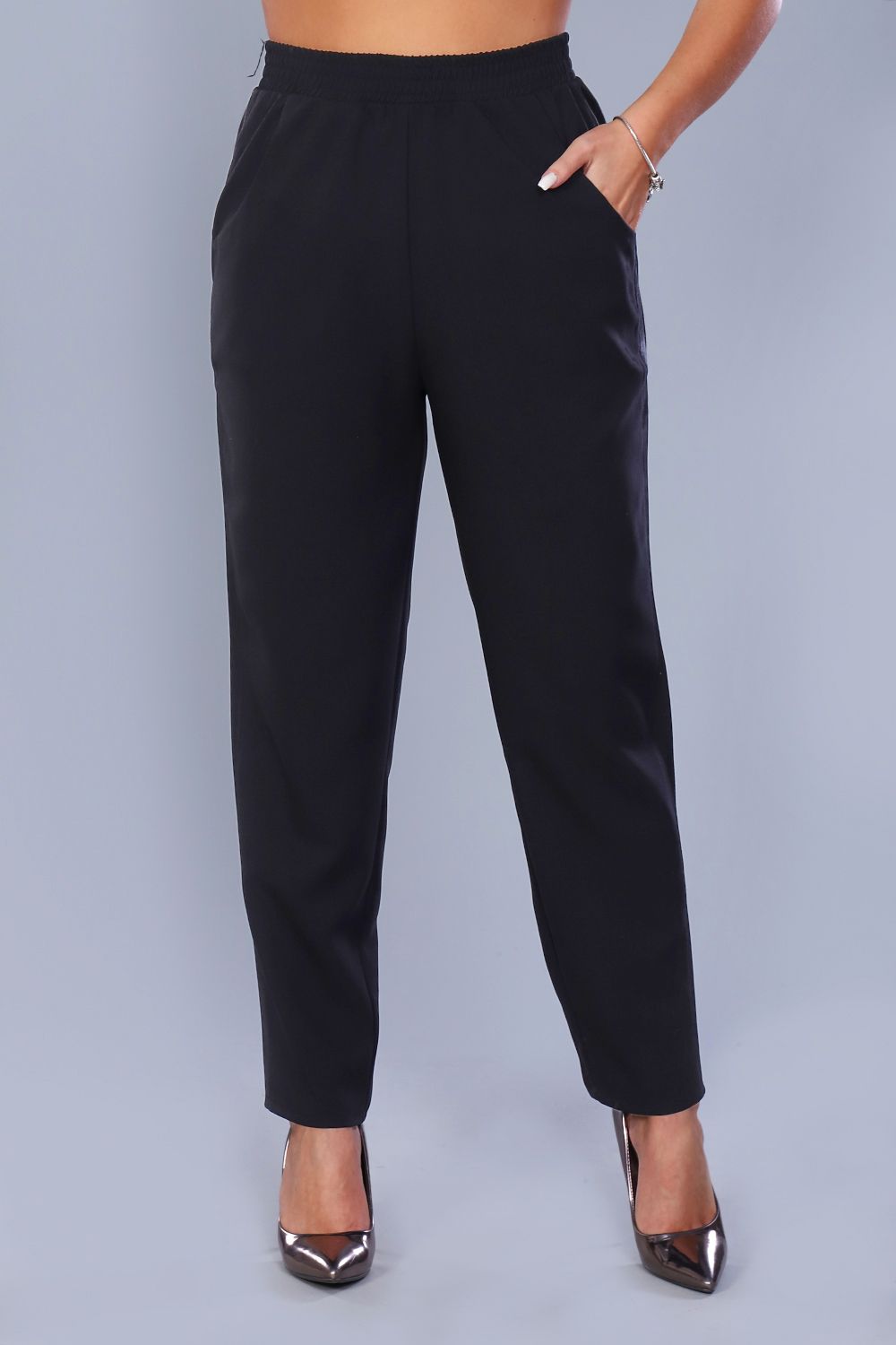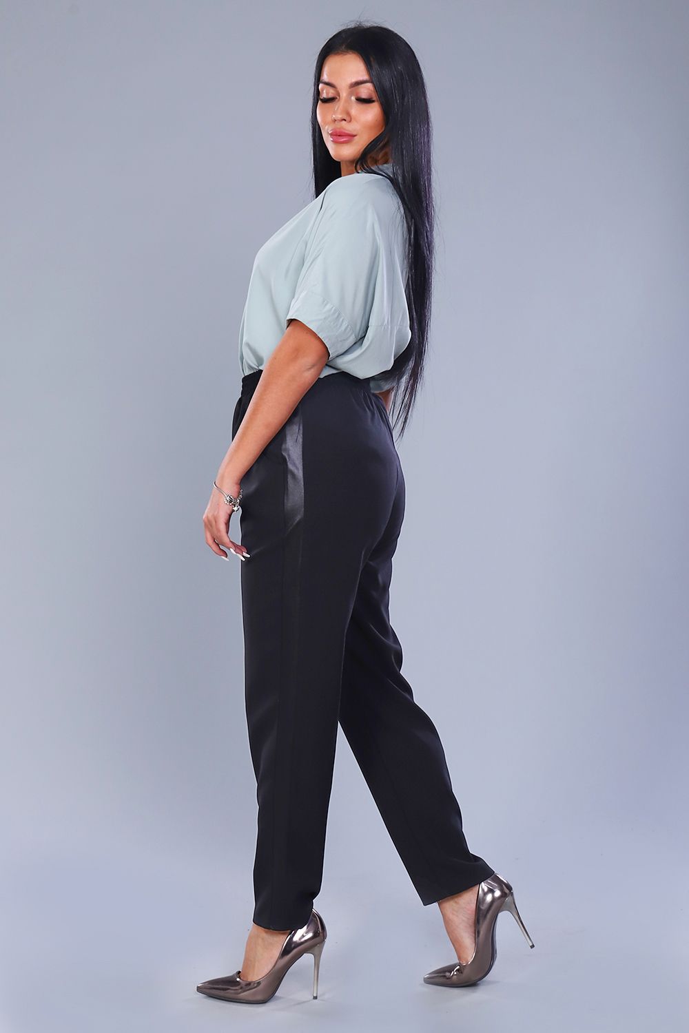 Классические черные брюки с лампасами из ткани - имитации кожи. Брюки будут актуальны практически везде: работа, деловая встреча, прогулка, торжественный случай, смотря с каким верхом их комбинировать. Благодаря высокой посадке и широкому поясу на резинке, изделие хорошо сядет на любую фигуру. Брюки заужены книзу, по бокам внутренние карманы. Ширина лампаса - 3,5 см. В замерах объем талии соответствует длине пояса в растянутом виде.